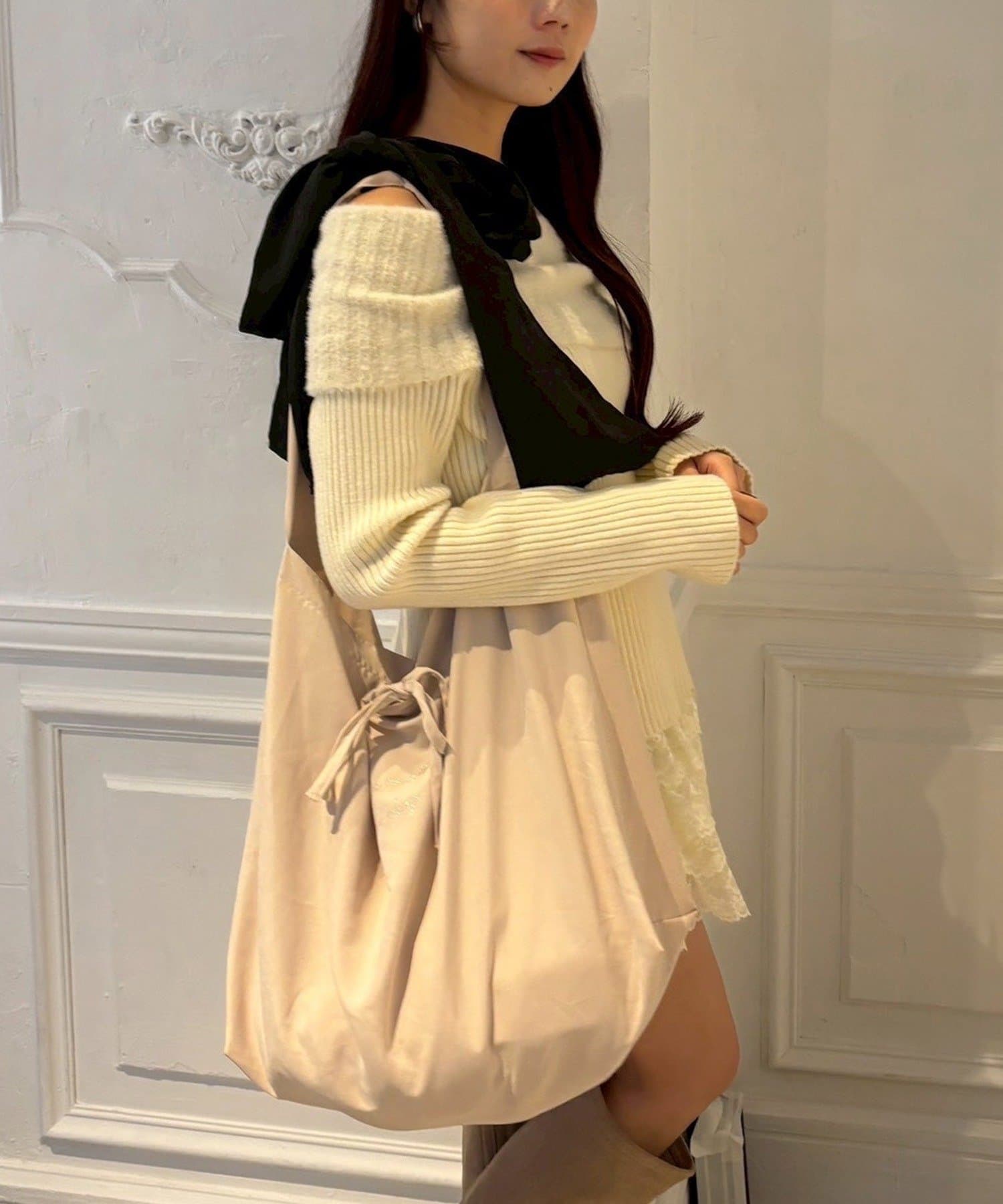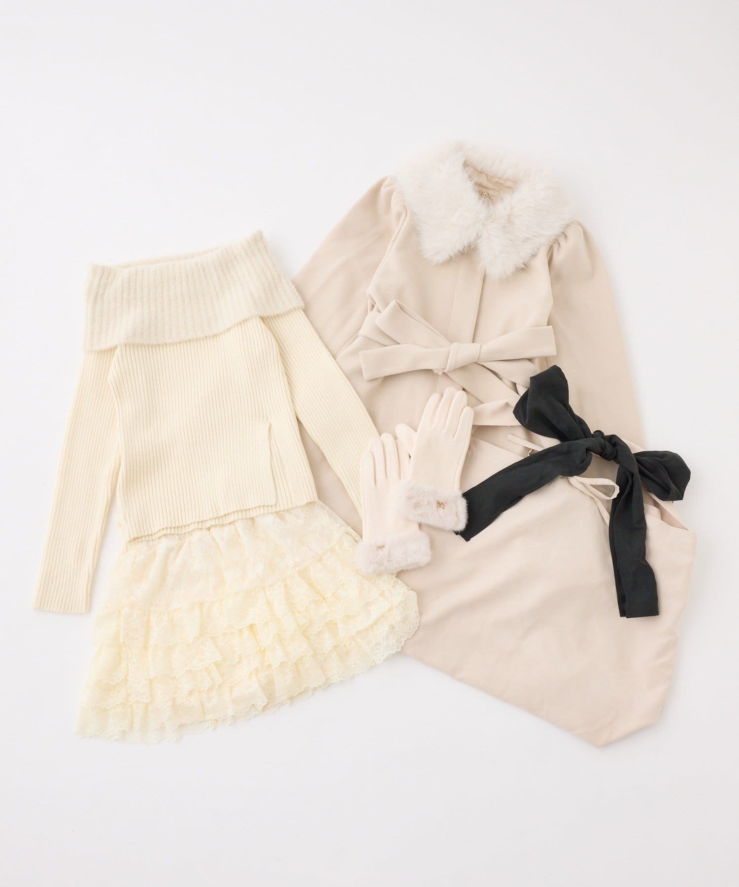 ミドルコート、オフショルニット、レーススカート、手袋、トートバッグの5点セットで登場♪