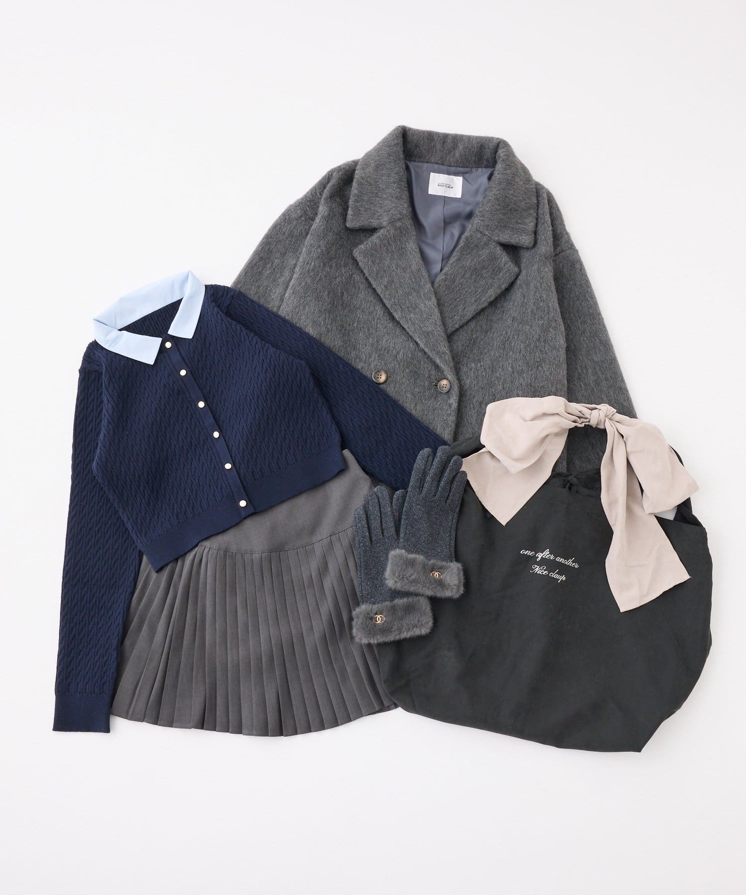 ミドルコート、レイヤーニット、プリーツスカート、手袋、トートバッグの5点セットで登場♪