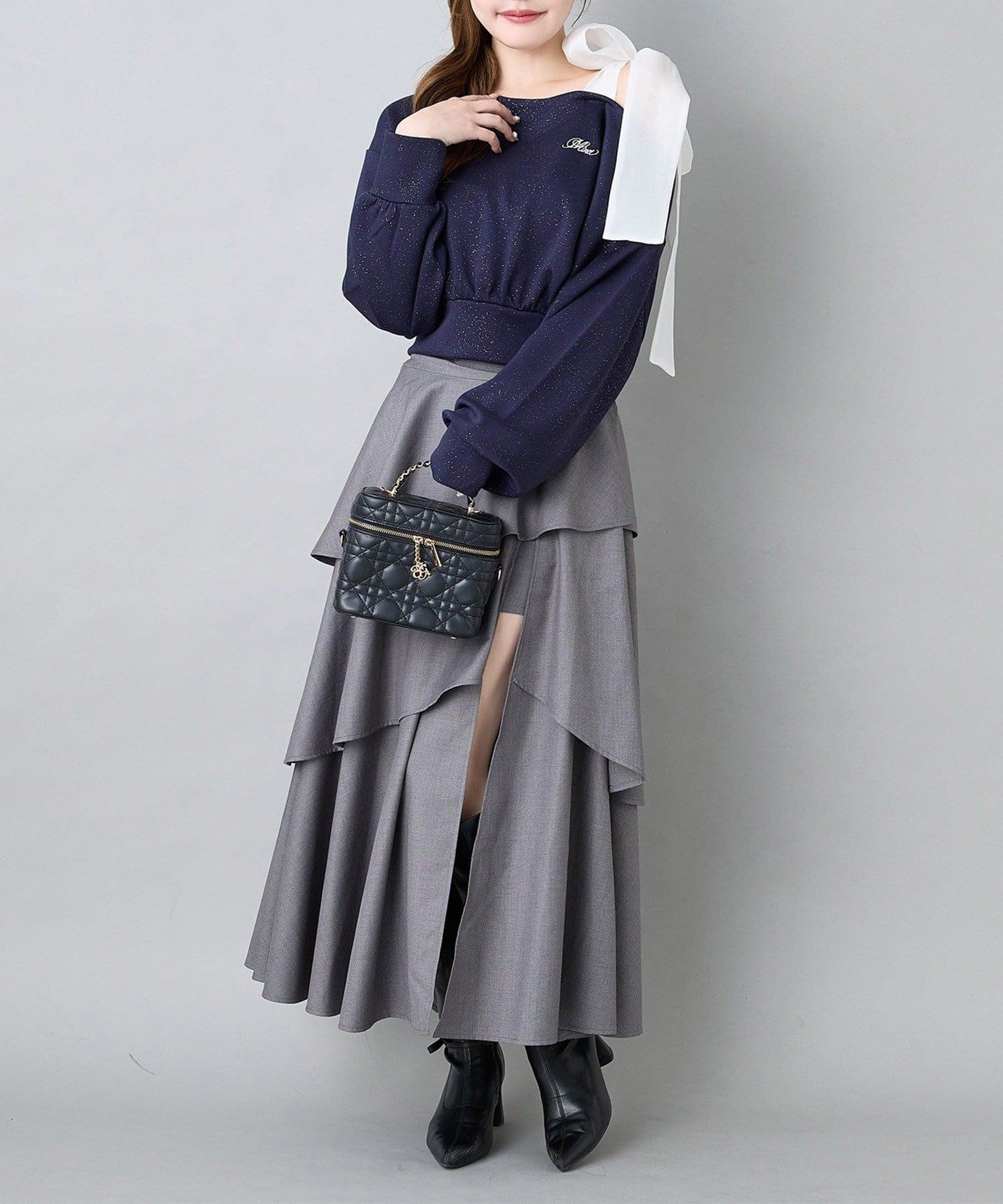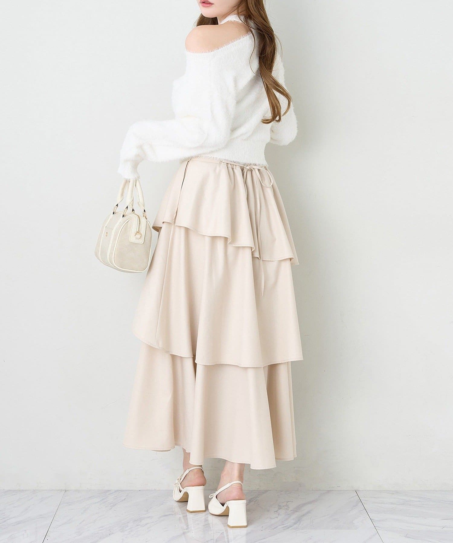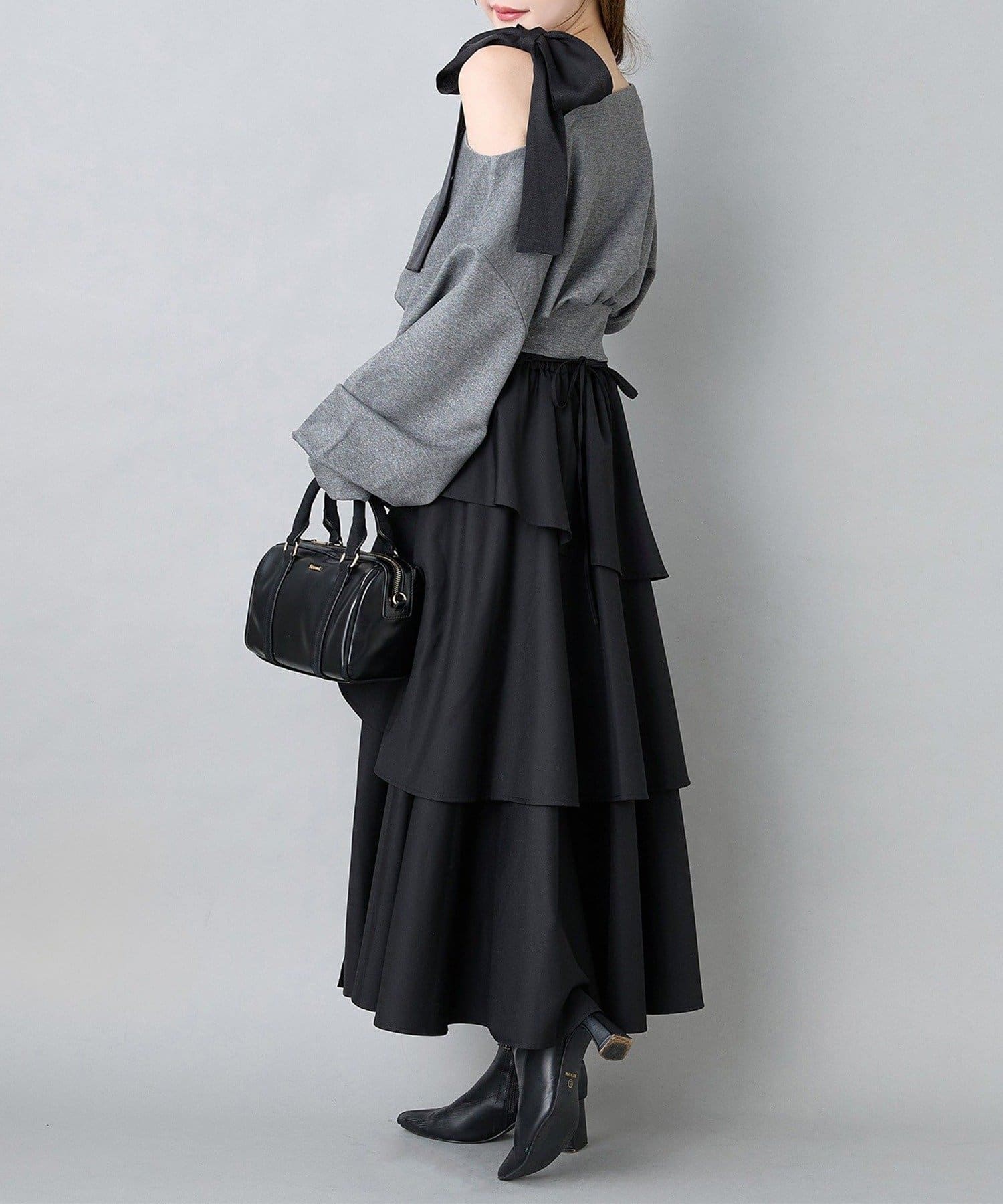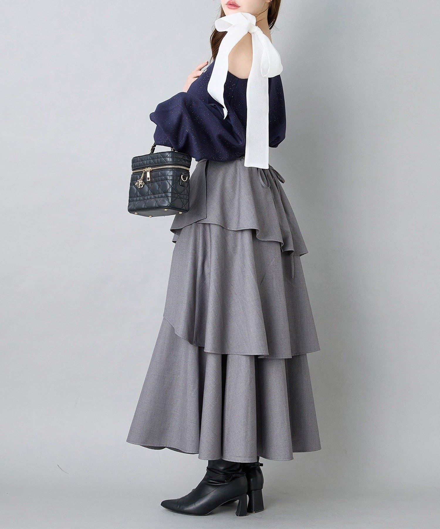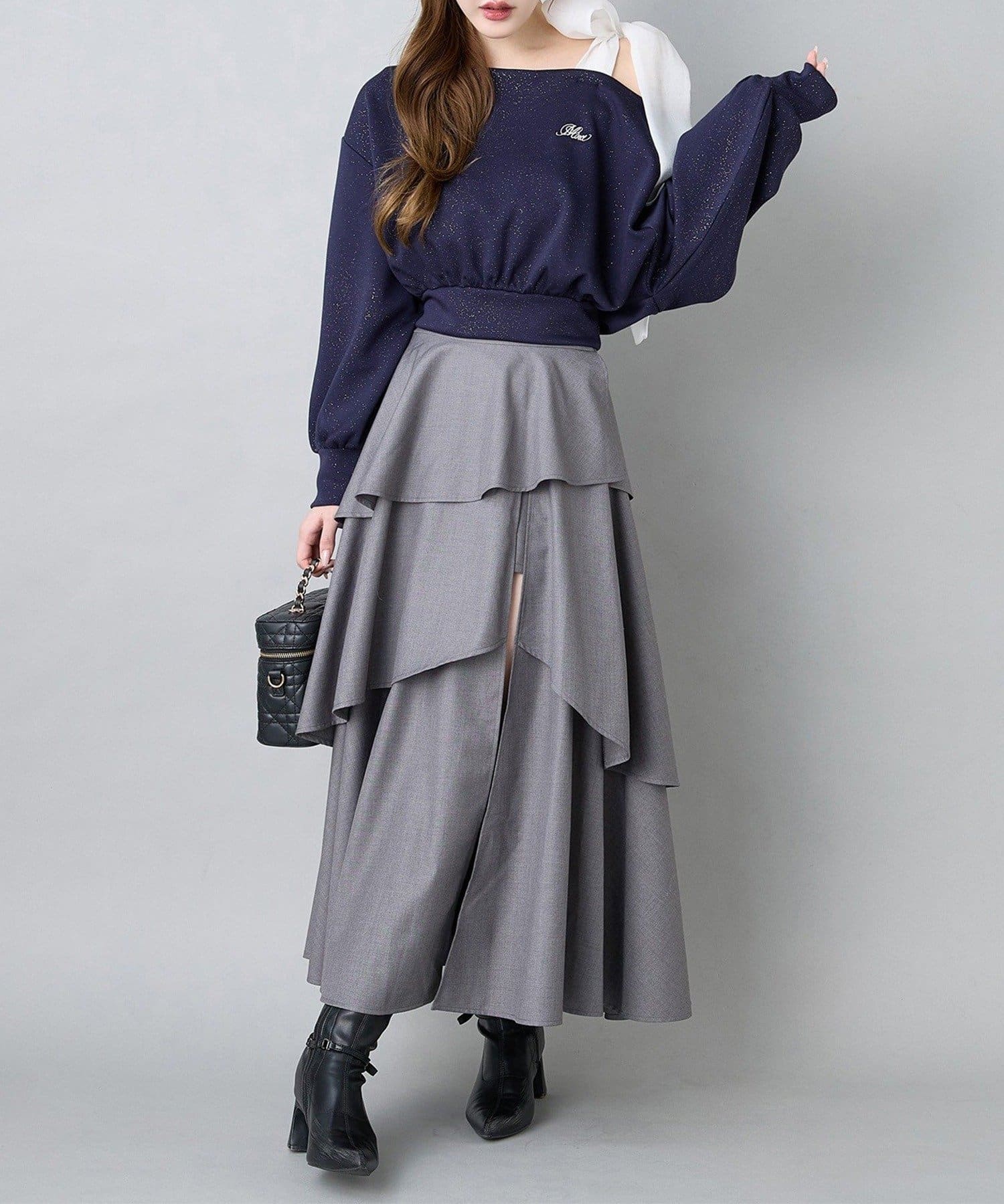 ふんわりとしたティアードシルエットに、フロントスリットをプラスした大人可愛いロングスカート。