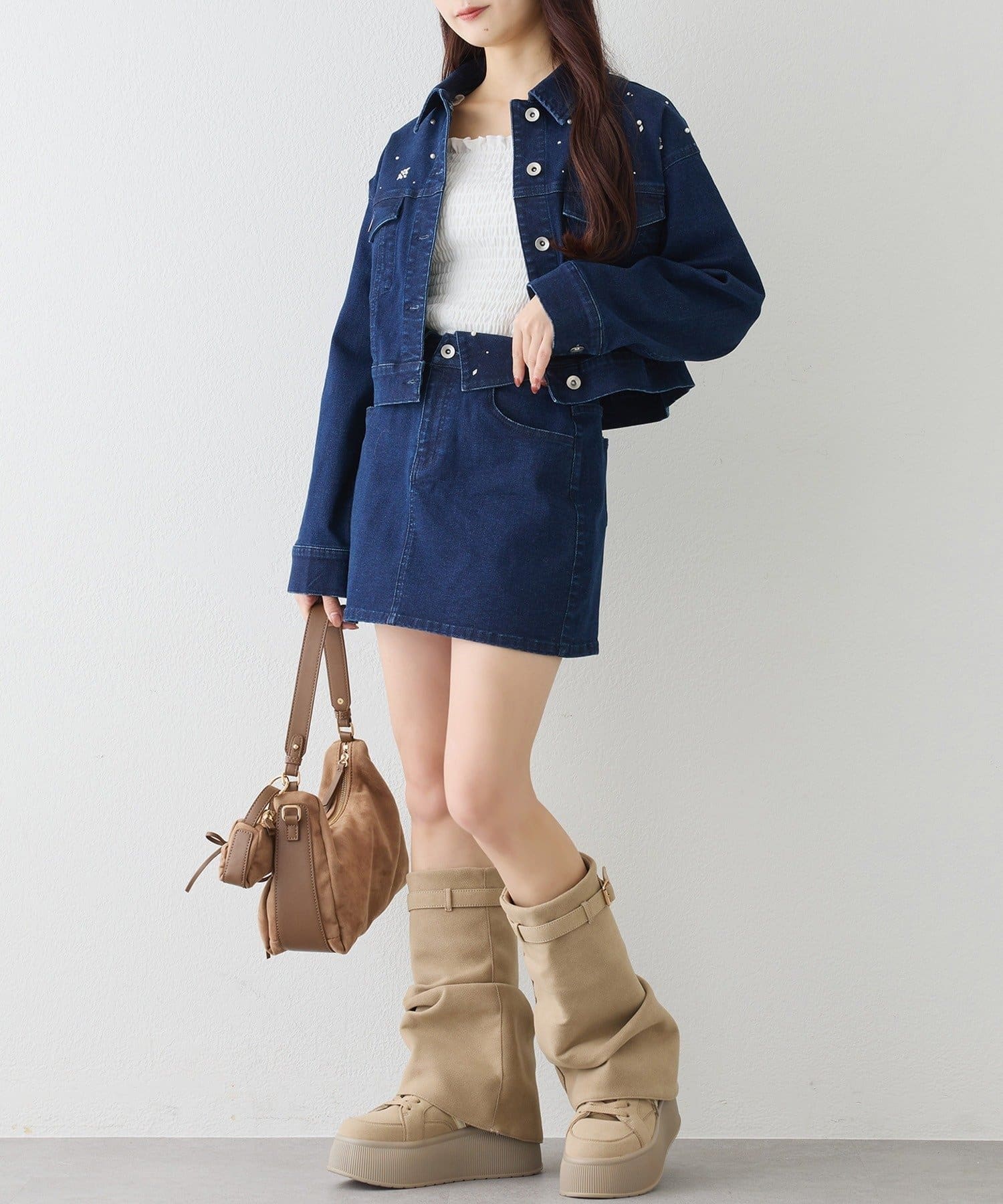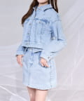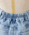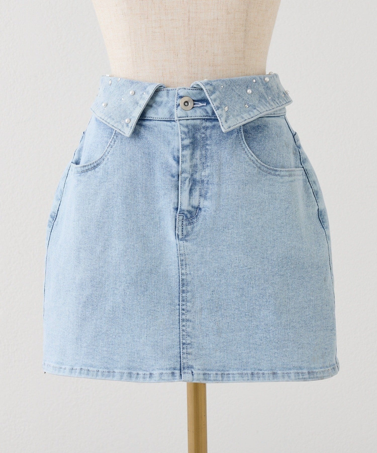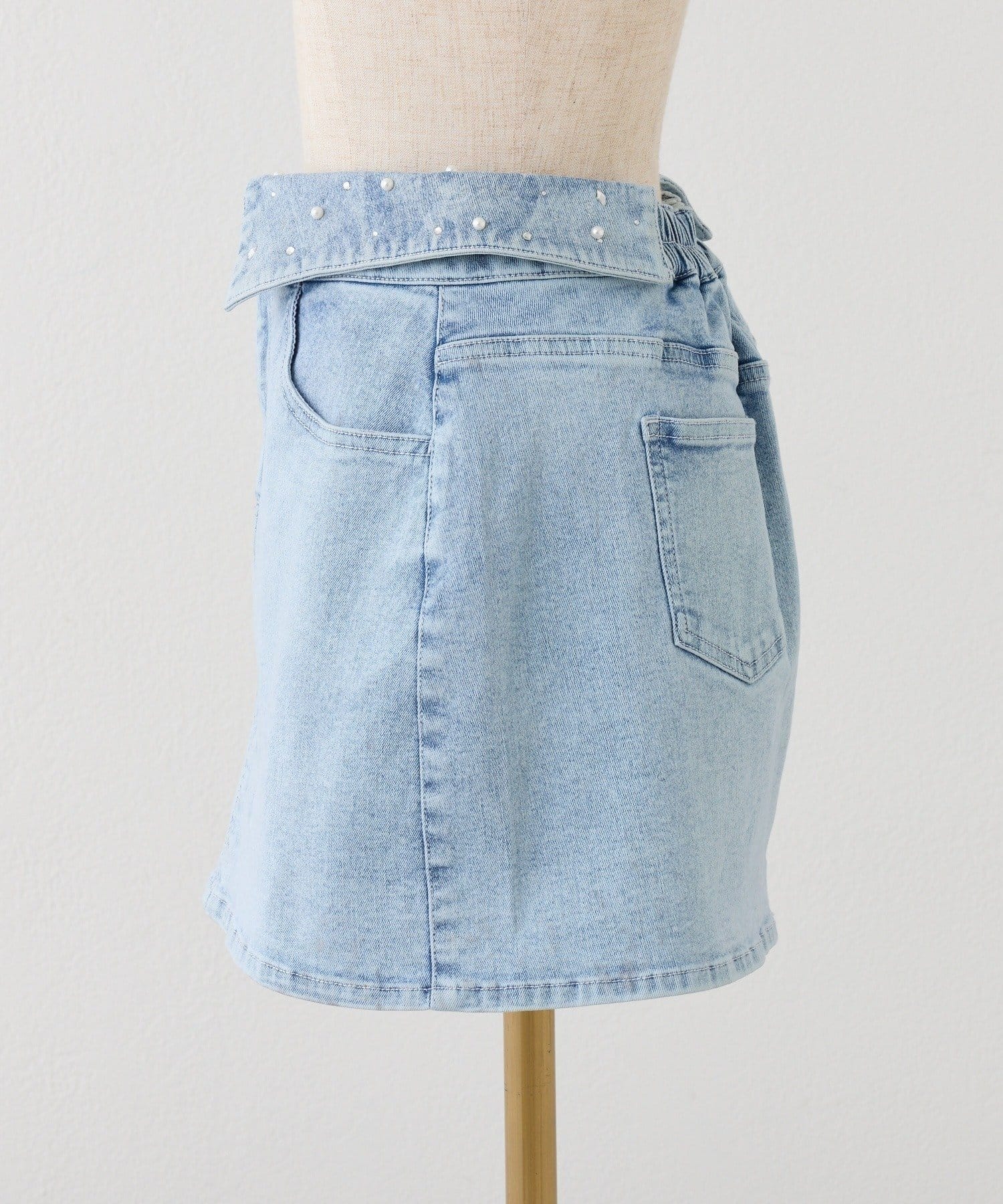 ウエストの折り返しデザインが目を惹く、トレンド感たっぷりのデニムミニスカート。