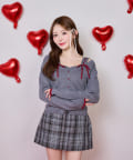 コンパクトニットやオフショルトップスを合わせてフェミニンに