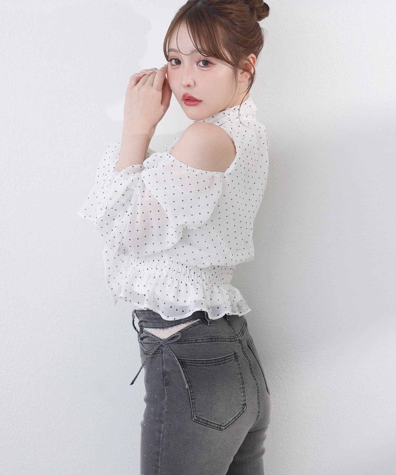 ウエストサイドオープンデザイン&レース付きで抜け感をプラスしつつ、リボンディテールでガーリーなアクセントをON。