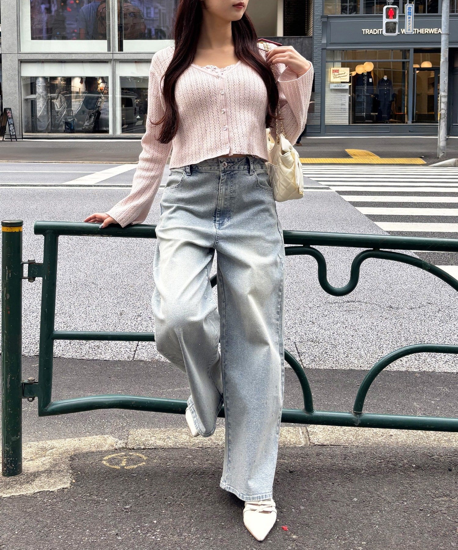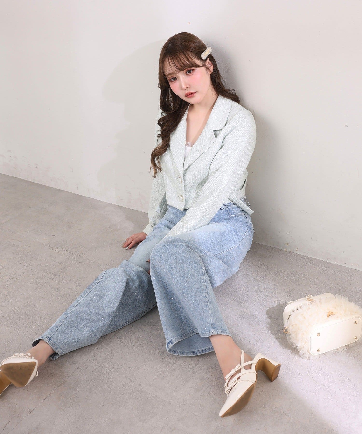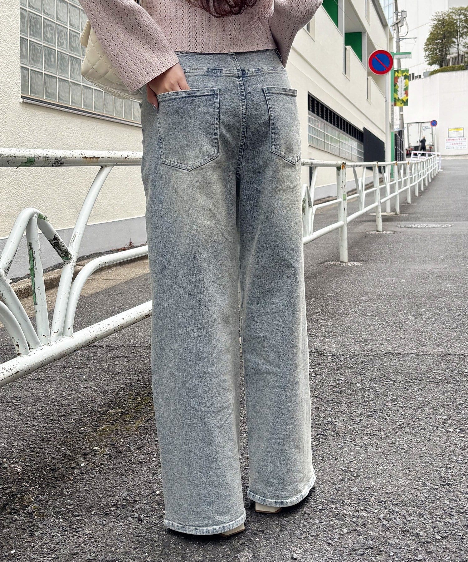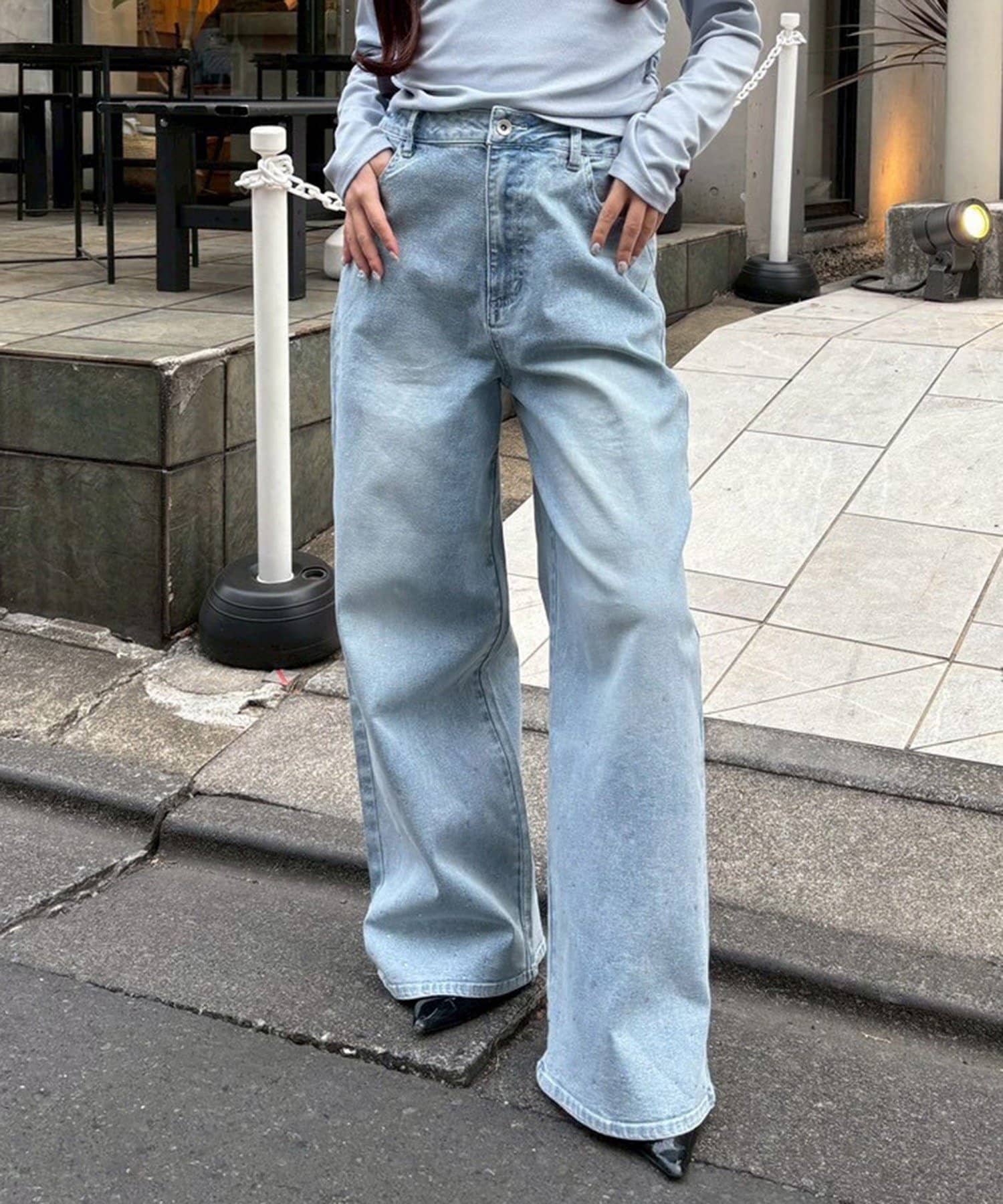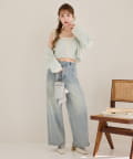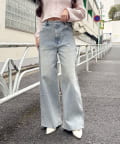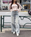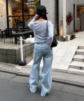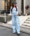 全体的にゆったりとしたシルエットのストレートデニムは、華奢見せ効果も。