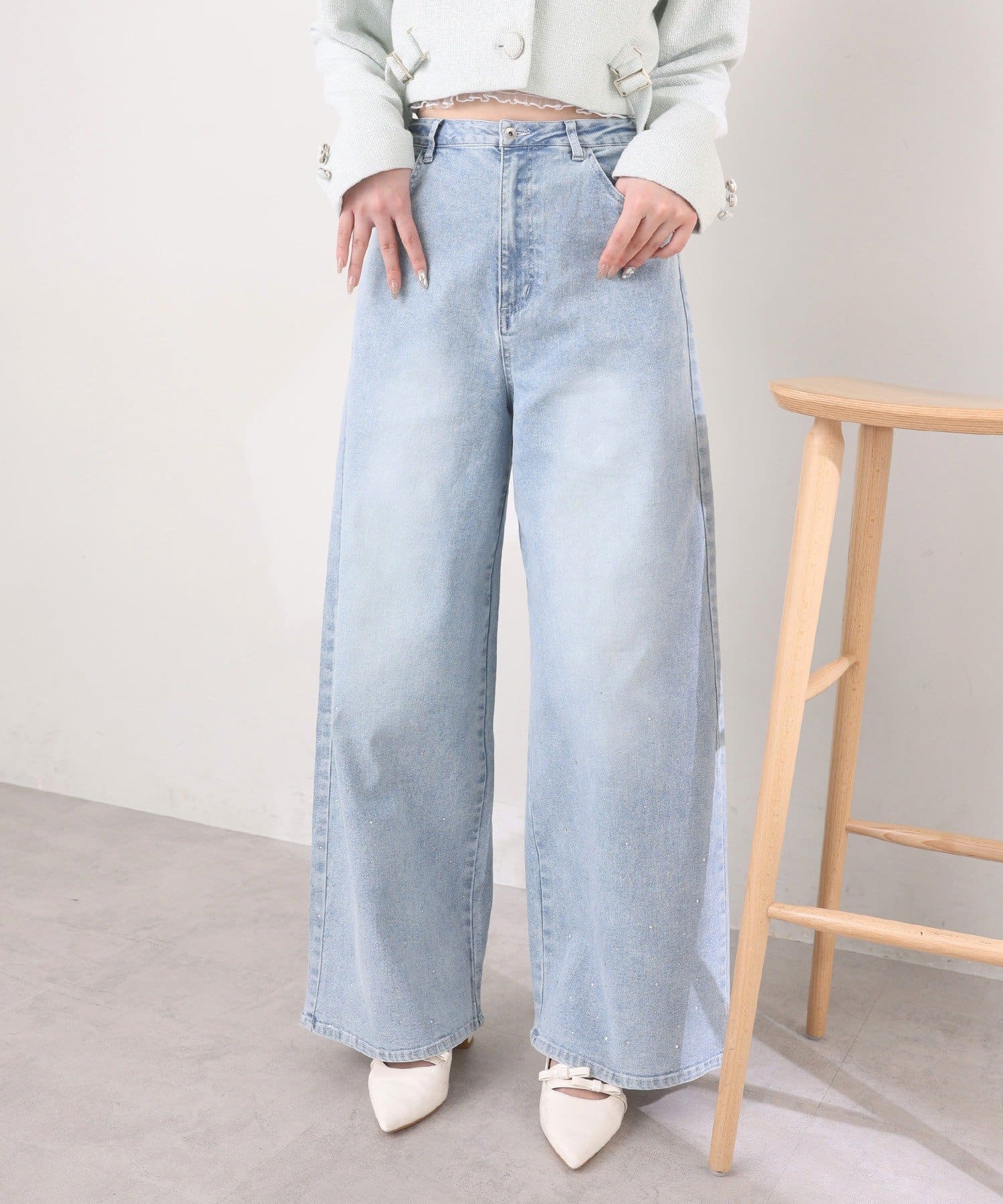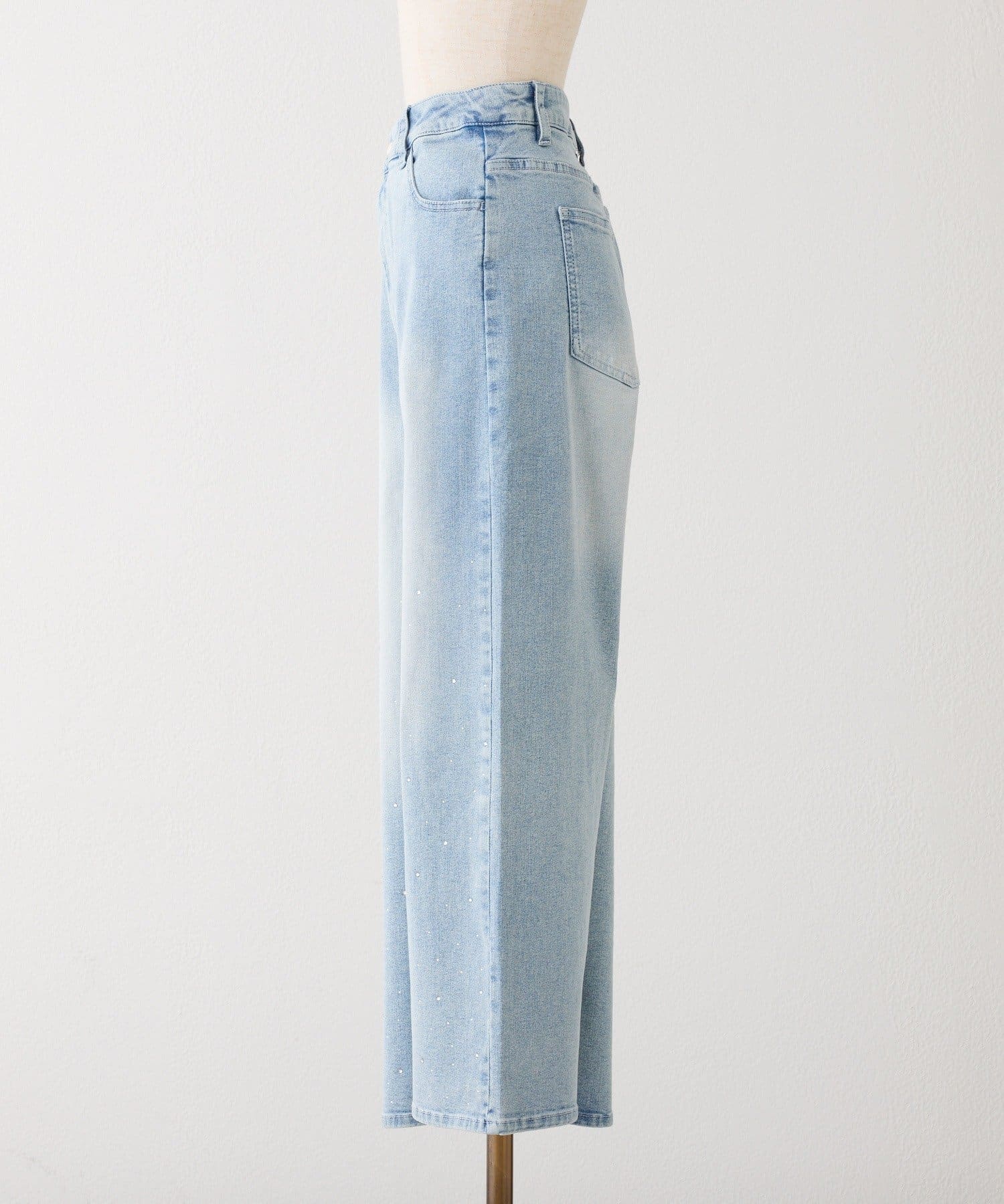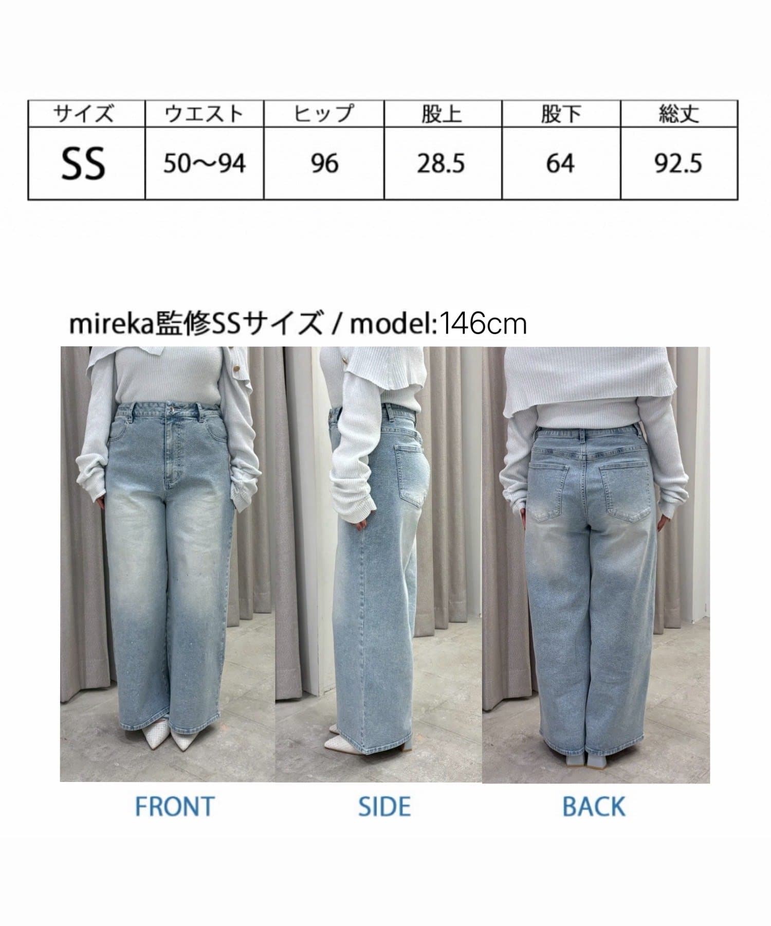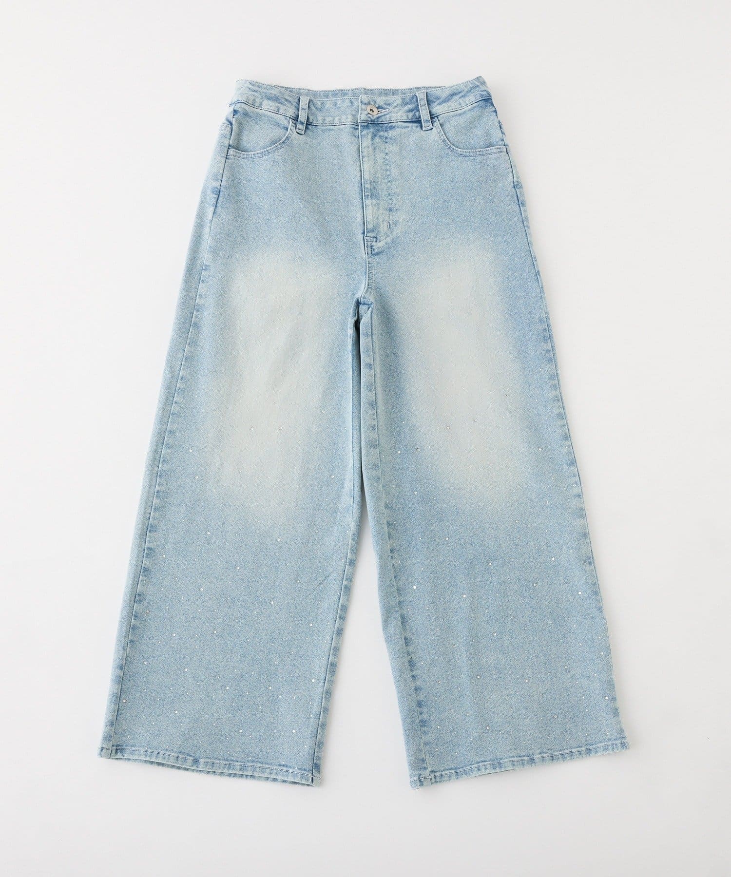 【SSサイズあり/ウエスト調整可能】ビジュー付きワイドデニム