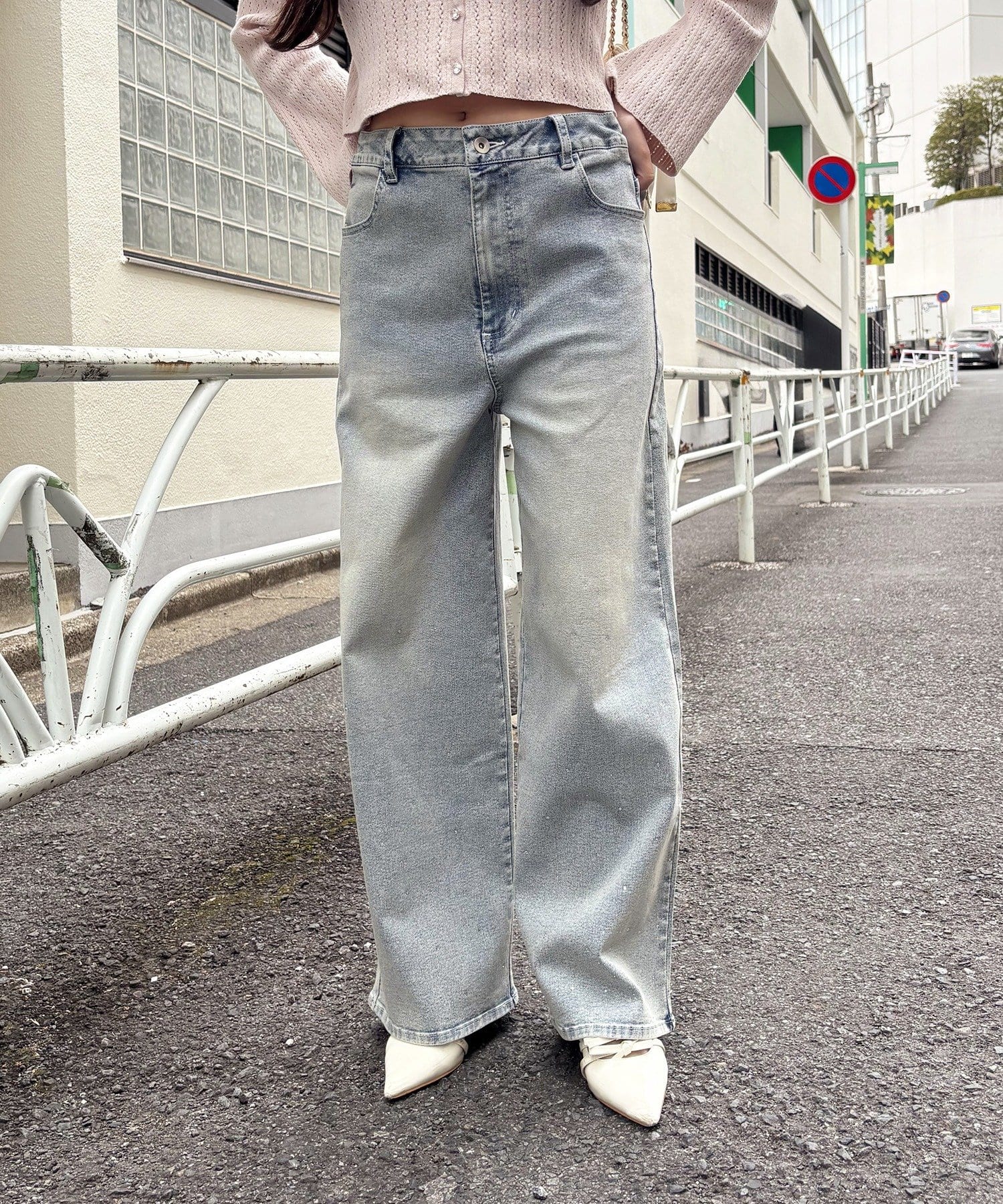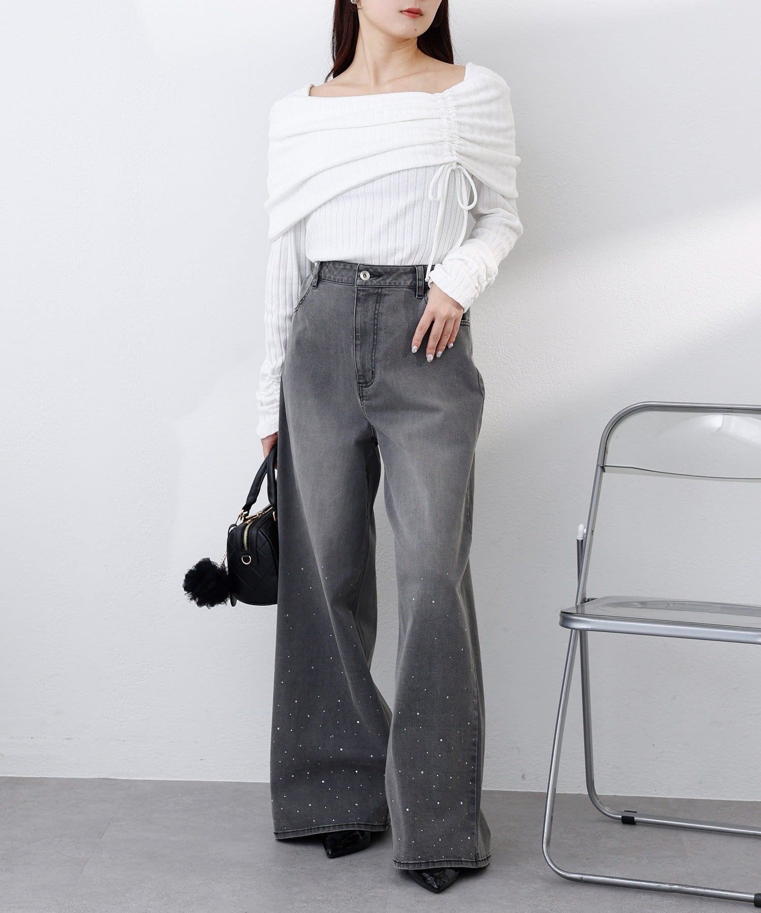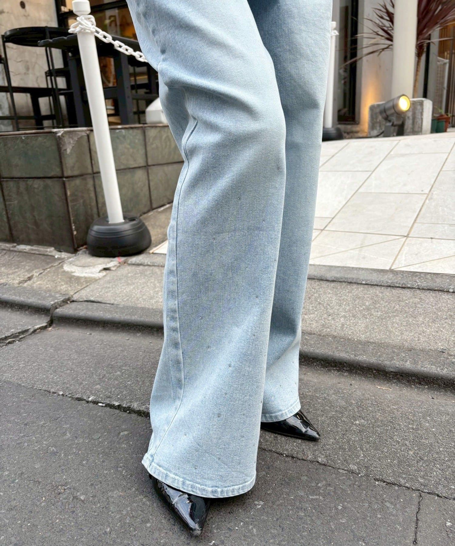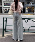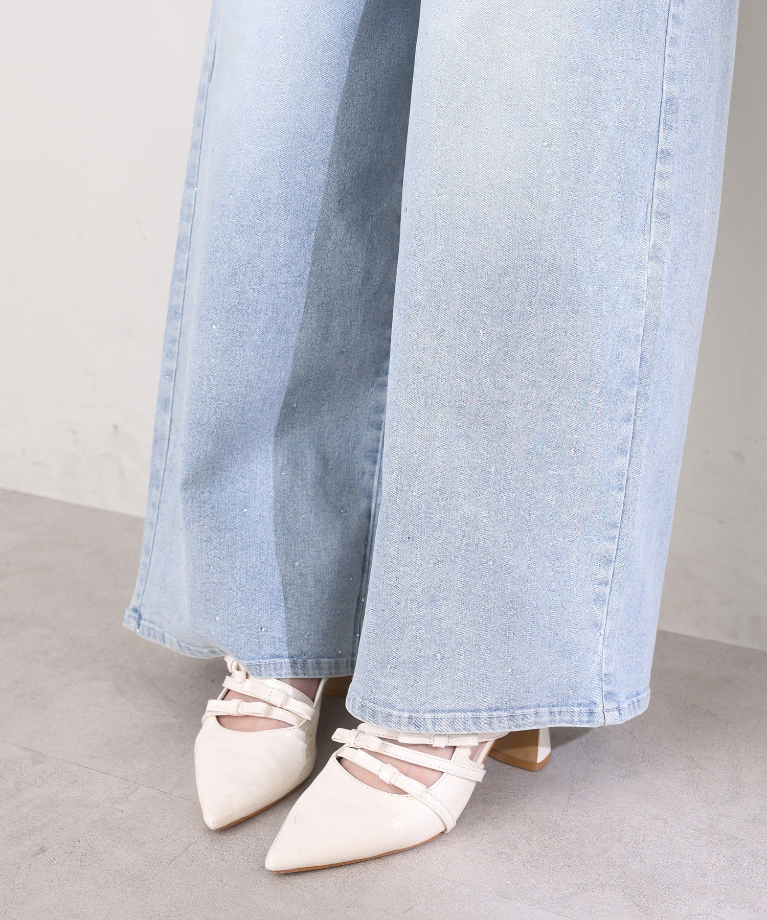 【SSサイズあり/ウエスト調整可能】ビジュー付きワイドデニム