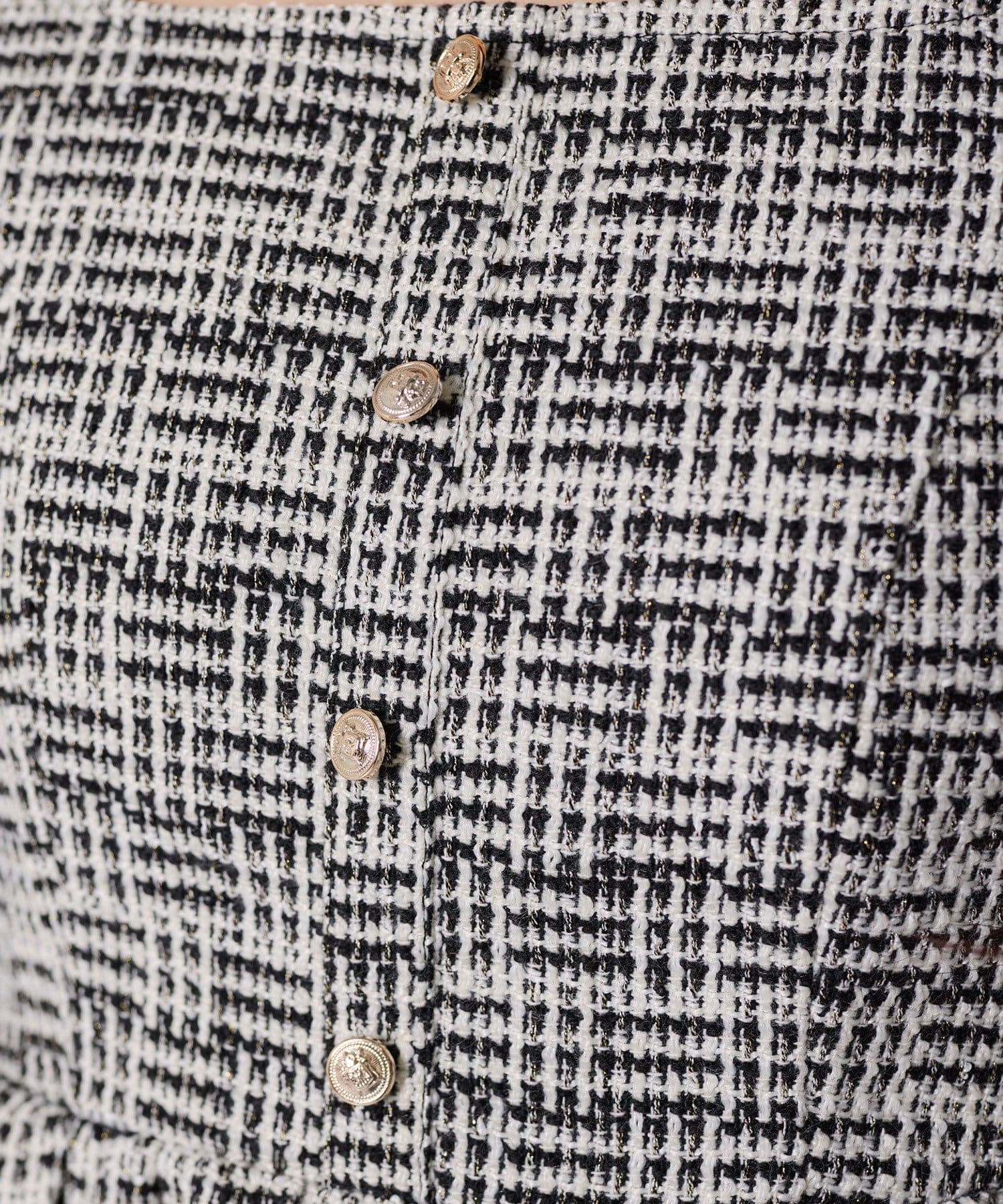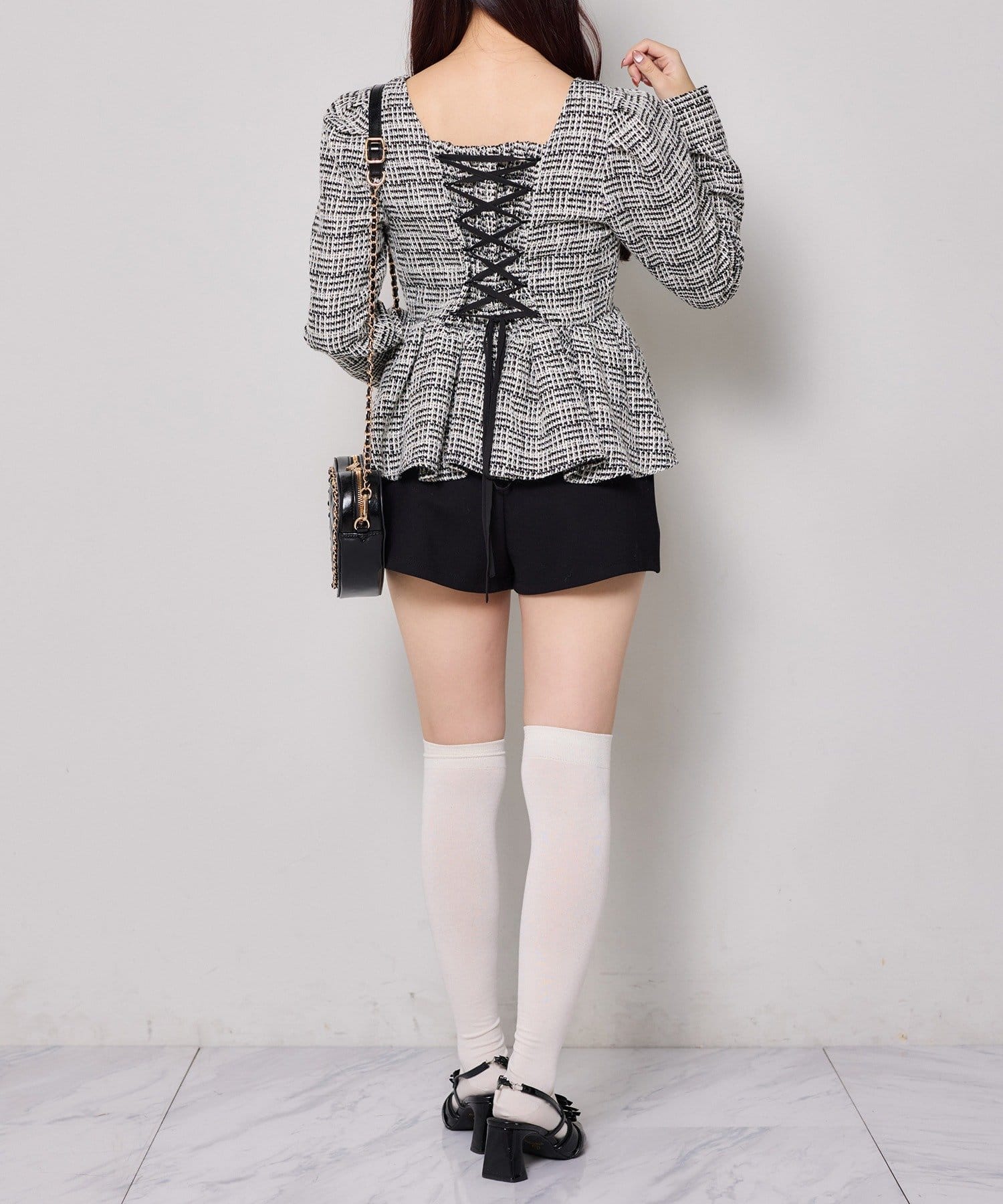 上品なツイード素材を使用した、華やかさたっぷりのペプラムブラウス。