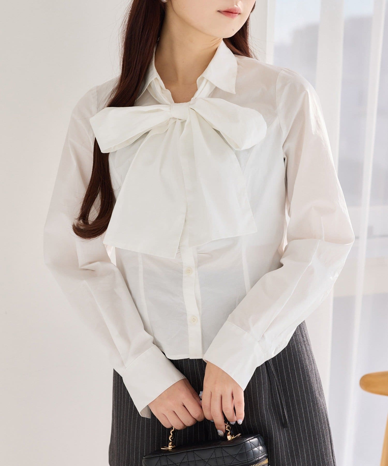 テーラードジャケットに合わせたり、ニットを合わせてリボンのみチラ見せしても可愛く着こなせます。