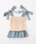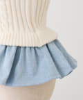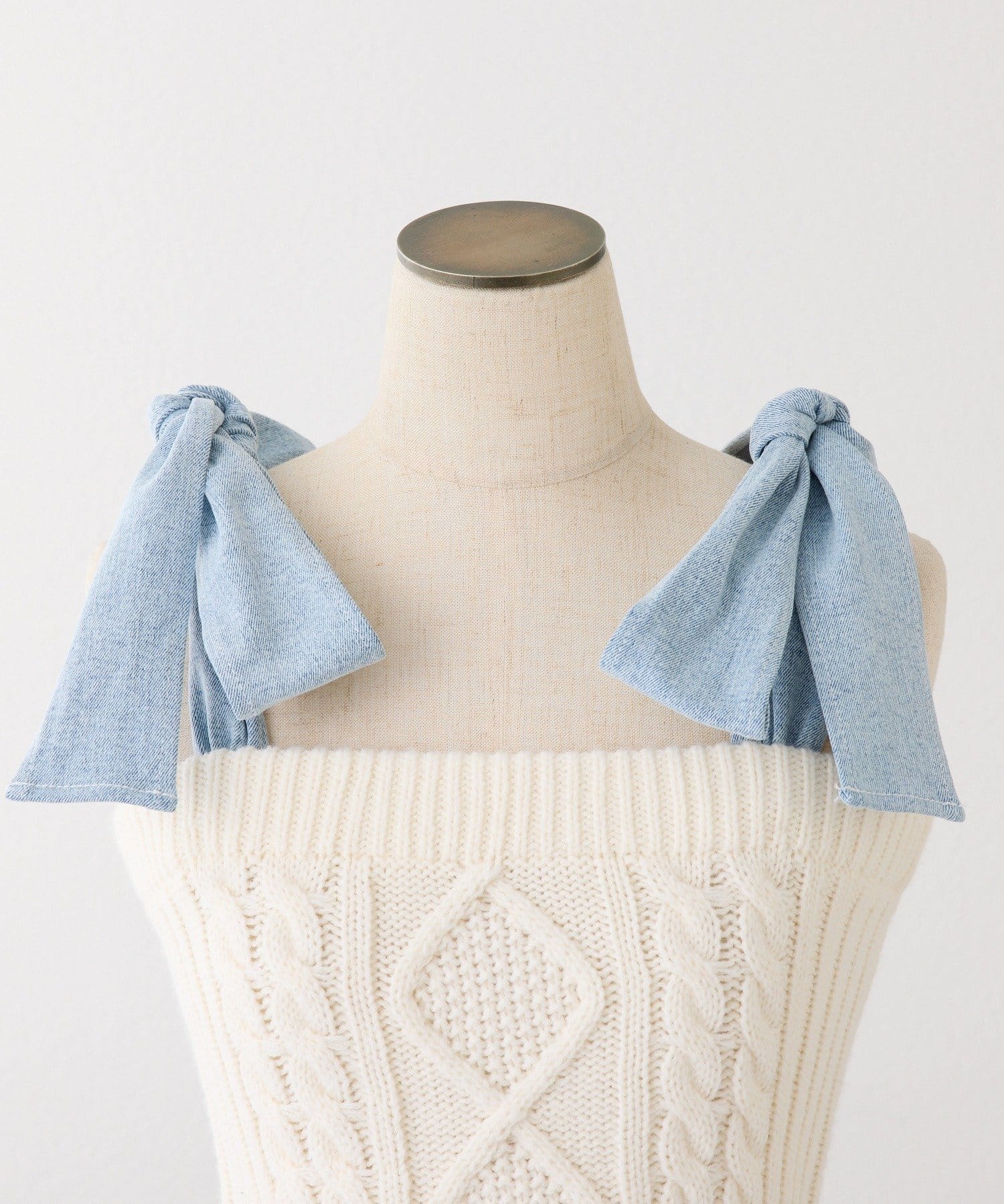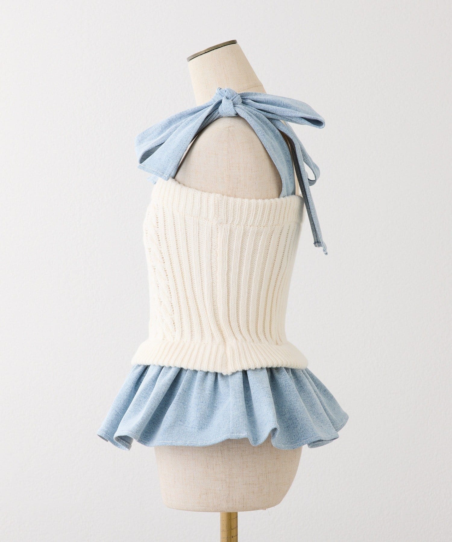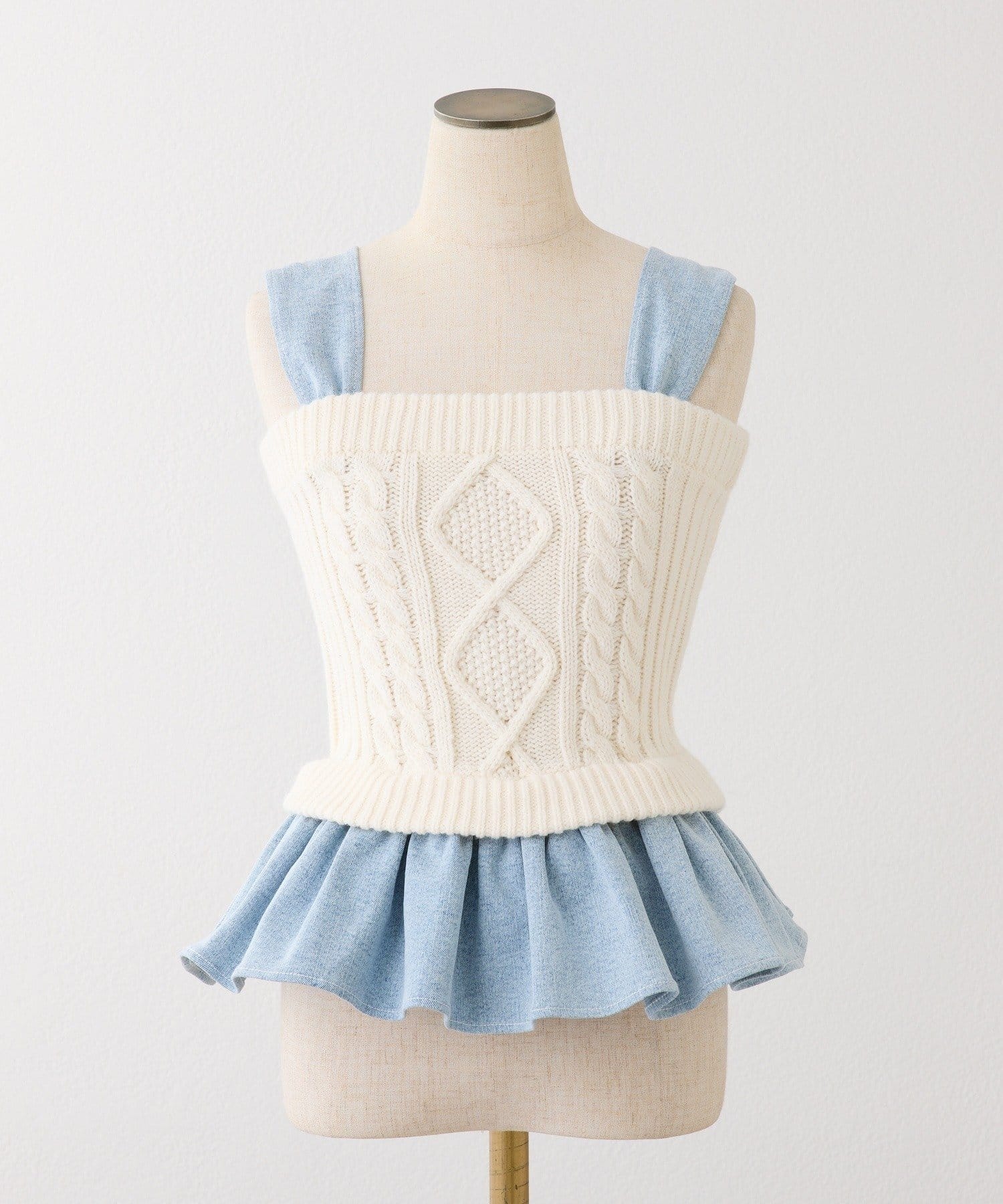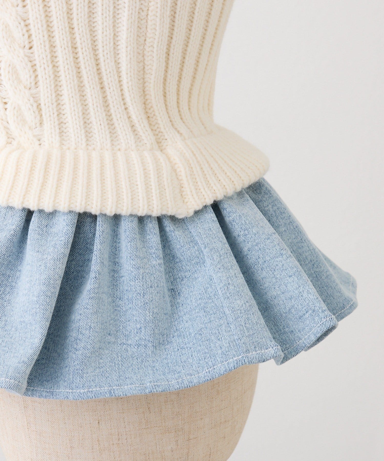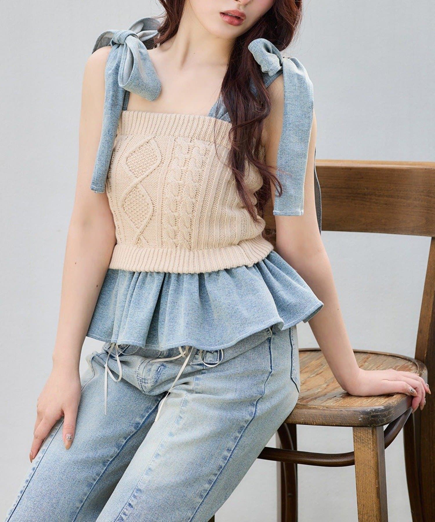 身ごろはケーブル編みニット、肩リボンと裾フリルにはデニム素材を使用した、異素材ミックスが可愛いビスチェ。