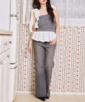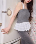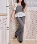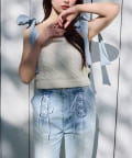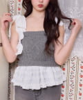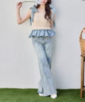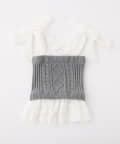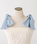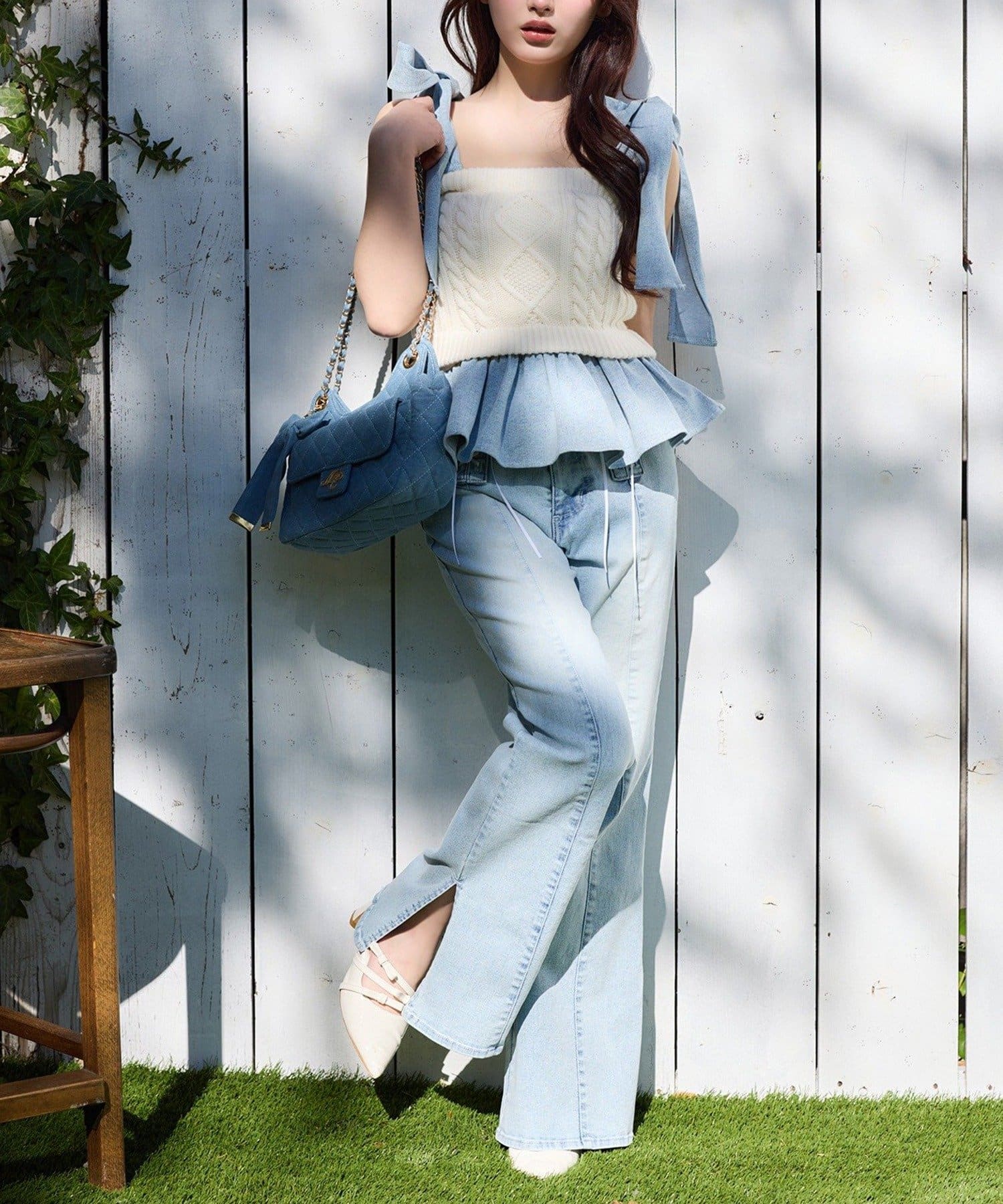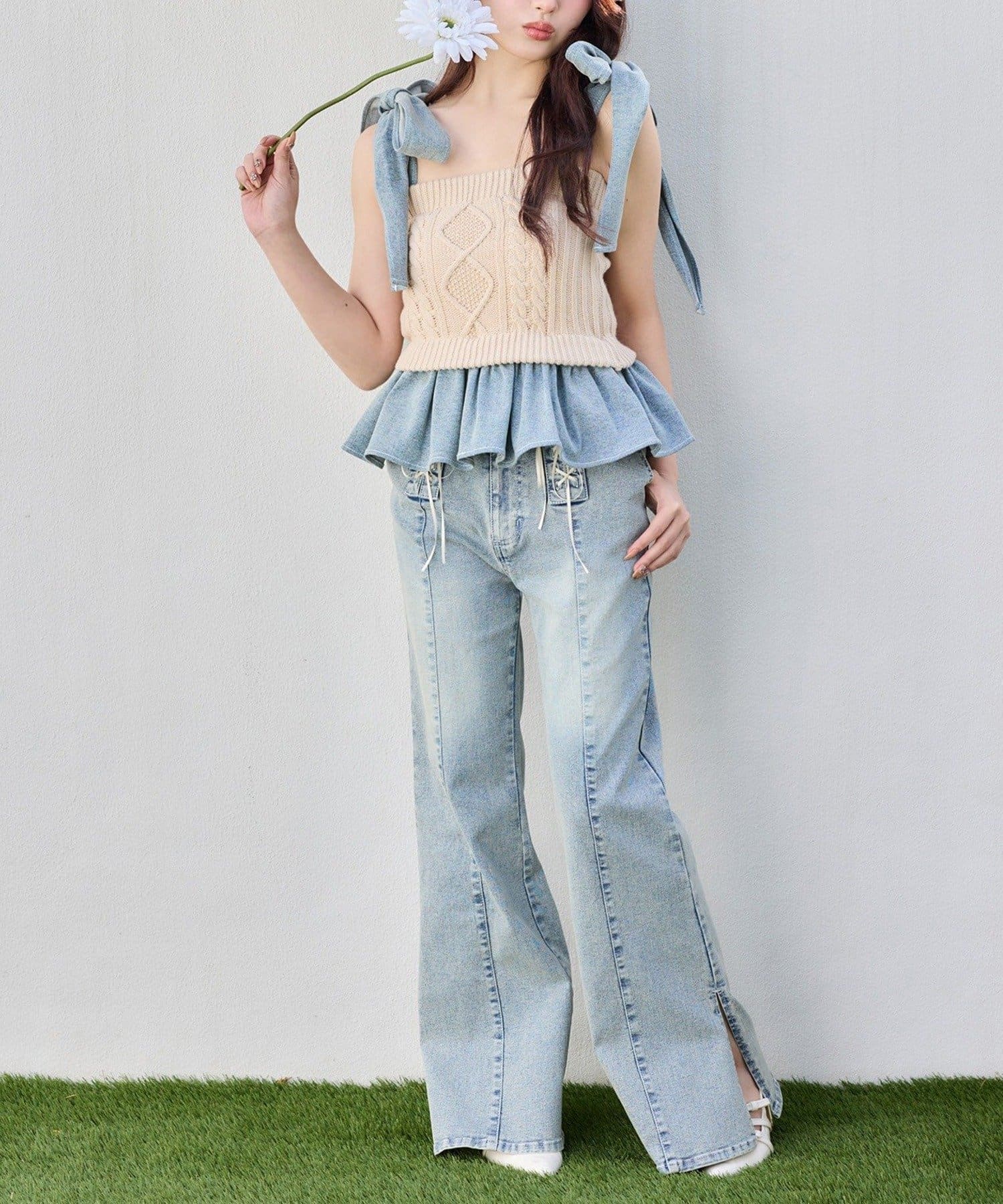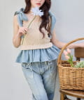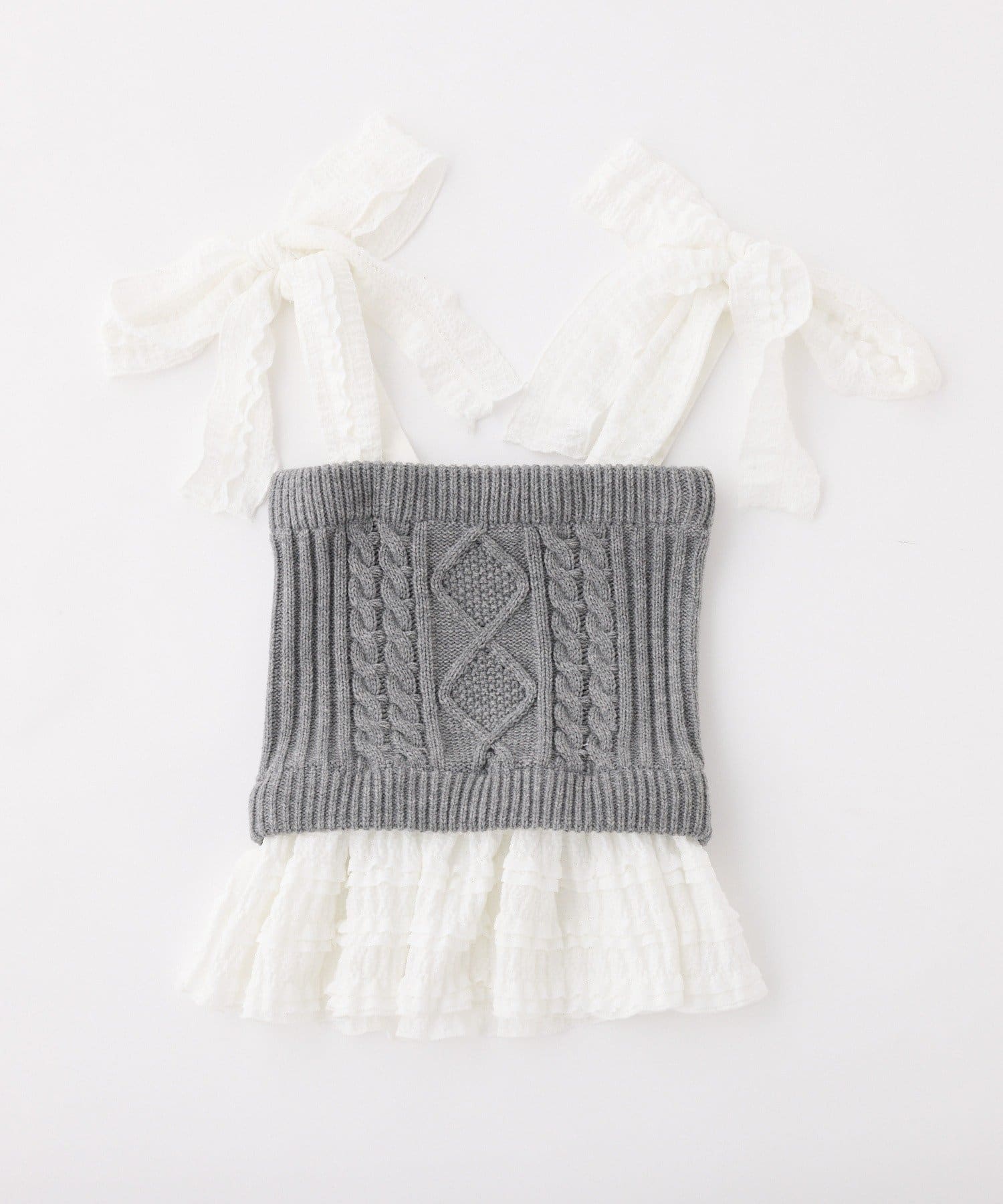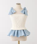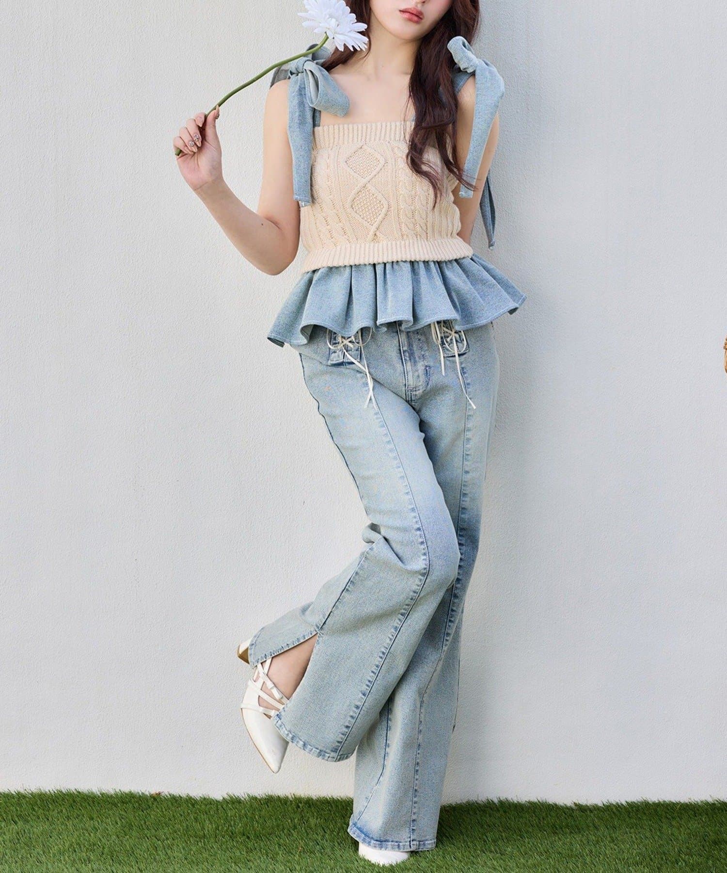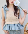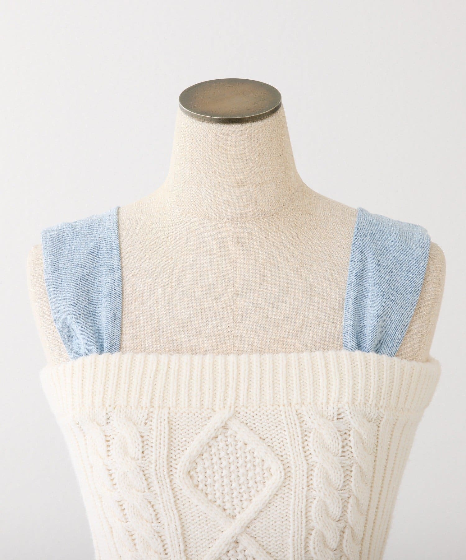 身ごろはケーブル編みニット、肩リボンと裾フリルにはデニム素材を使用した、異素材ミックスが可愛いビスチェ。