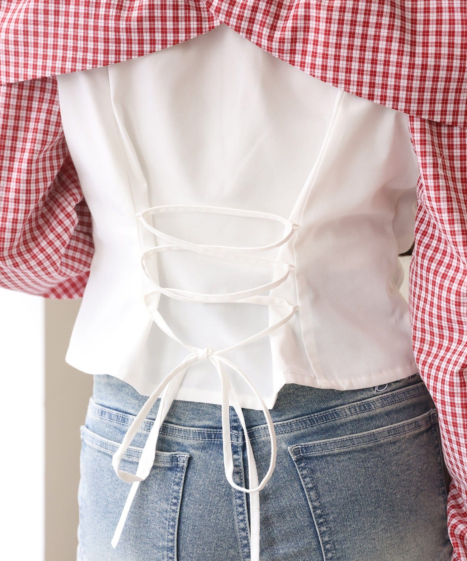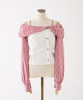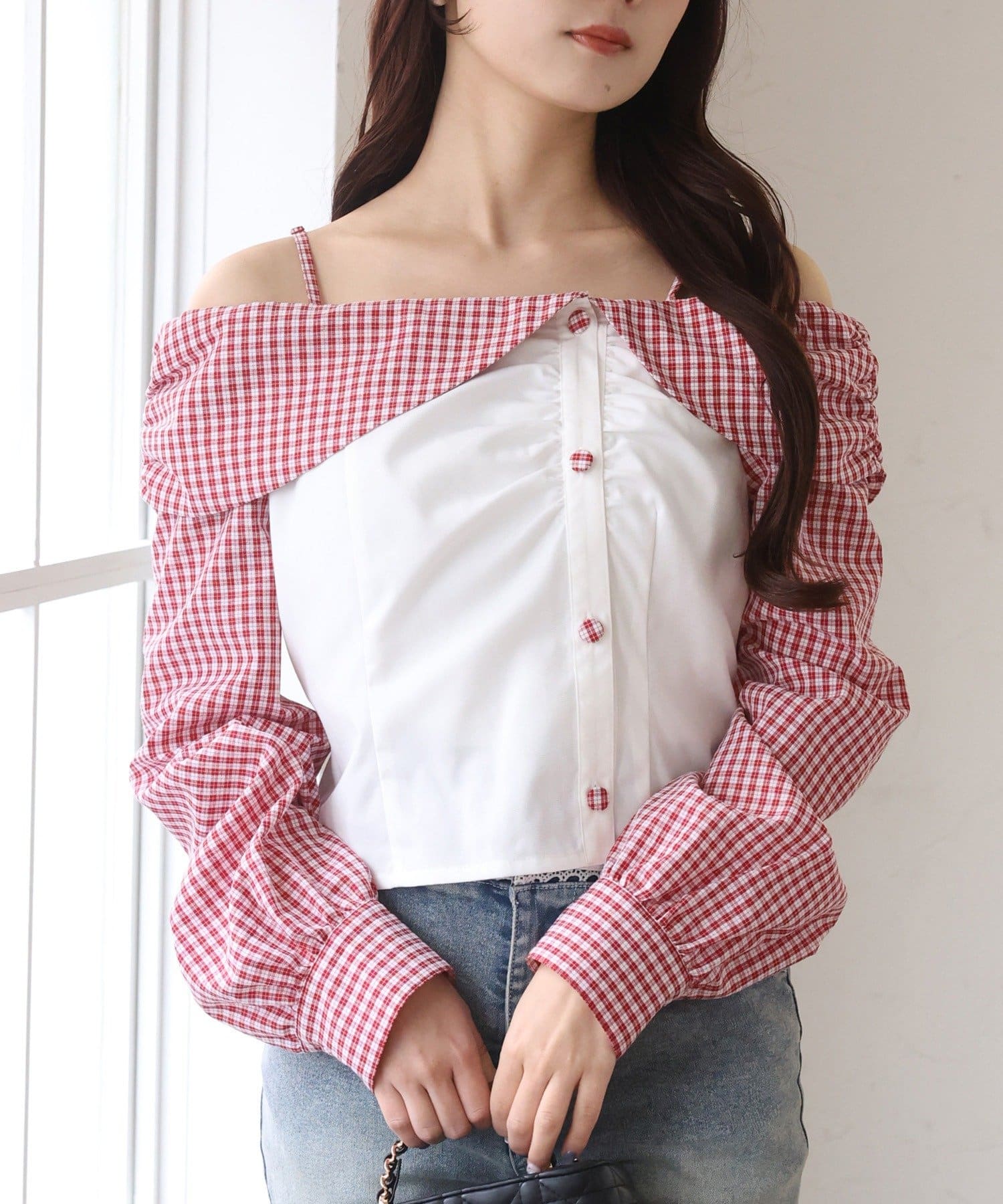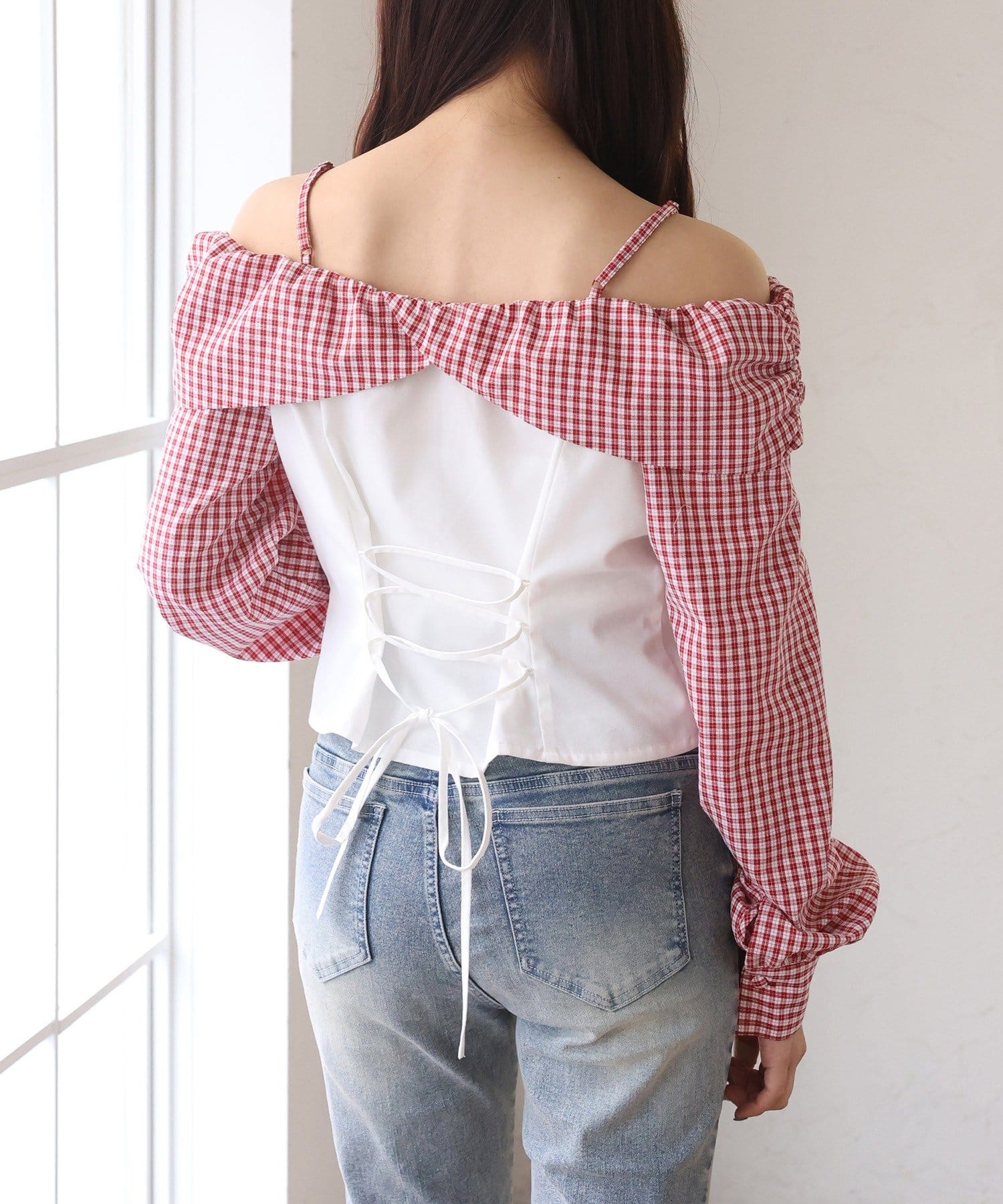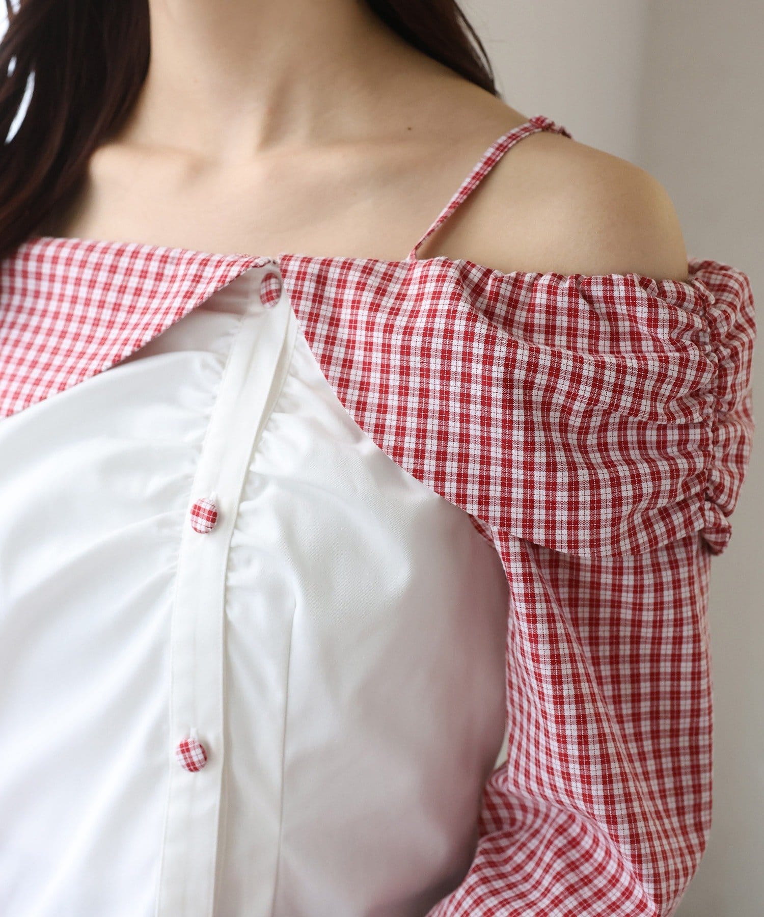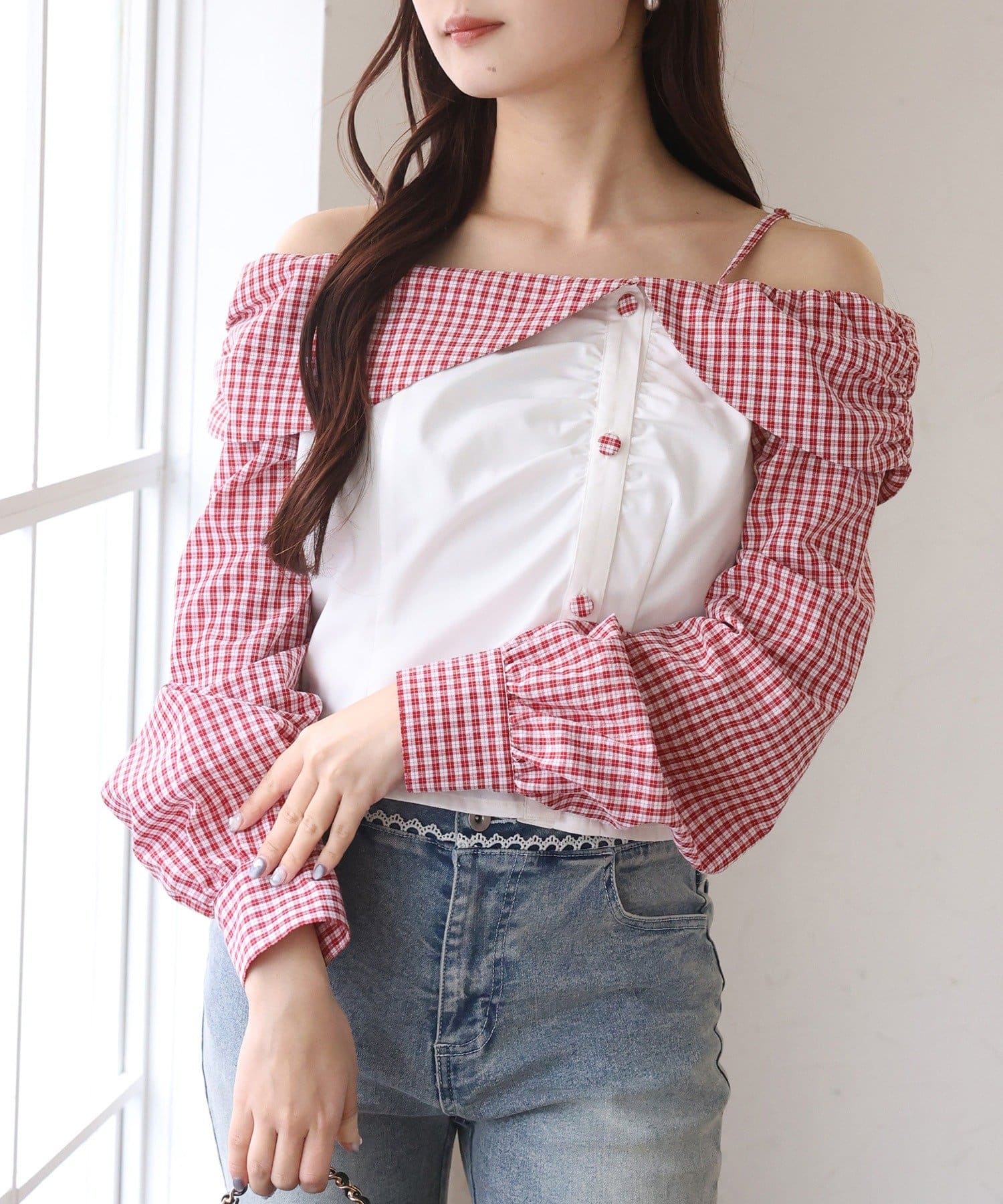 ギンガムチェックが目を惹くガーリーなオフショルトップス。