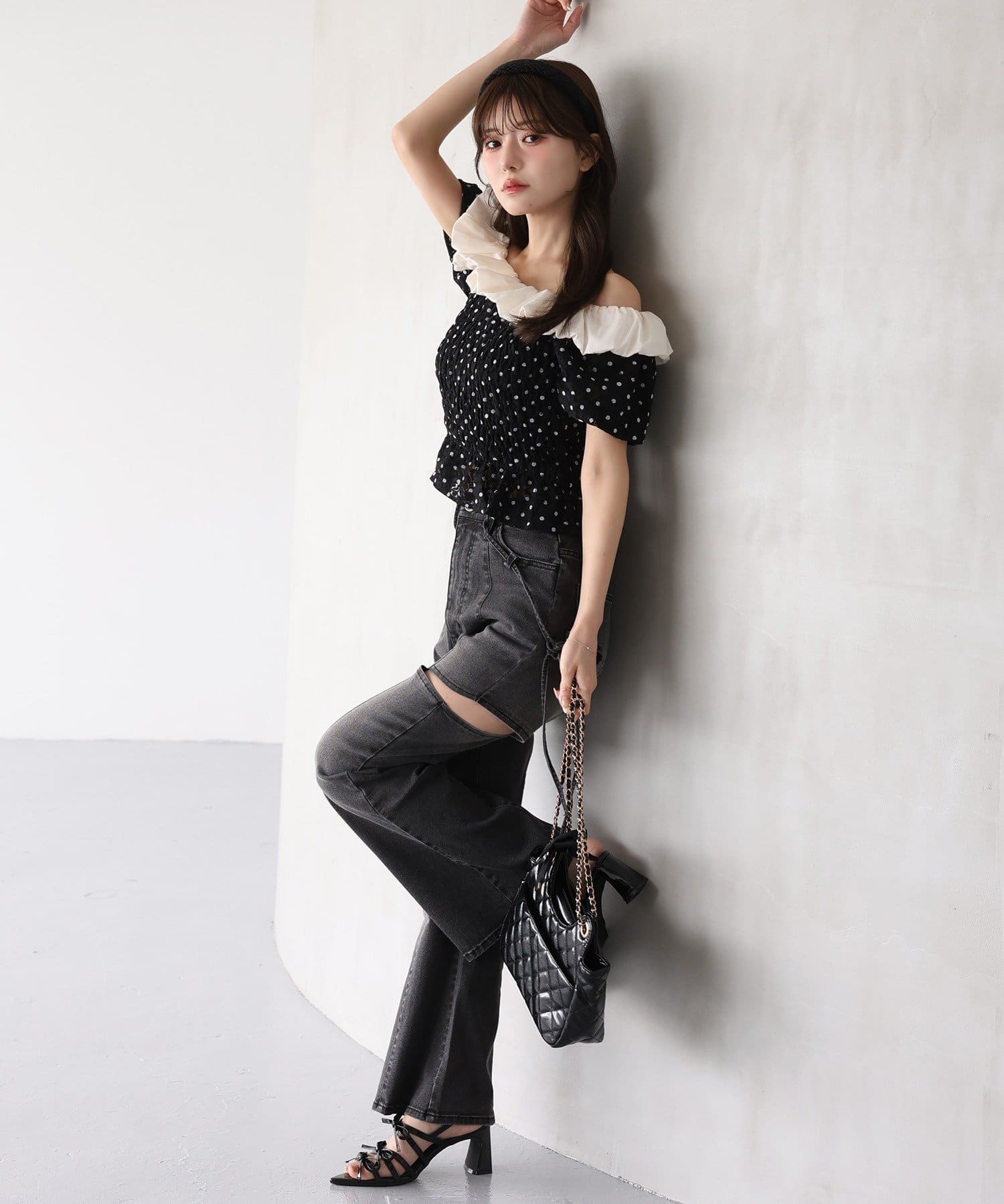 デニムやワイドパンツと合わせて、甘さを抑えたカジュアルミックスコーデも◎。
