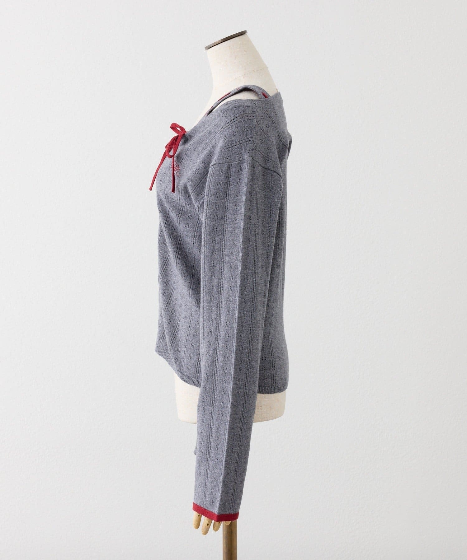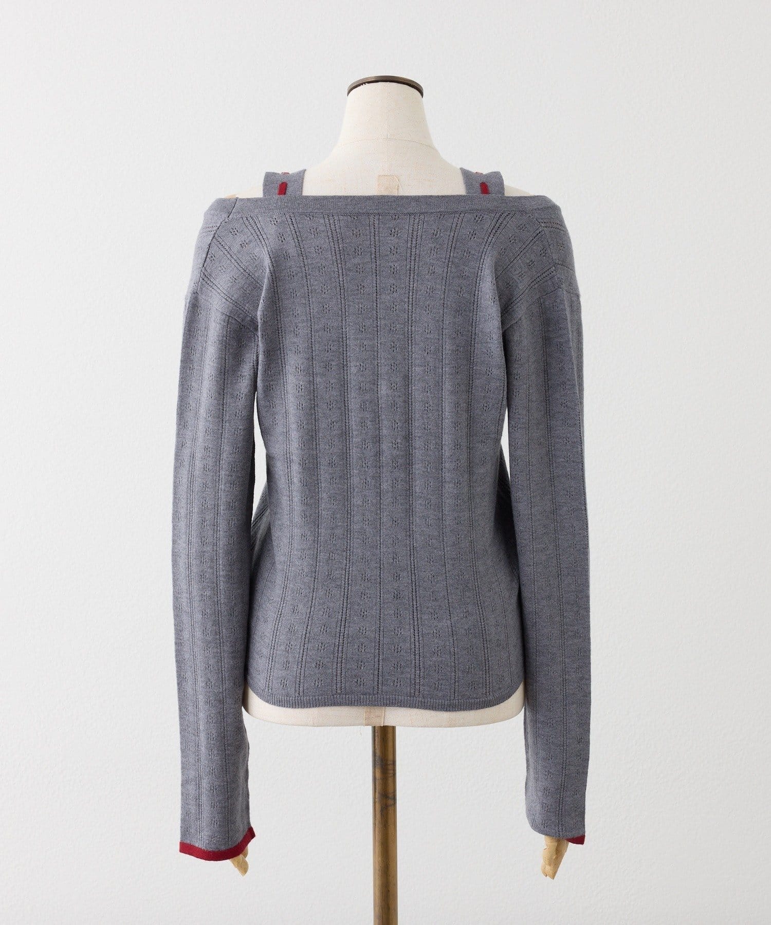 袖の配色デザインが目を惹くカーディガンと、同素材ビスチェのセットアイテム。