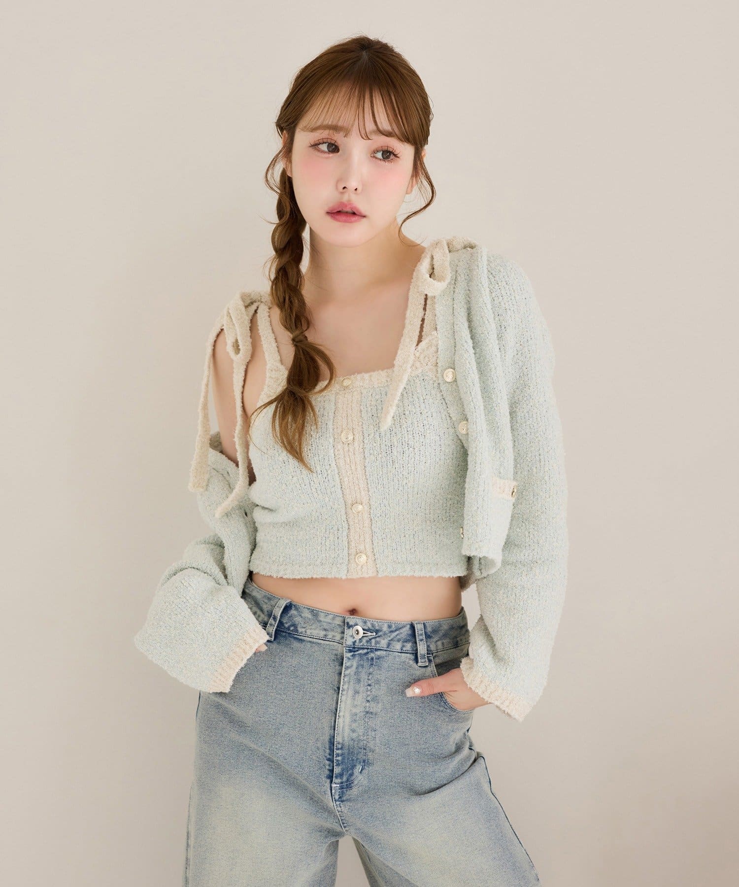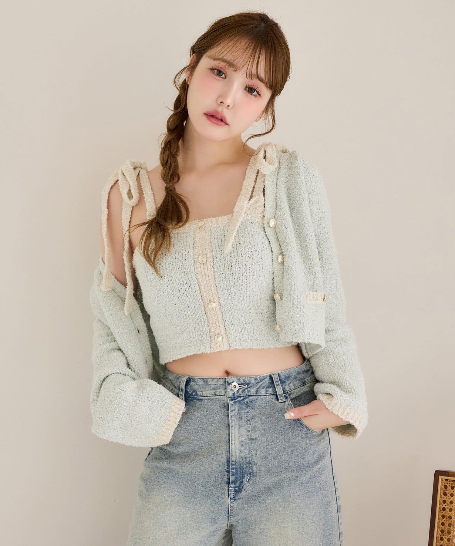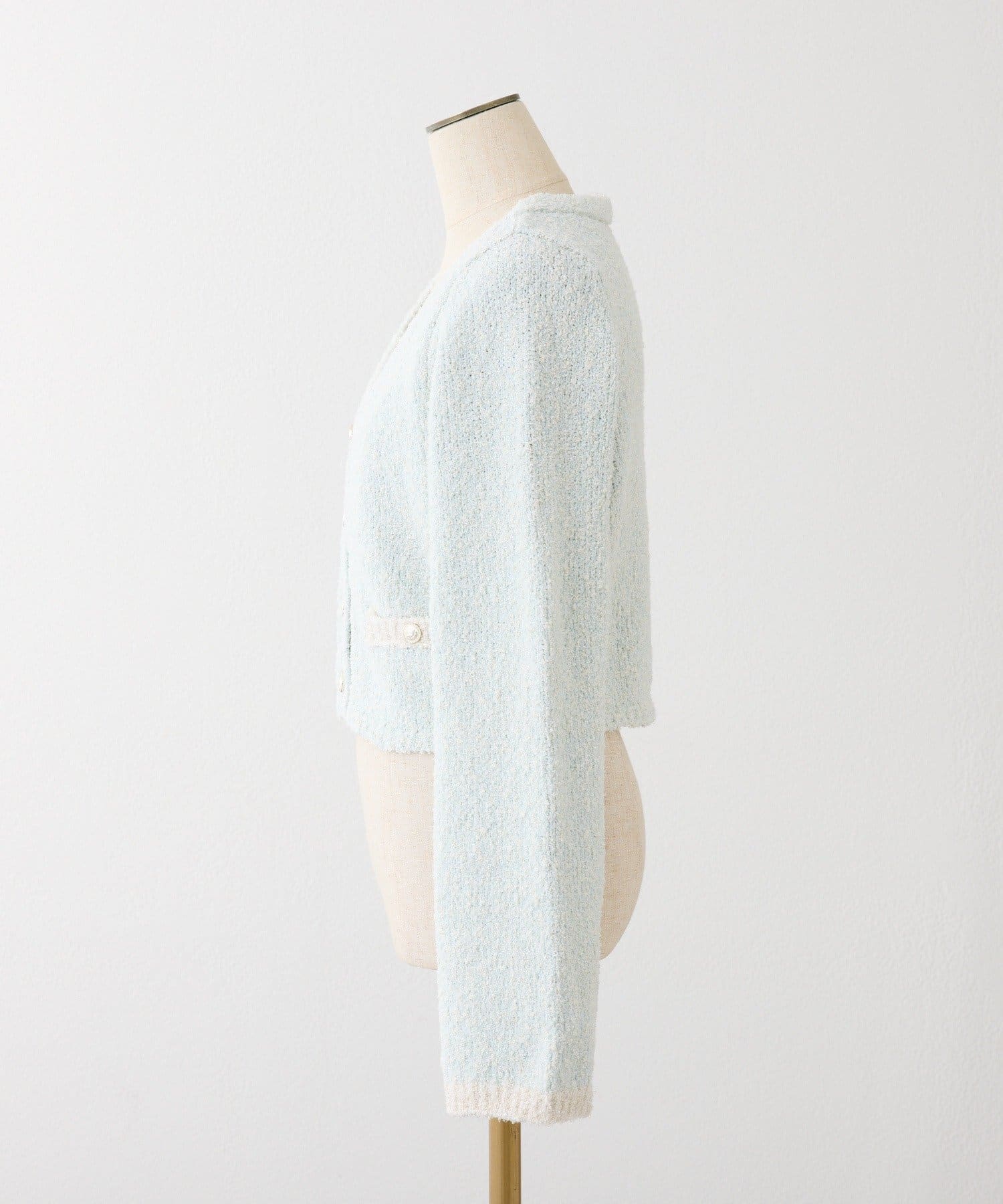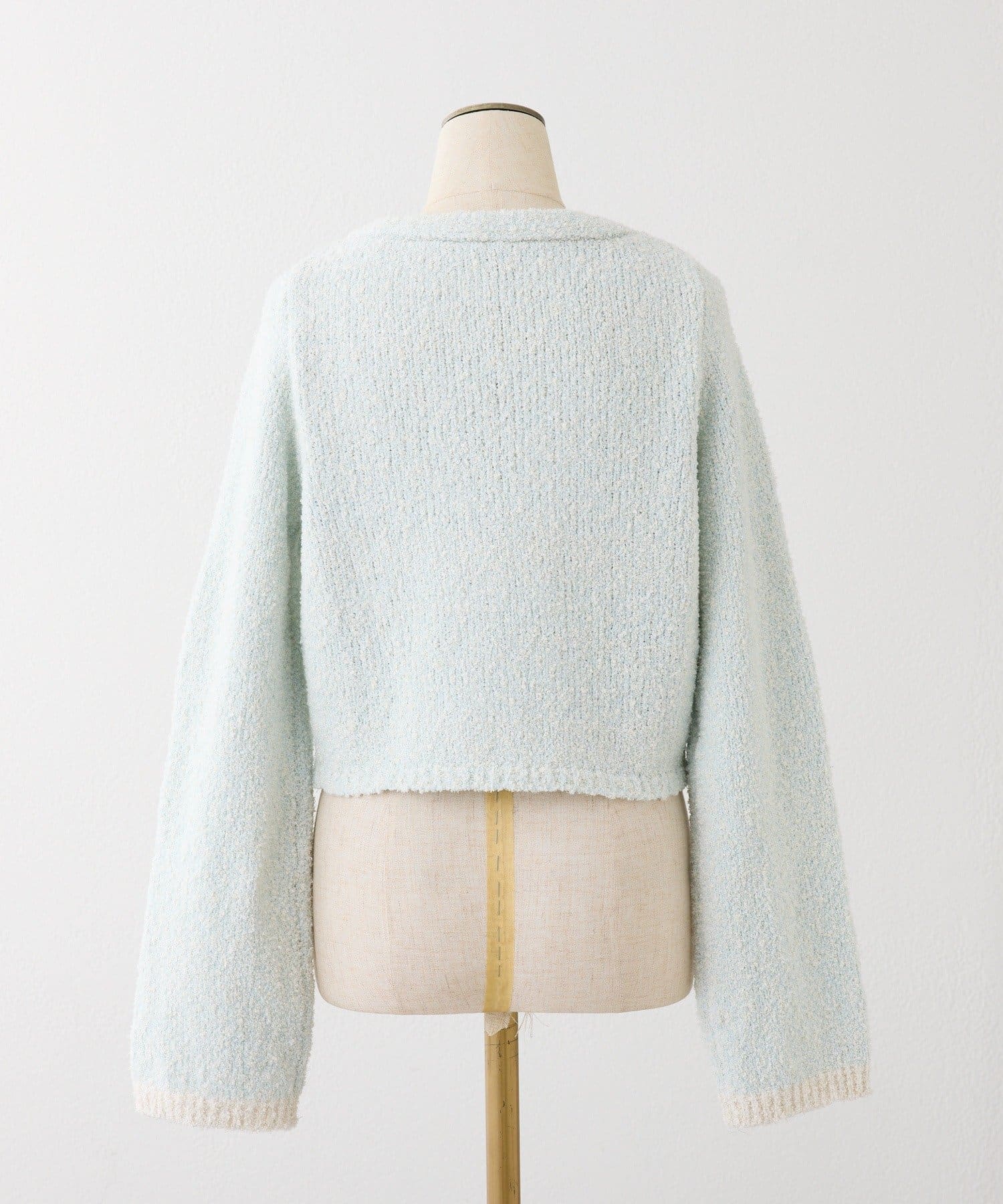 着丈はクロップド丈で、ミニボトムはもちろん、ロングボトムとも好相性。