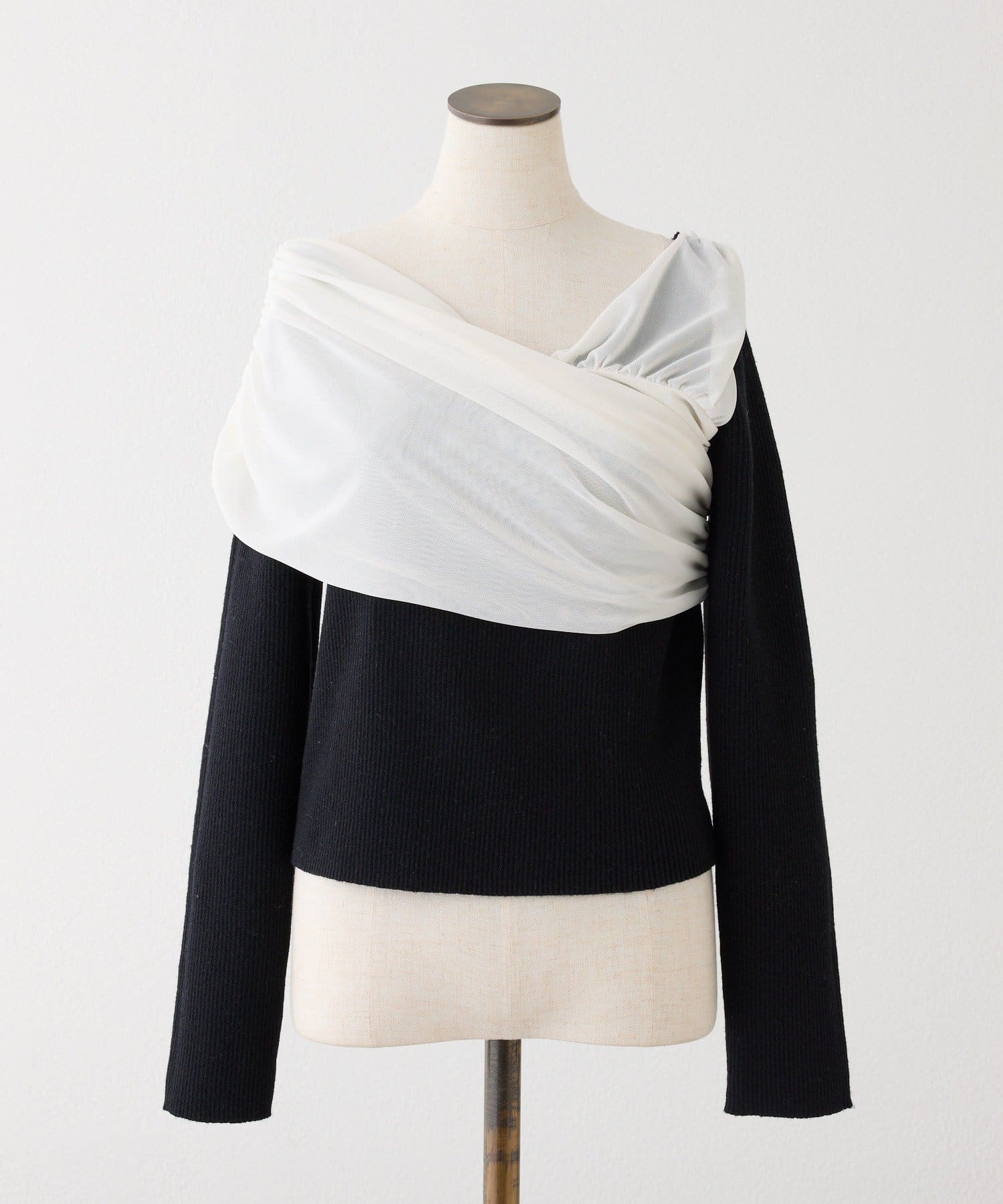 オフショルデザインのニットに、チュール素材をドッキングしたトレンド感たっぷりの1枚。