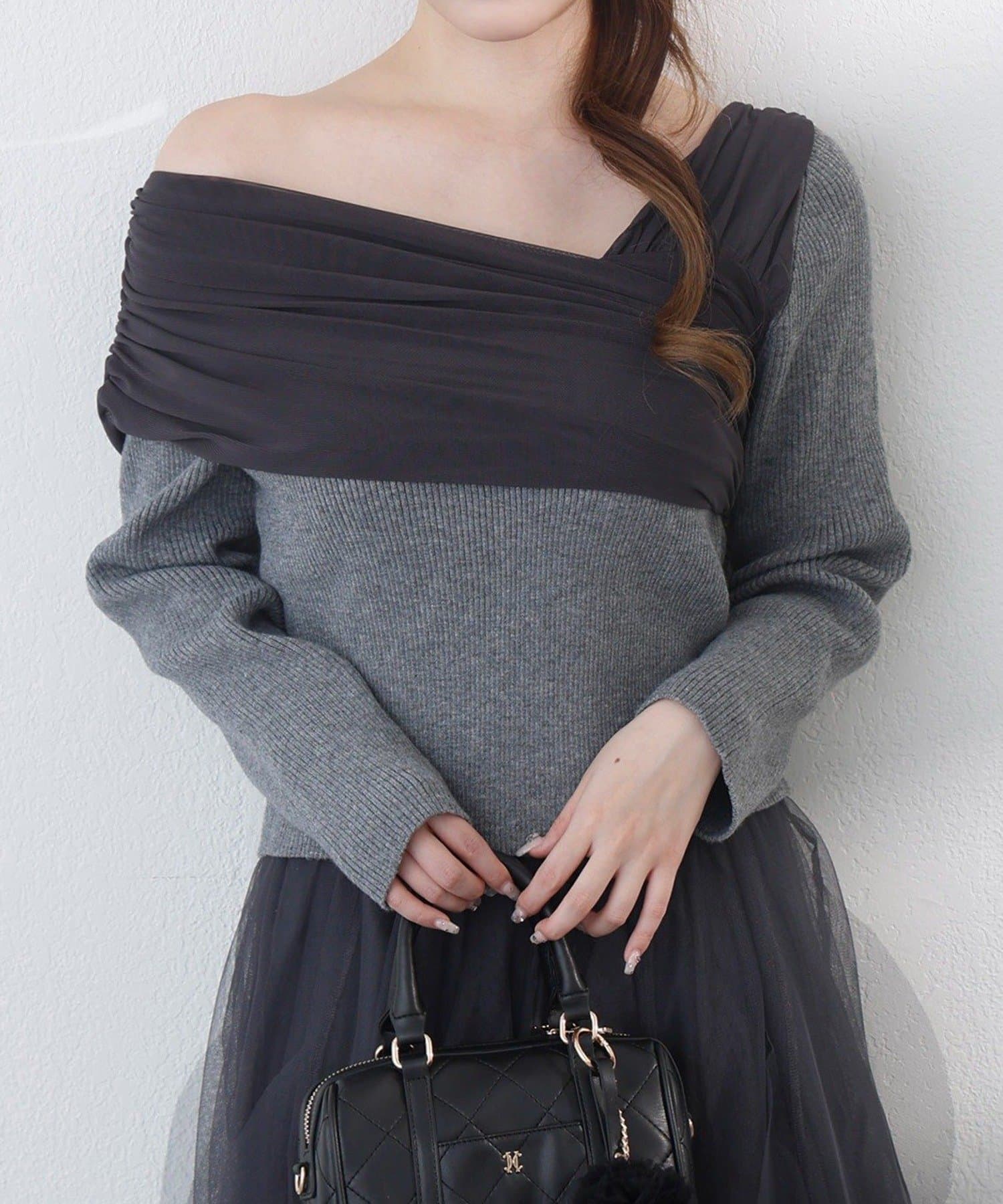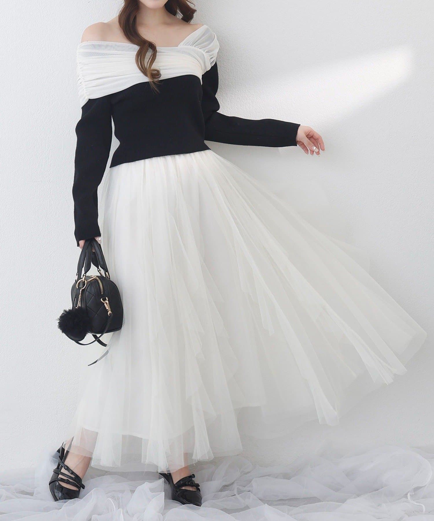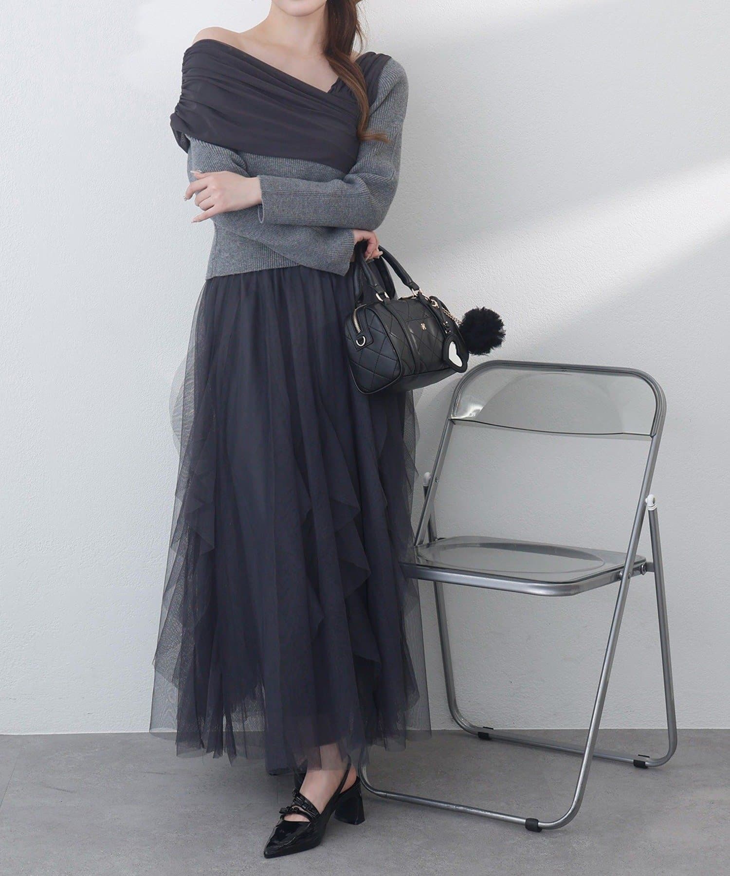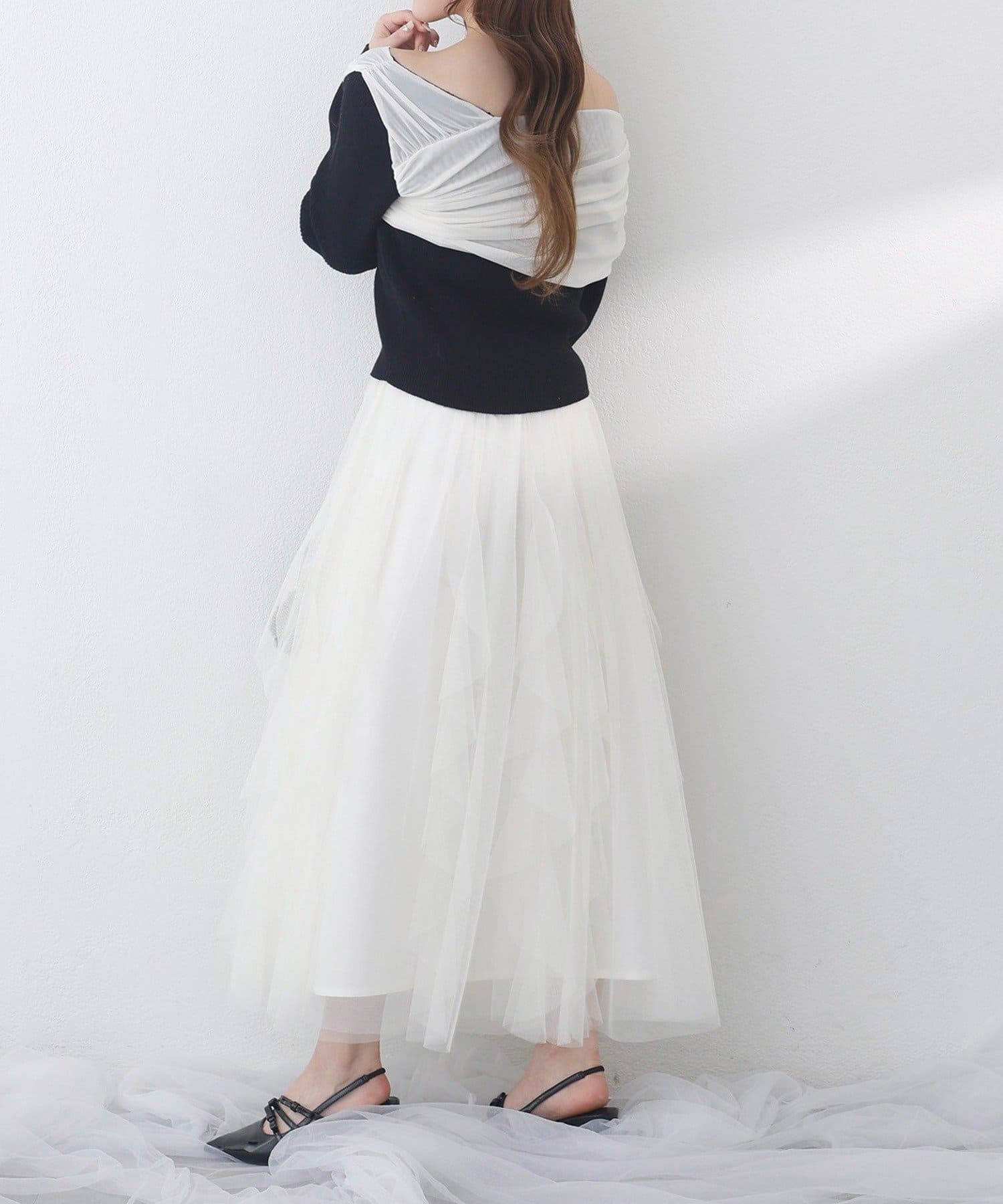 オフショルデザインのニットに、チュール素材をドッキングしたトレンド感たっぷりの1枚。
