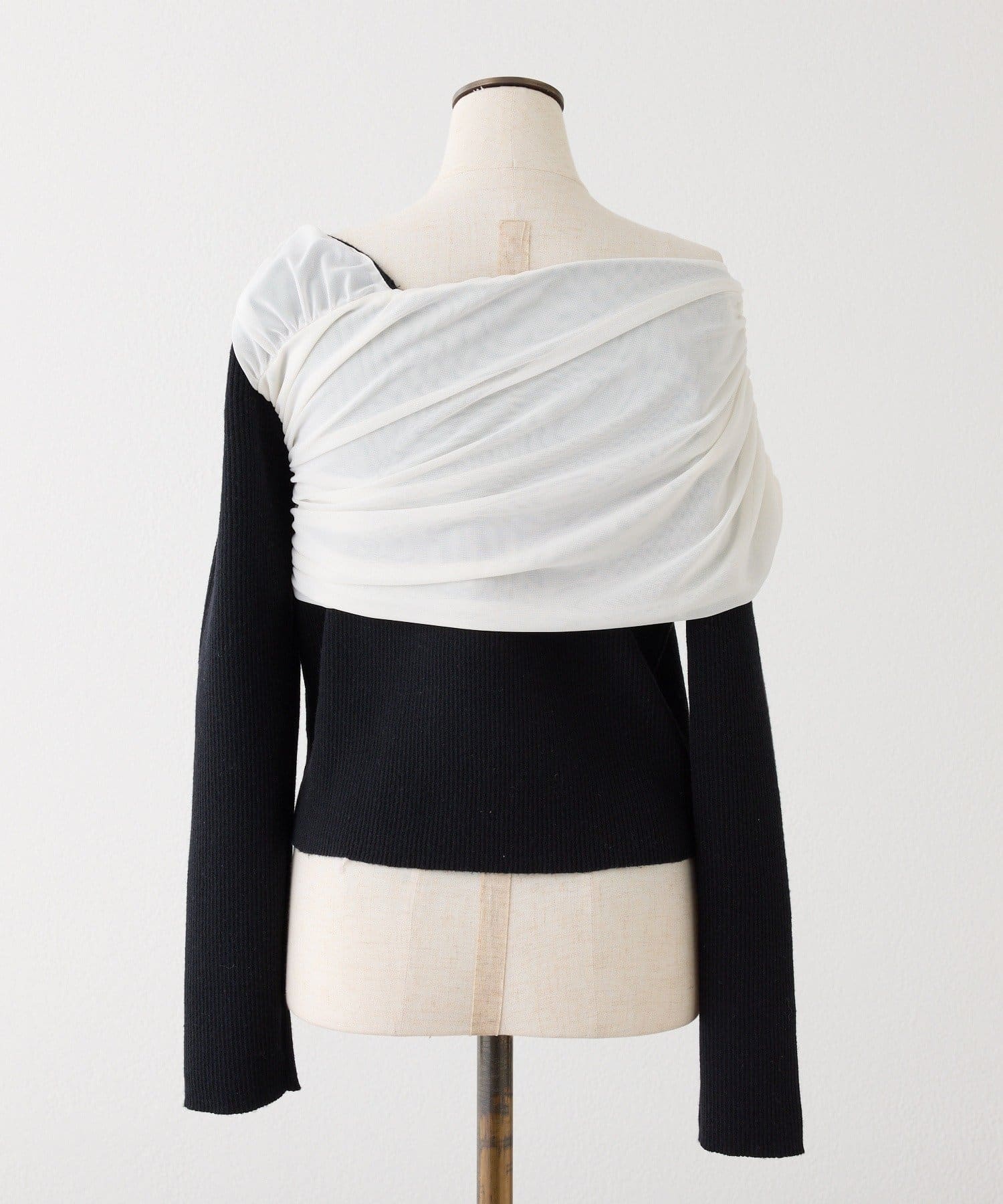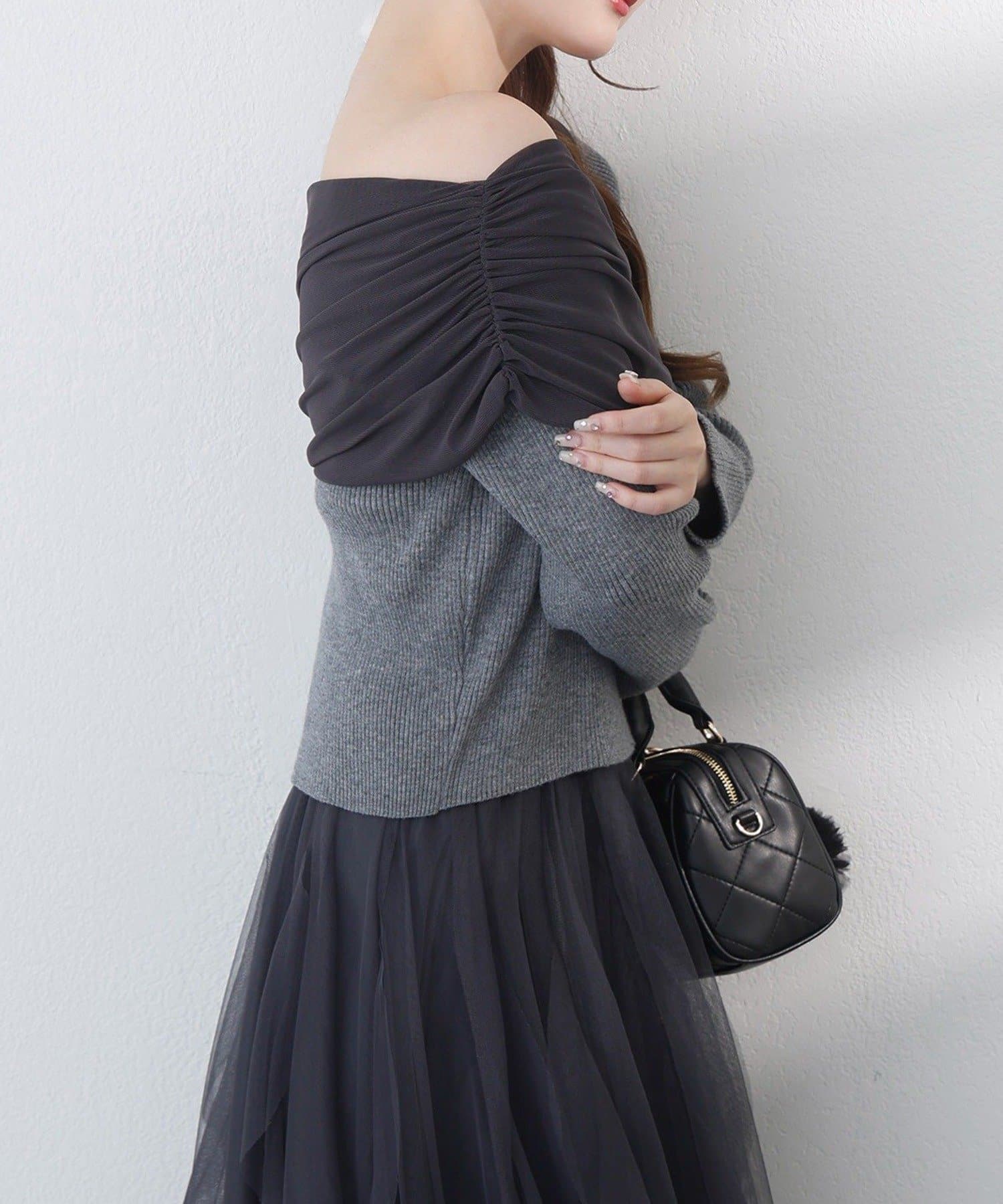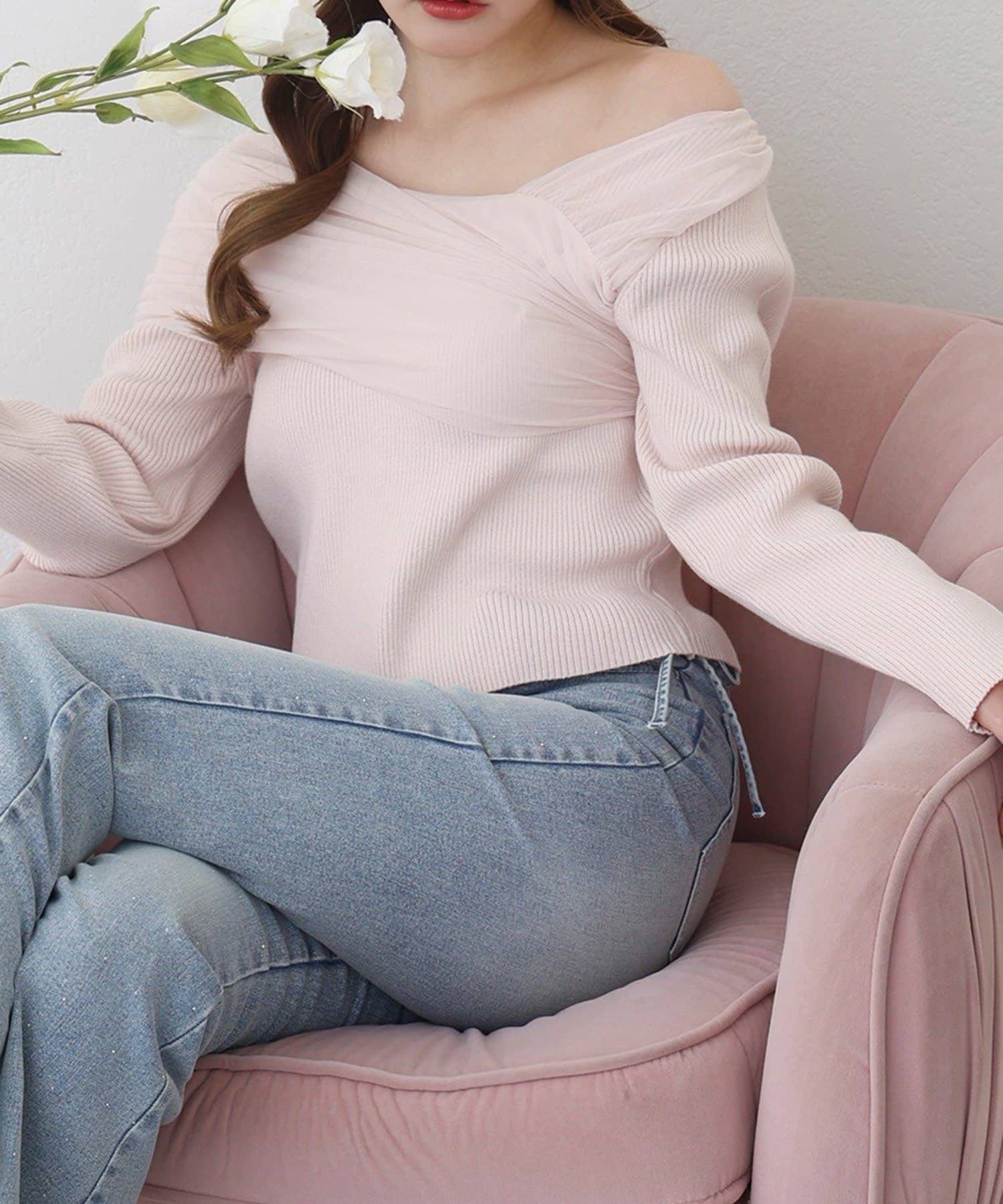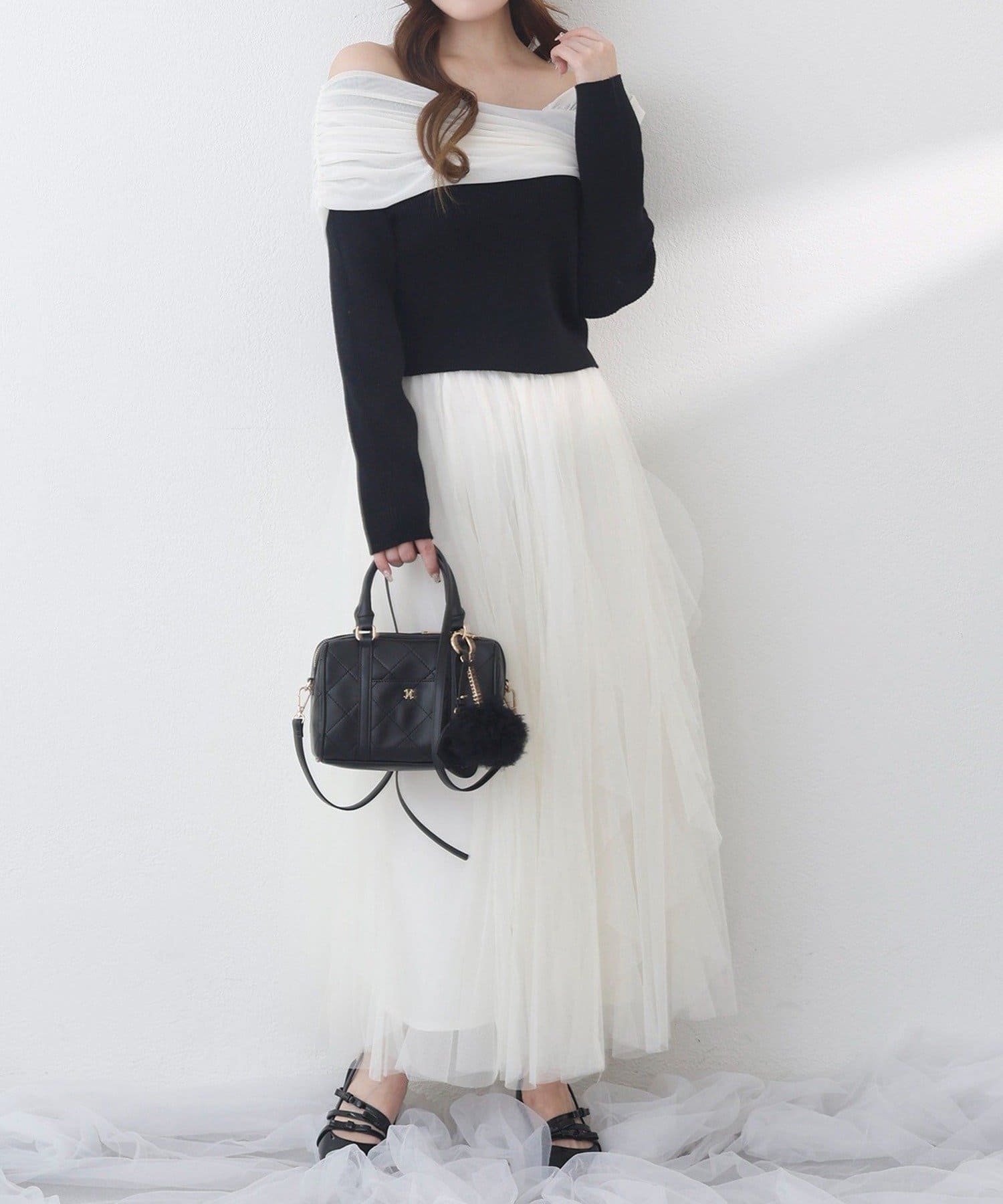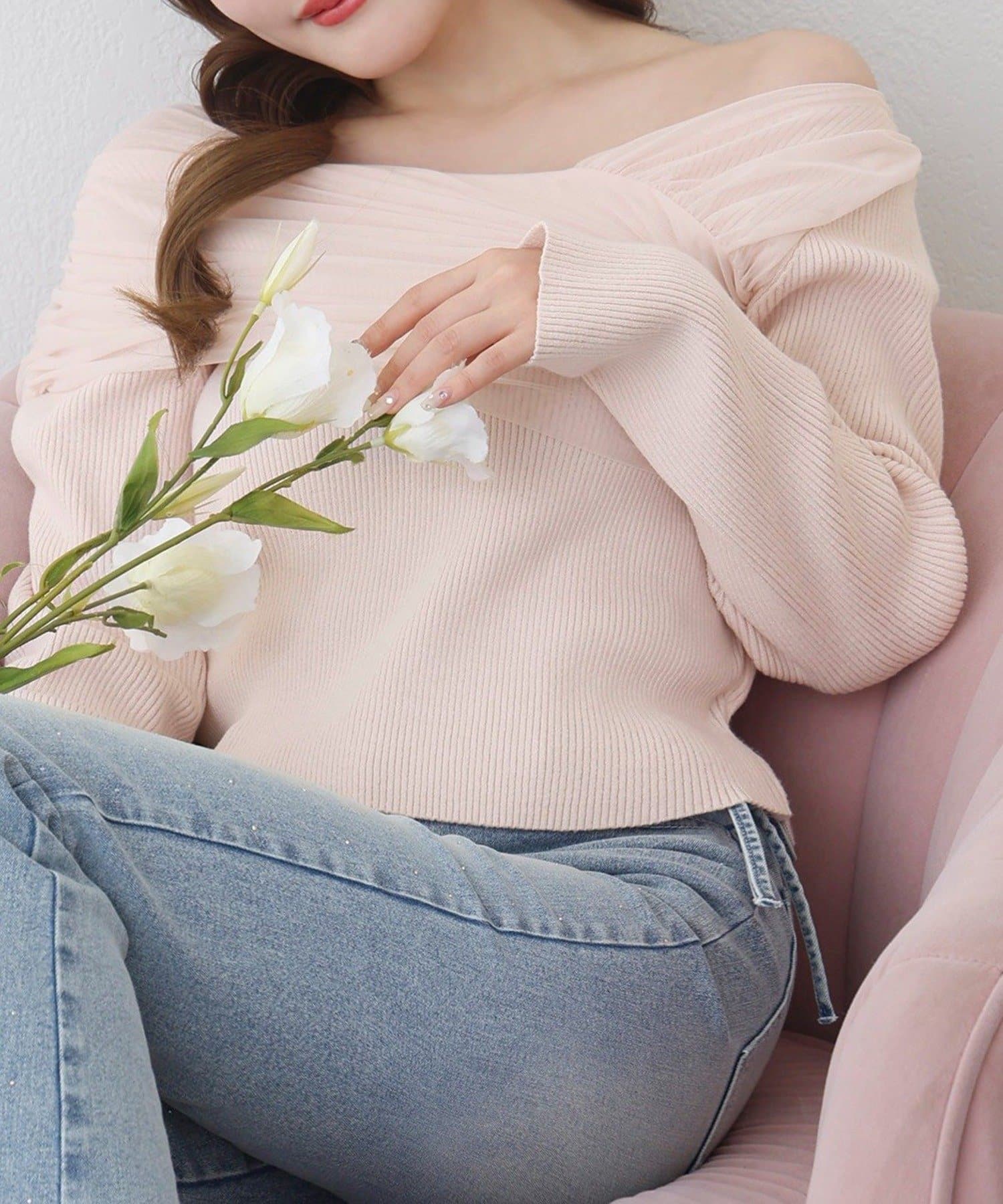 オフショルデザインのニットに、チュール素材をドッキングしたトレンド感たっぷりの1枚。