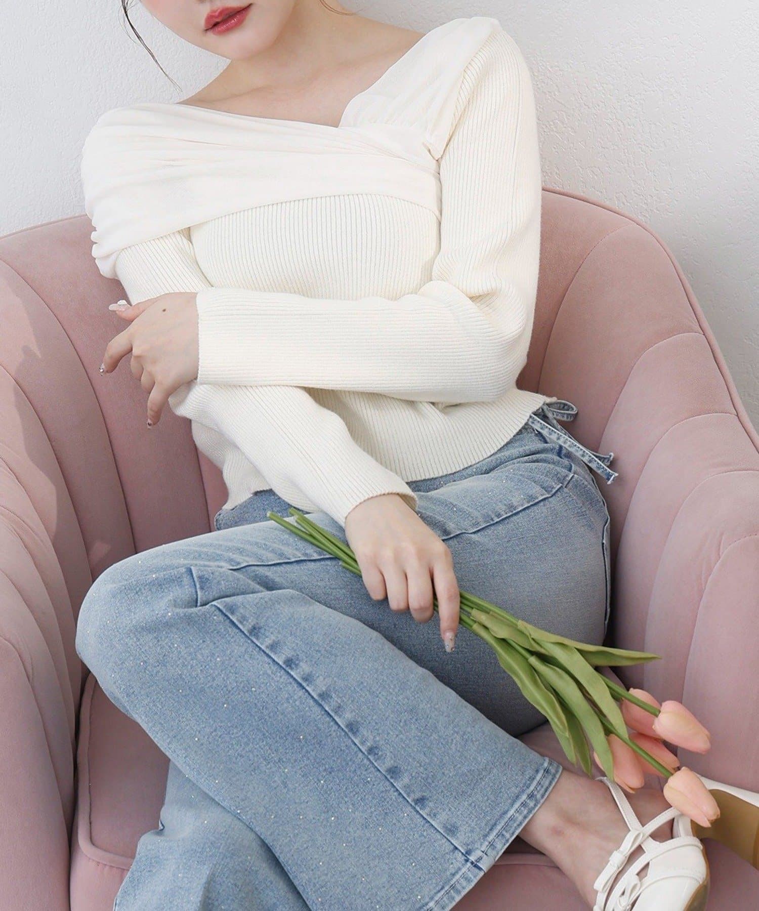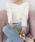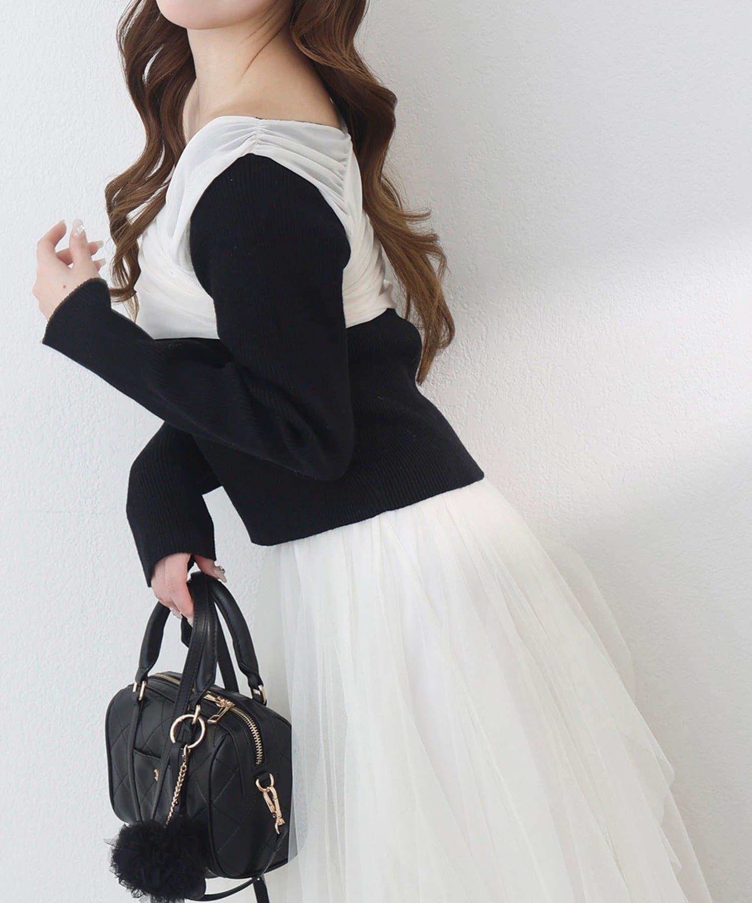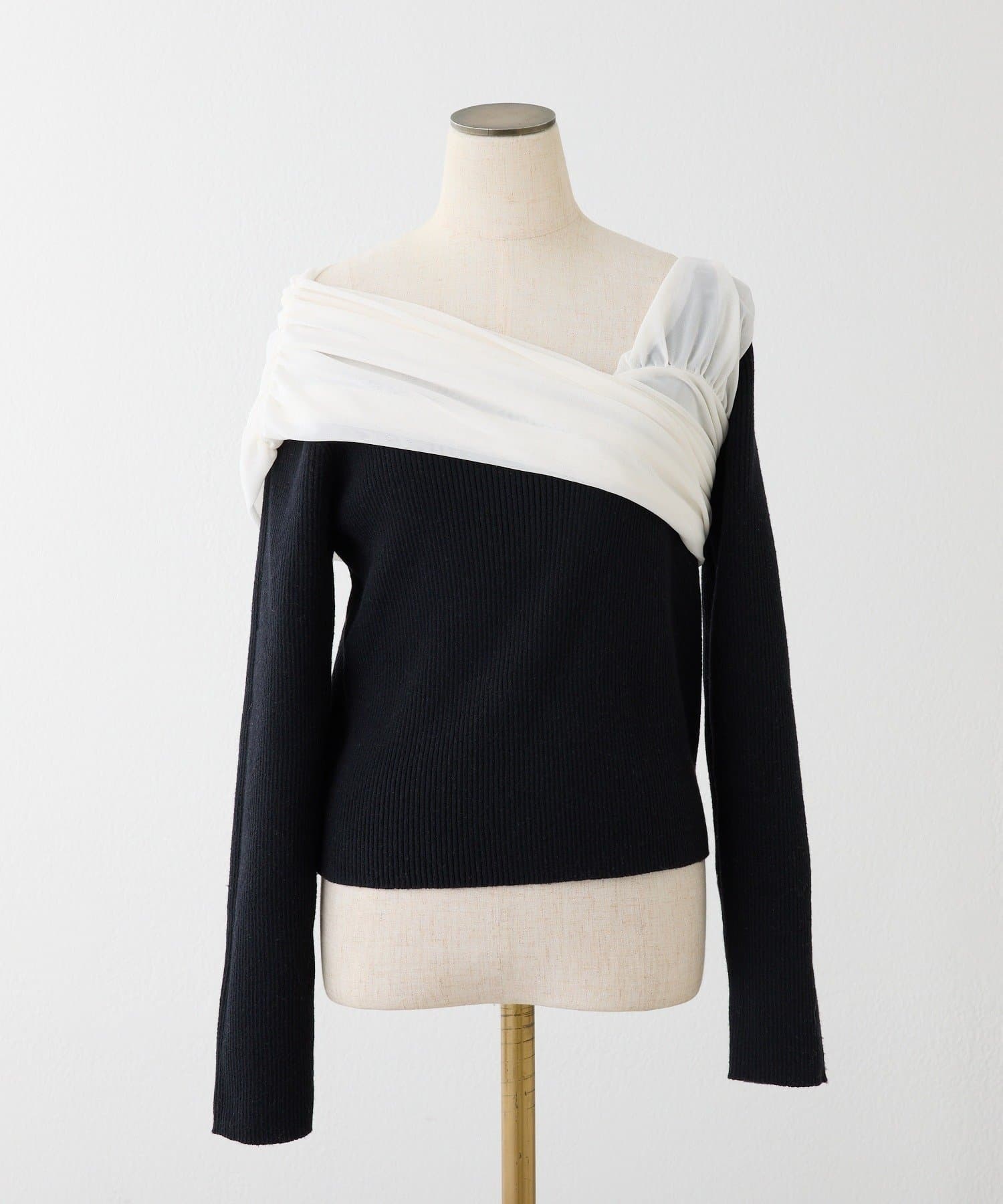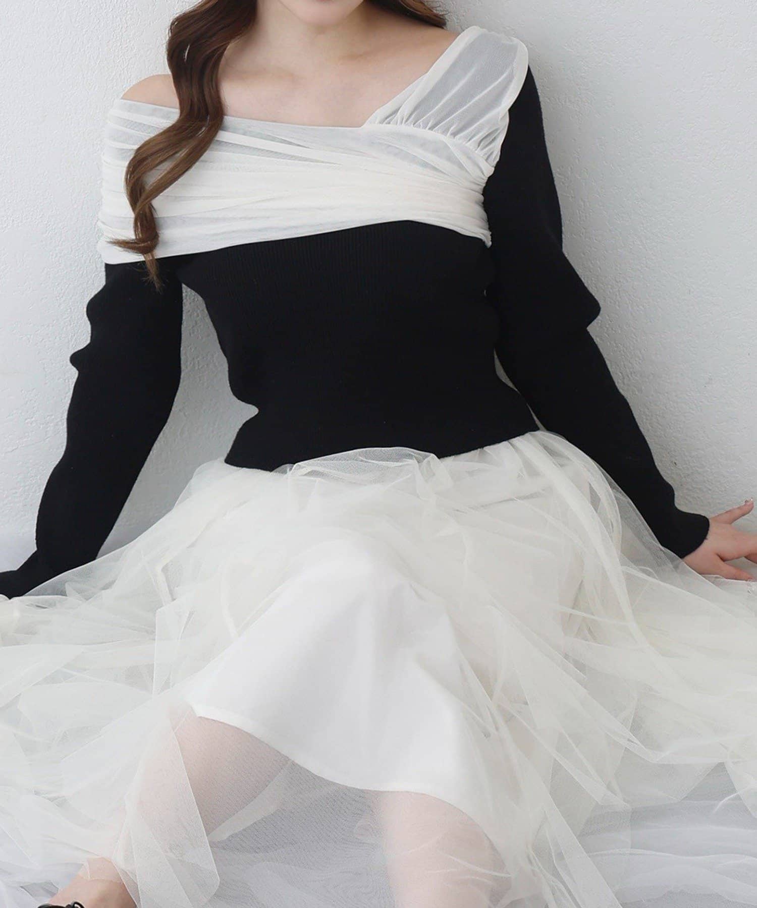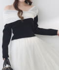 オフショルデザインのニットに、チュール素材をドッキングしたトレンド感たっぷりの1枚。
