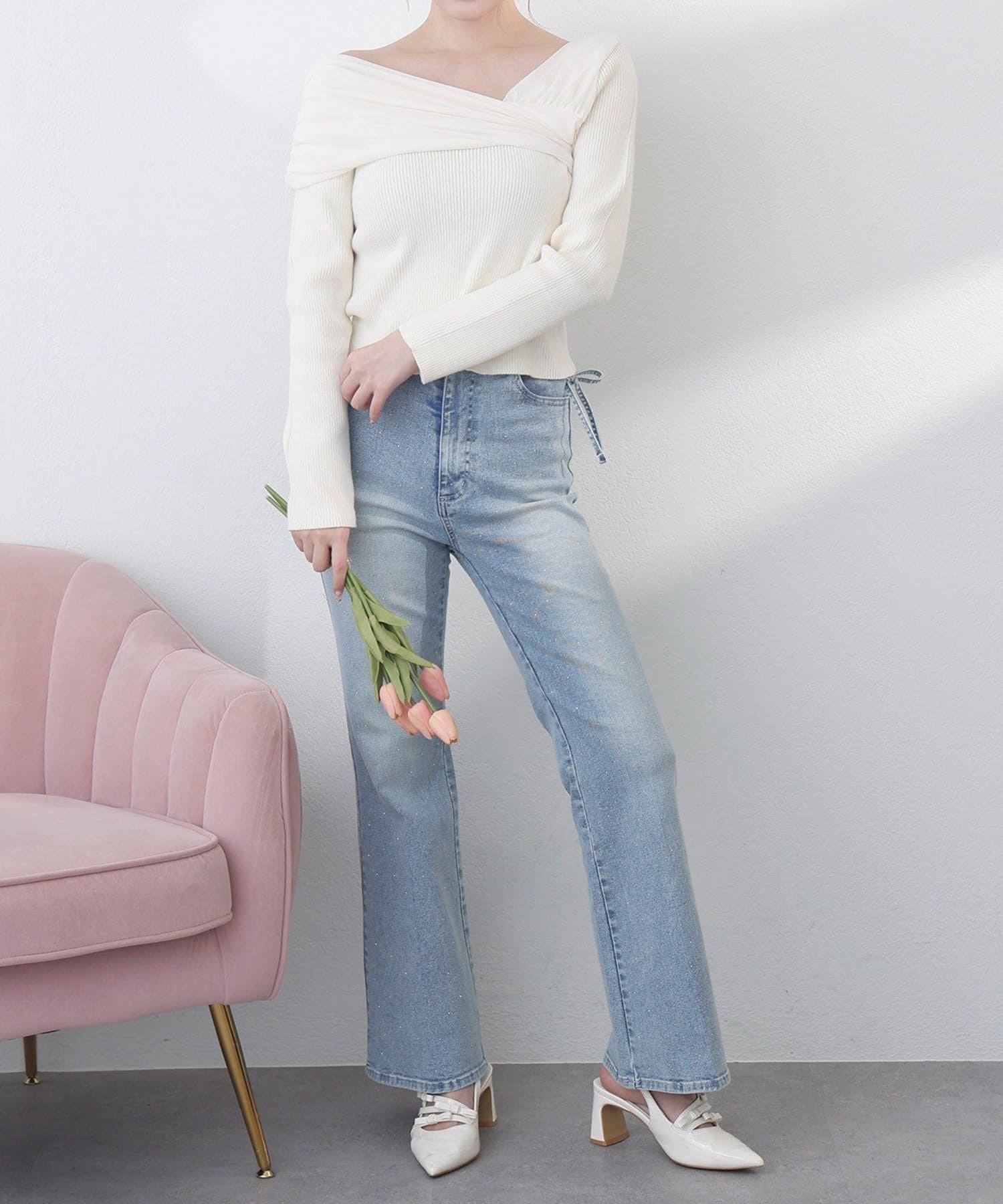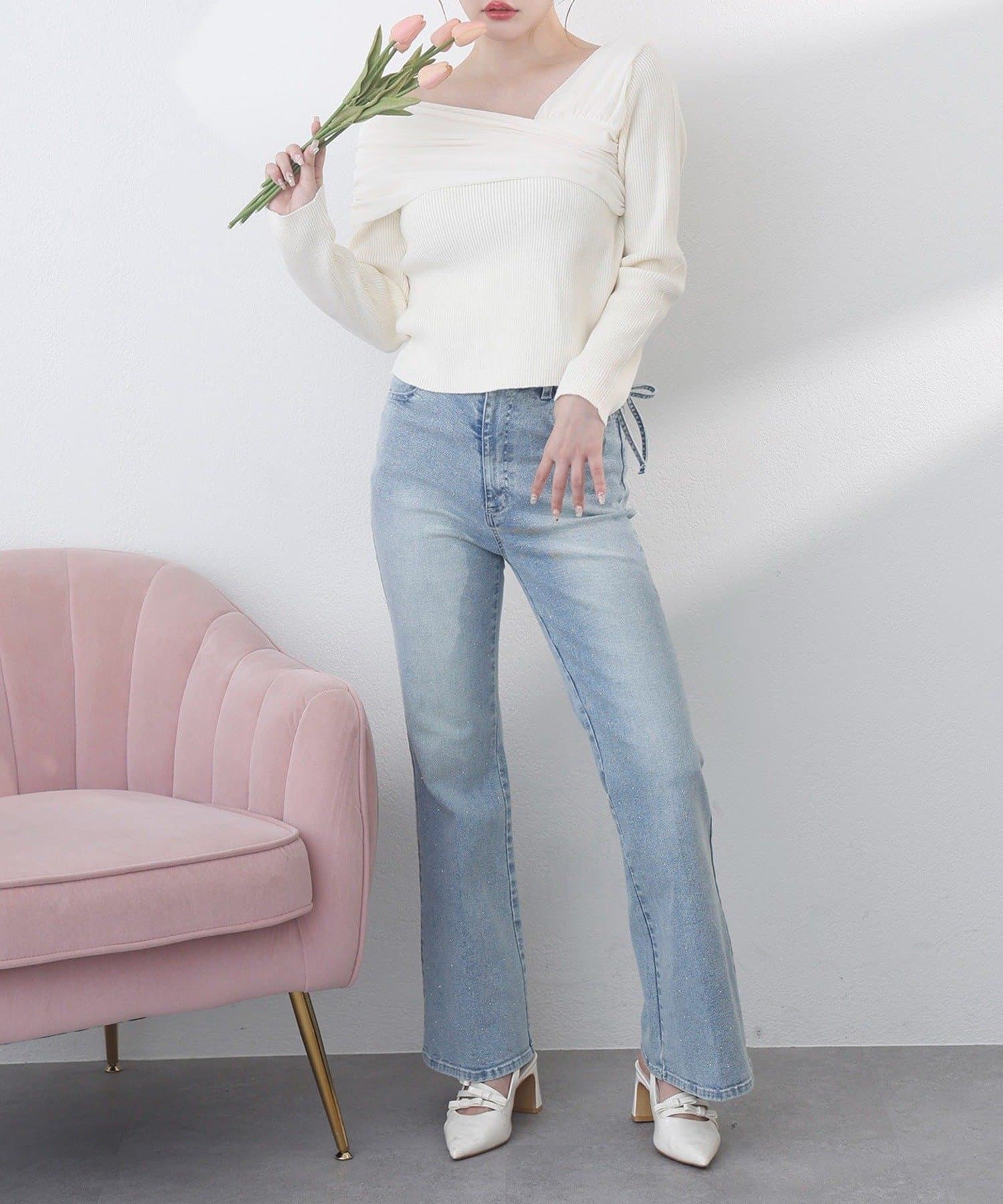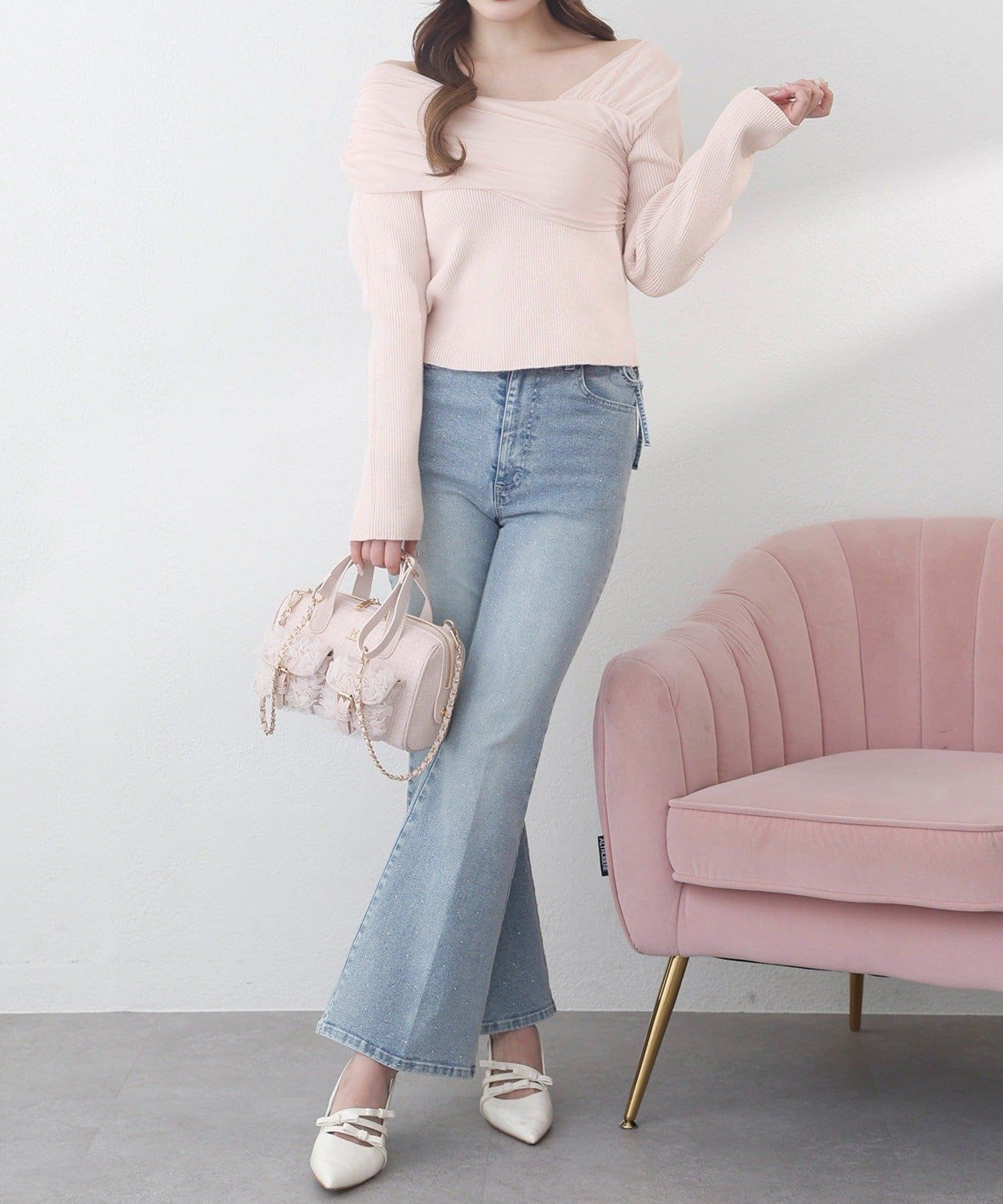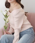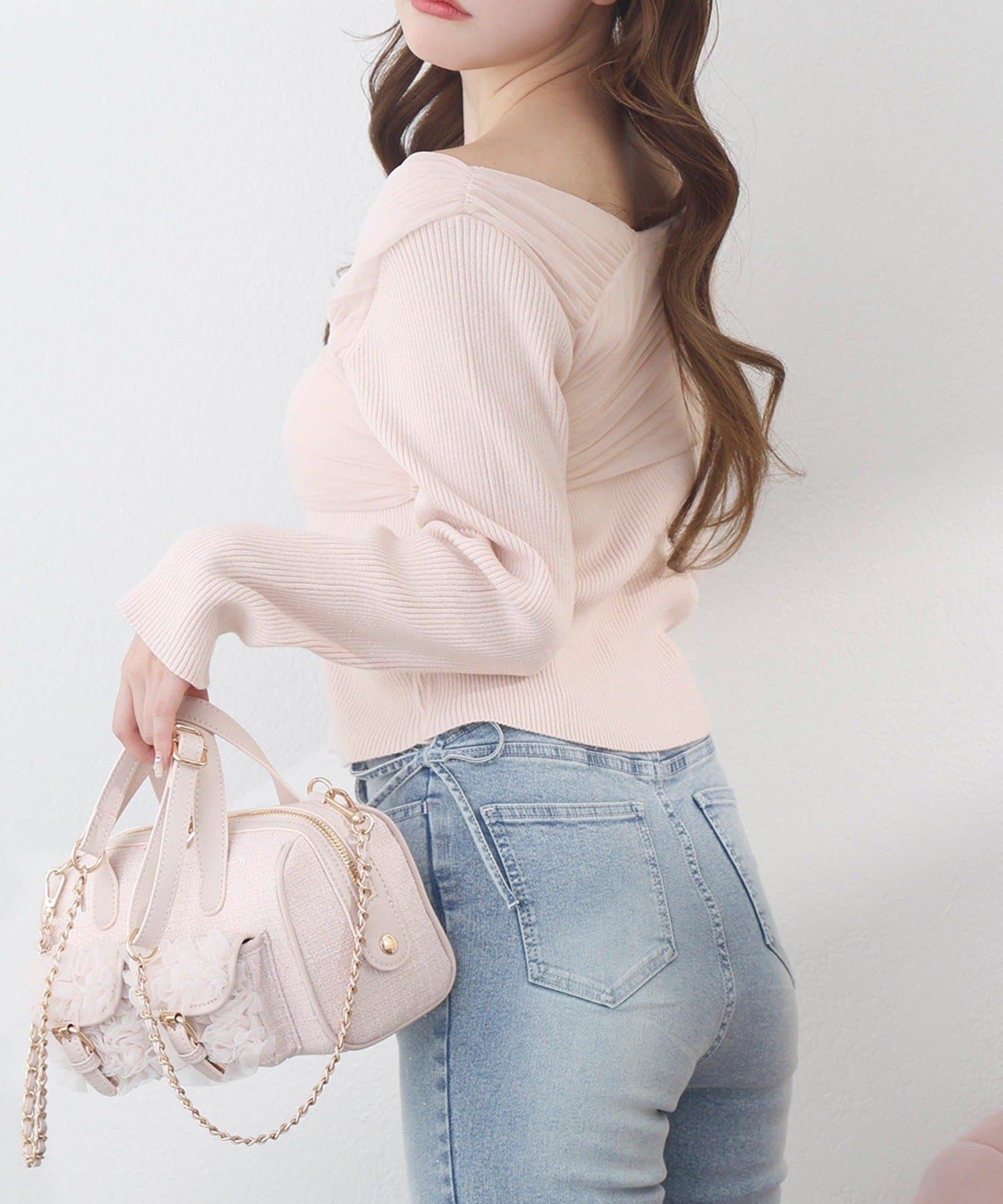 オフショルデザインのニットに、チュール素材をドッキングしたトレンド感たっぷりの1枚。