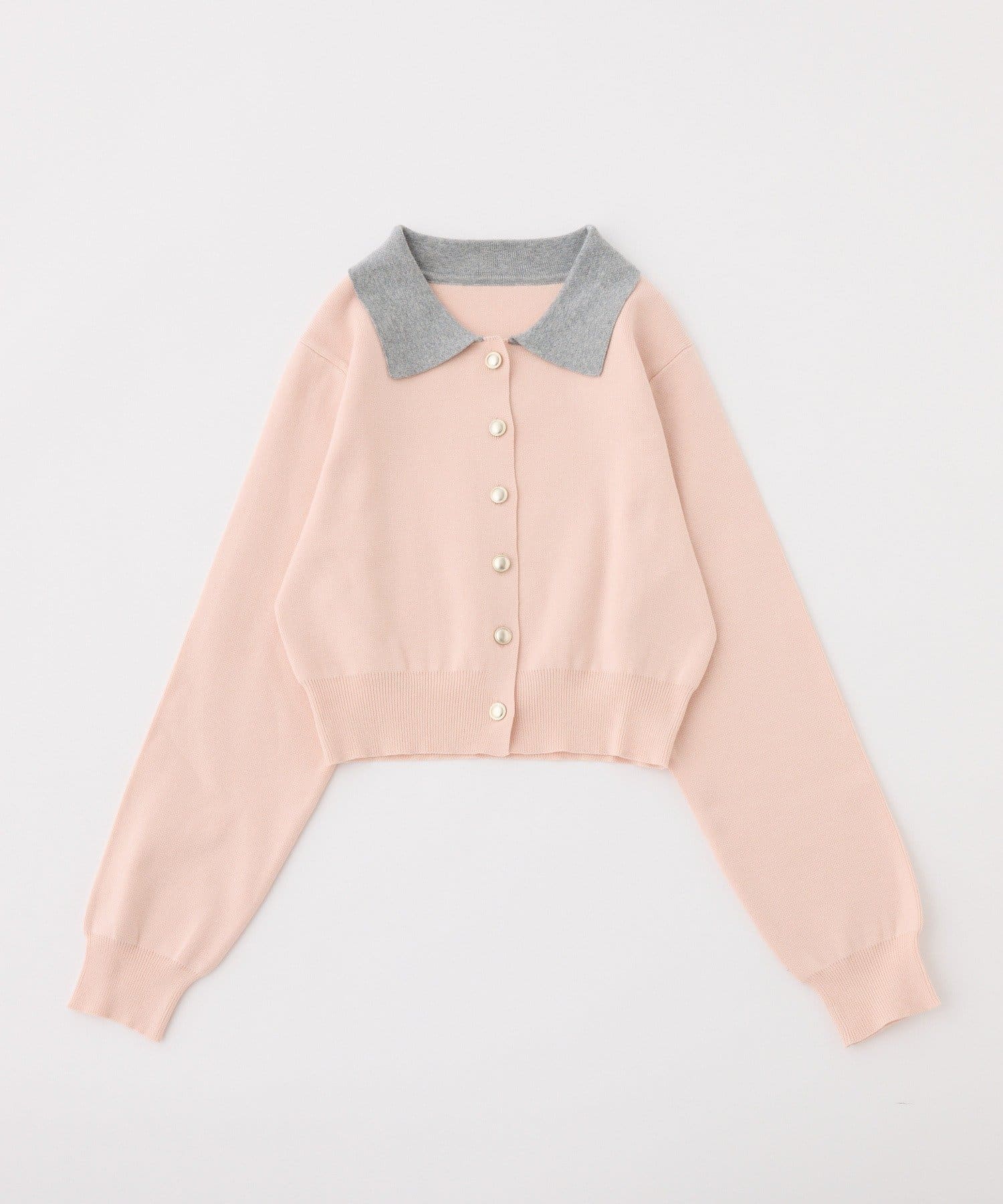配色襟と、フロントに金ボタンを施したカーディガン。