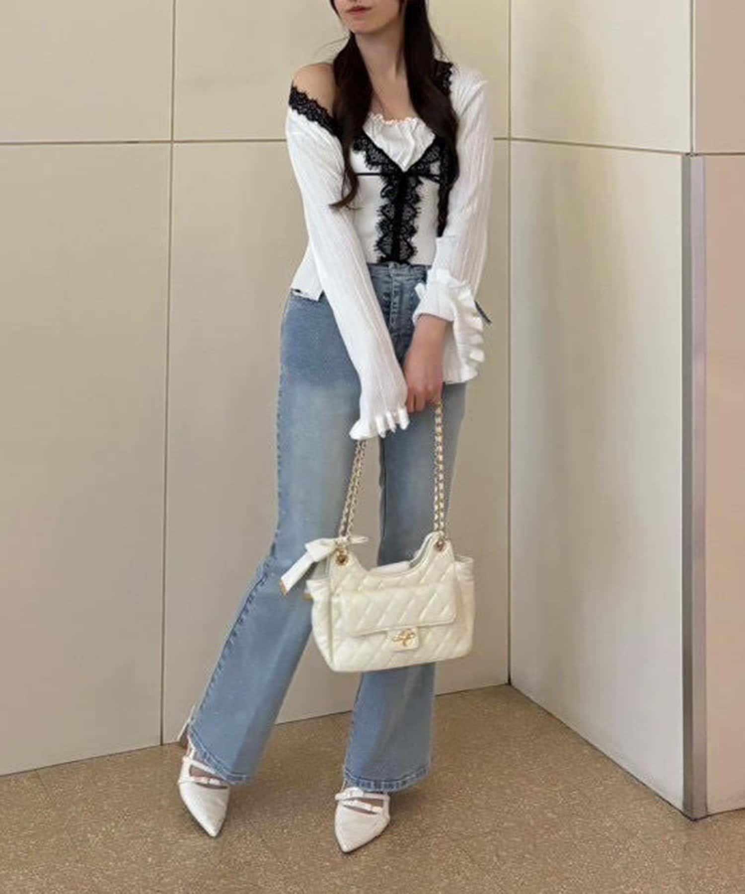 デニム合わせで甘さを抑えたカジュアルミックスコーデに。