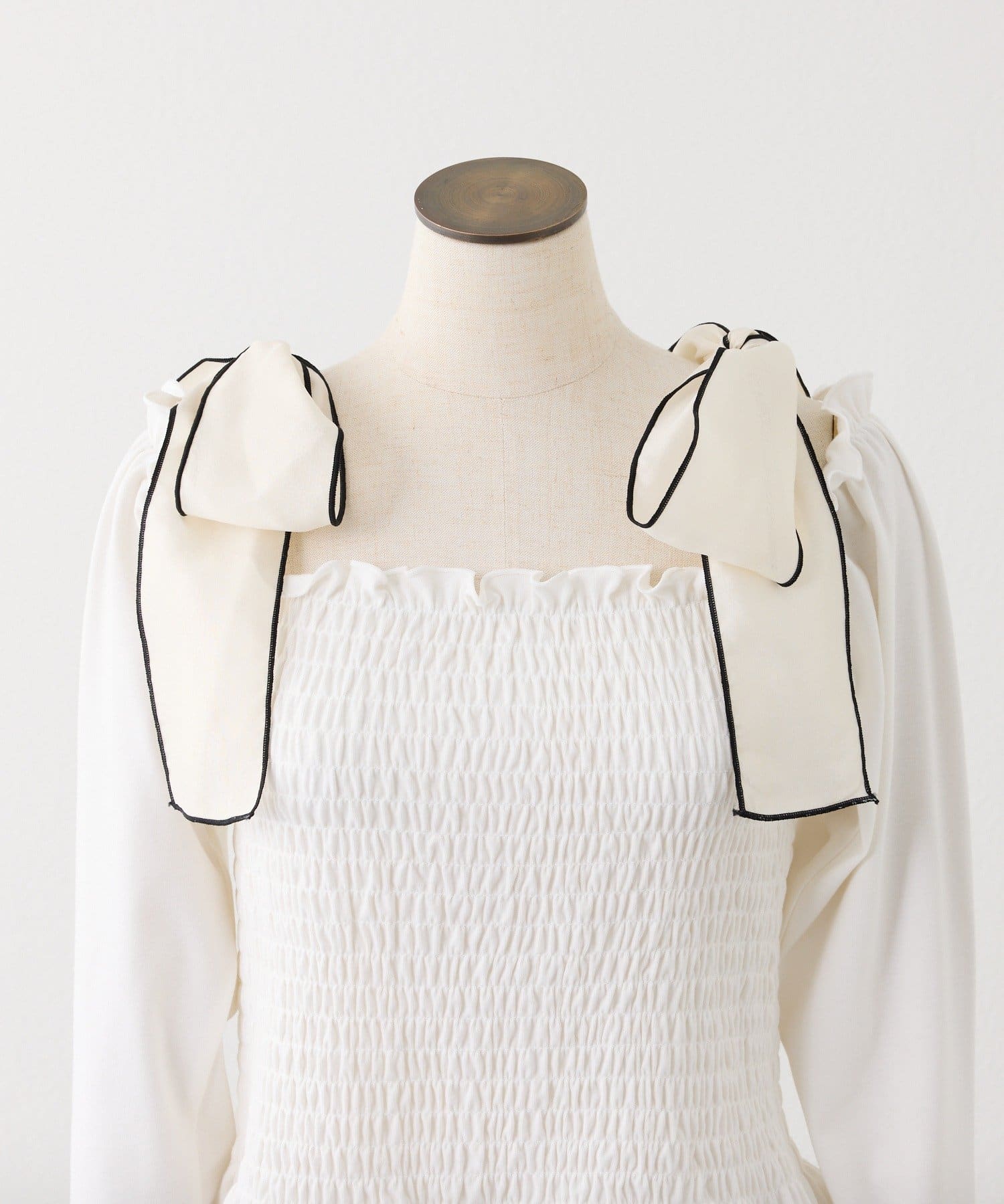 肩にはリボンがあしらわれていて、シンプルながらもガーリーなアクセントをプラスしてくれます。