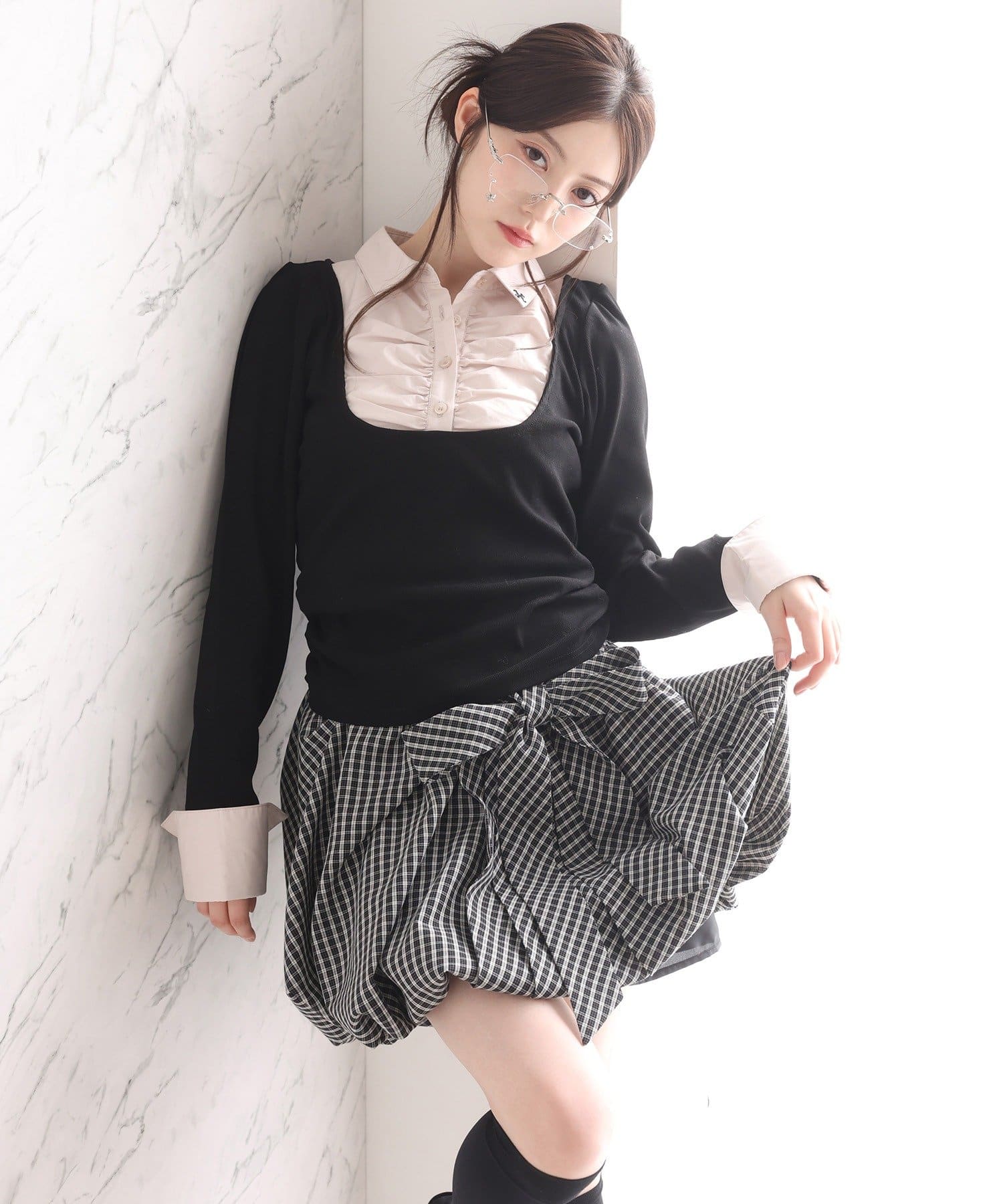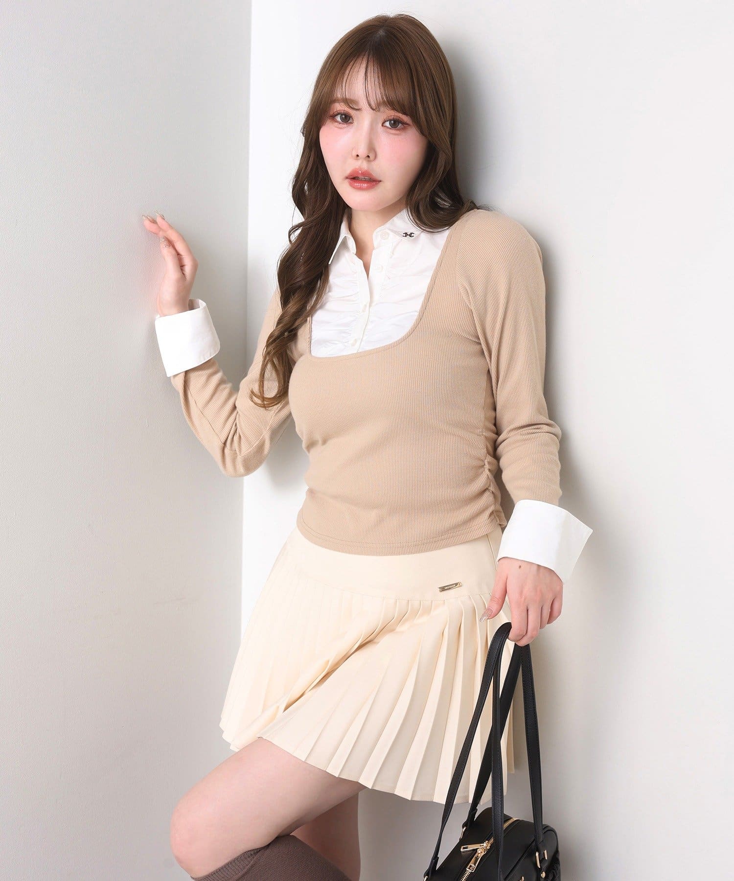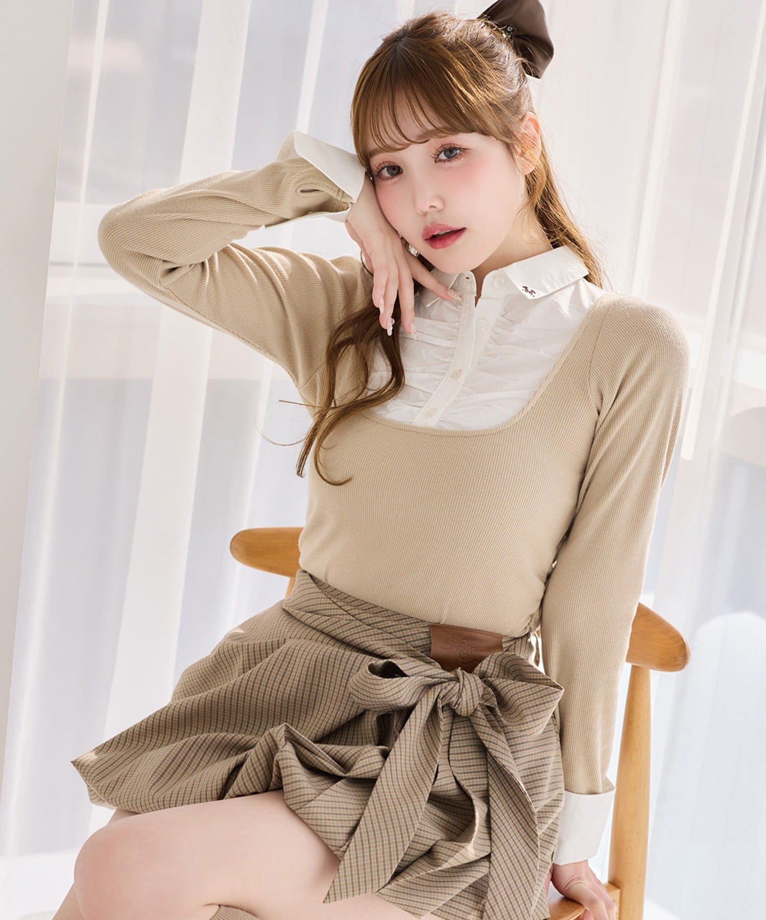 カットソーにシャツがドッキングされた、1枚でレイヤード風に見える万能トップス。
