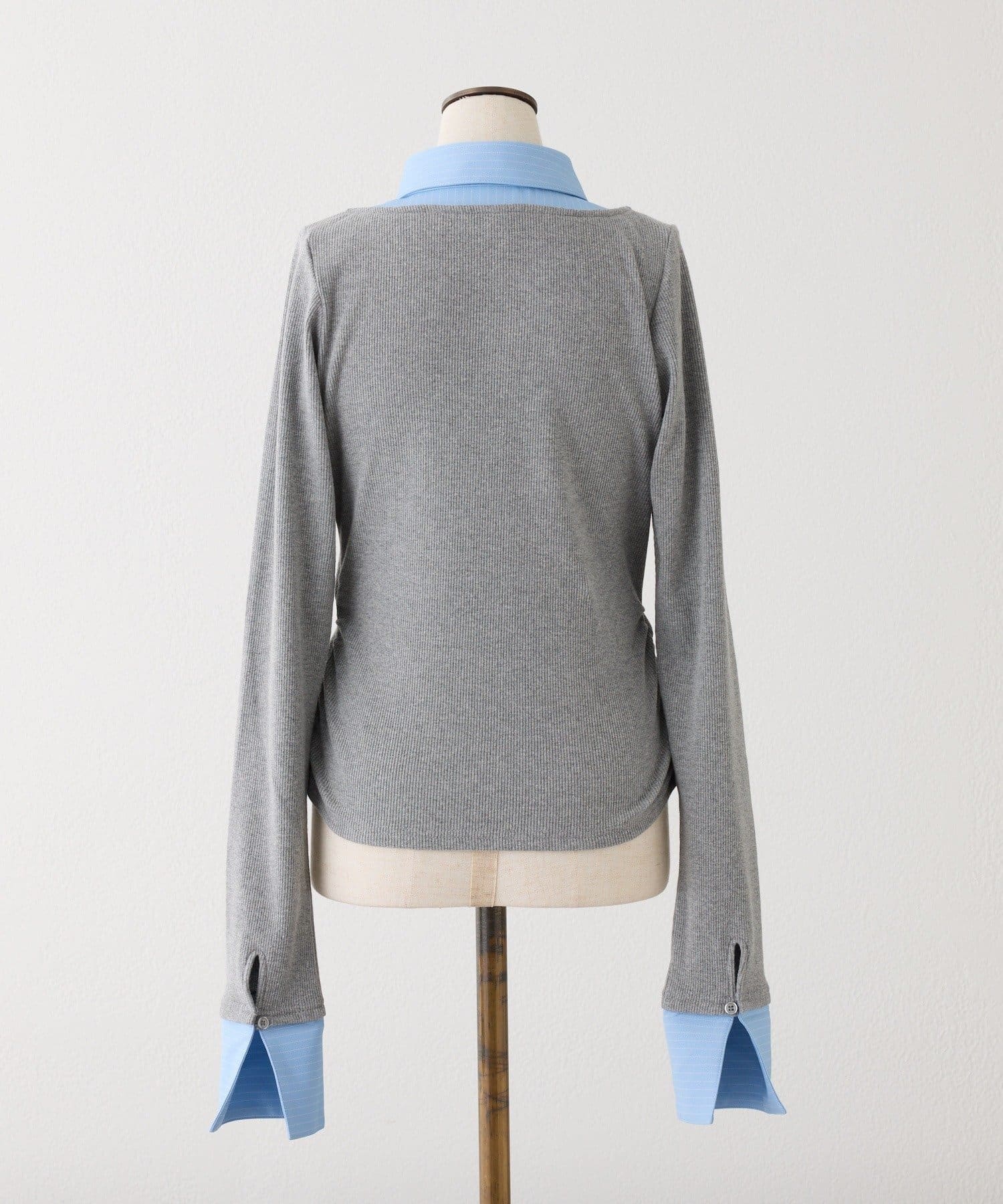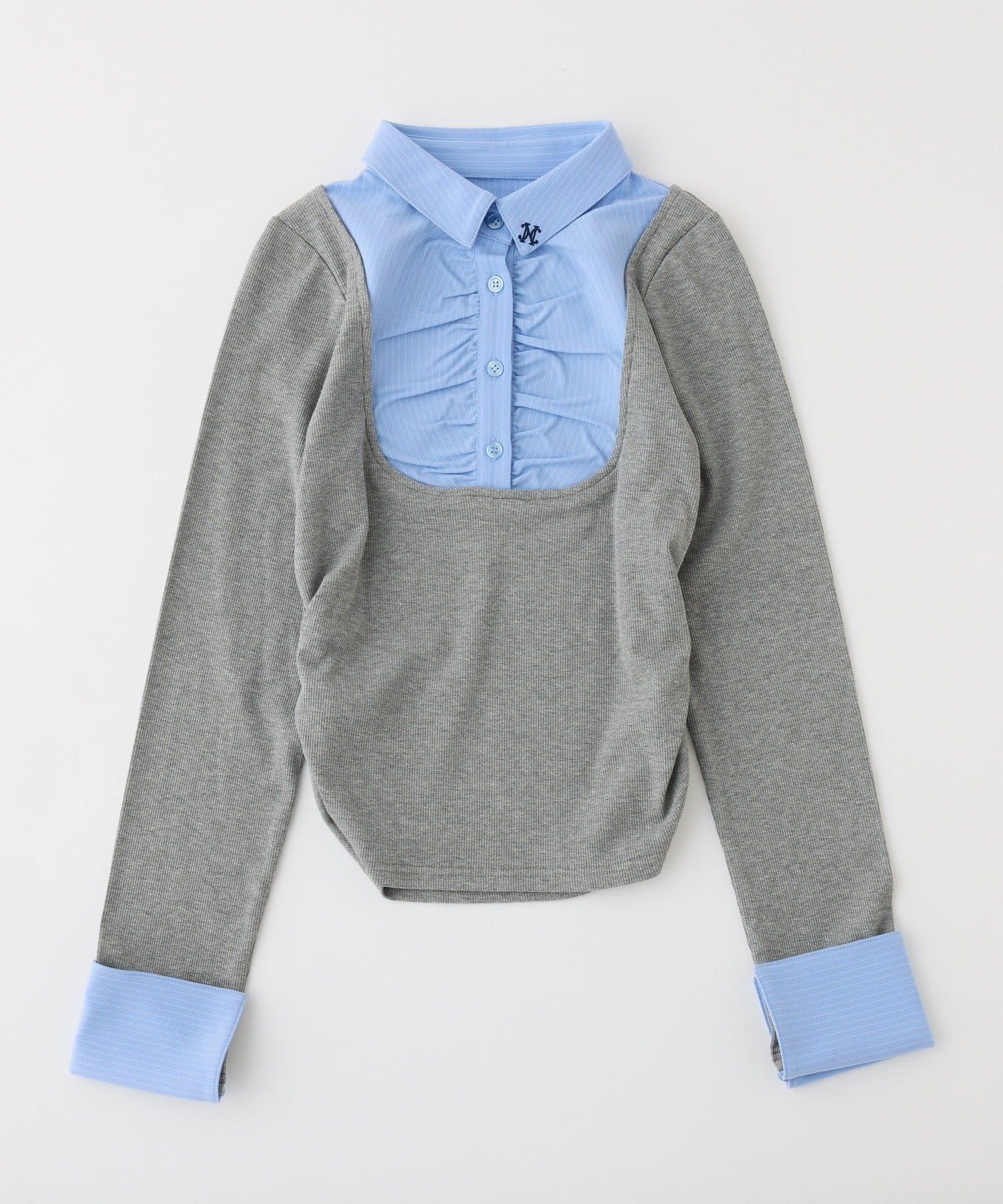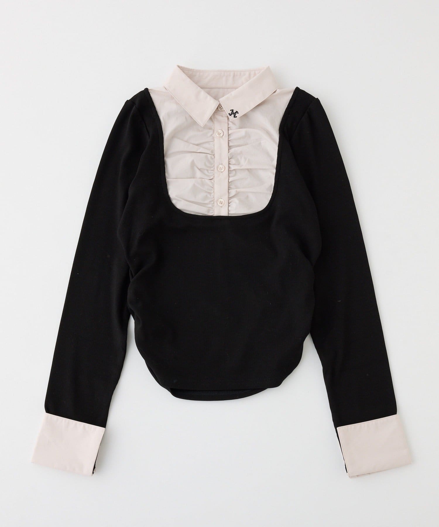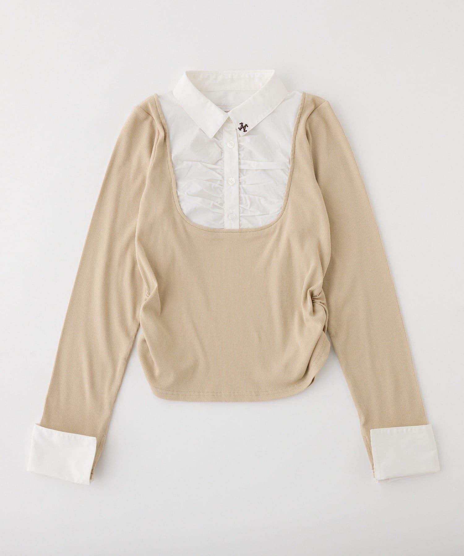 カットソーにシャツがドッキングされた、1枚でレイヤード風に見える万能トップス。