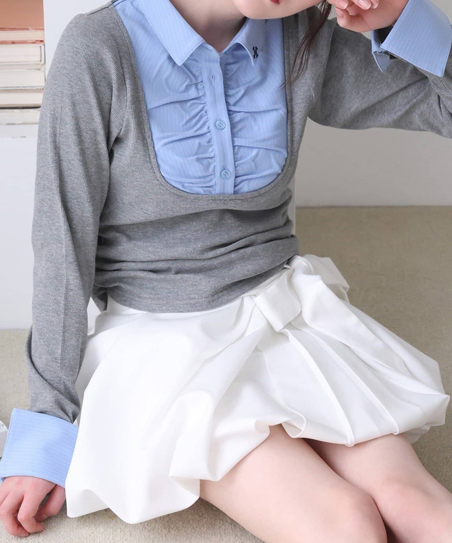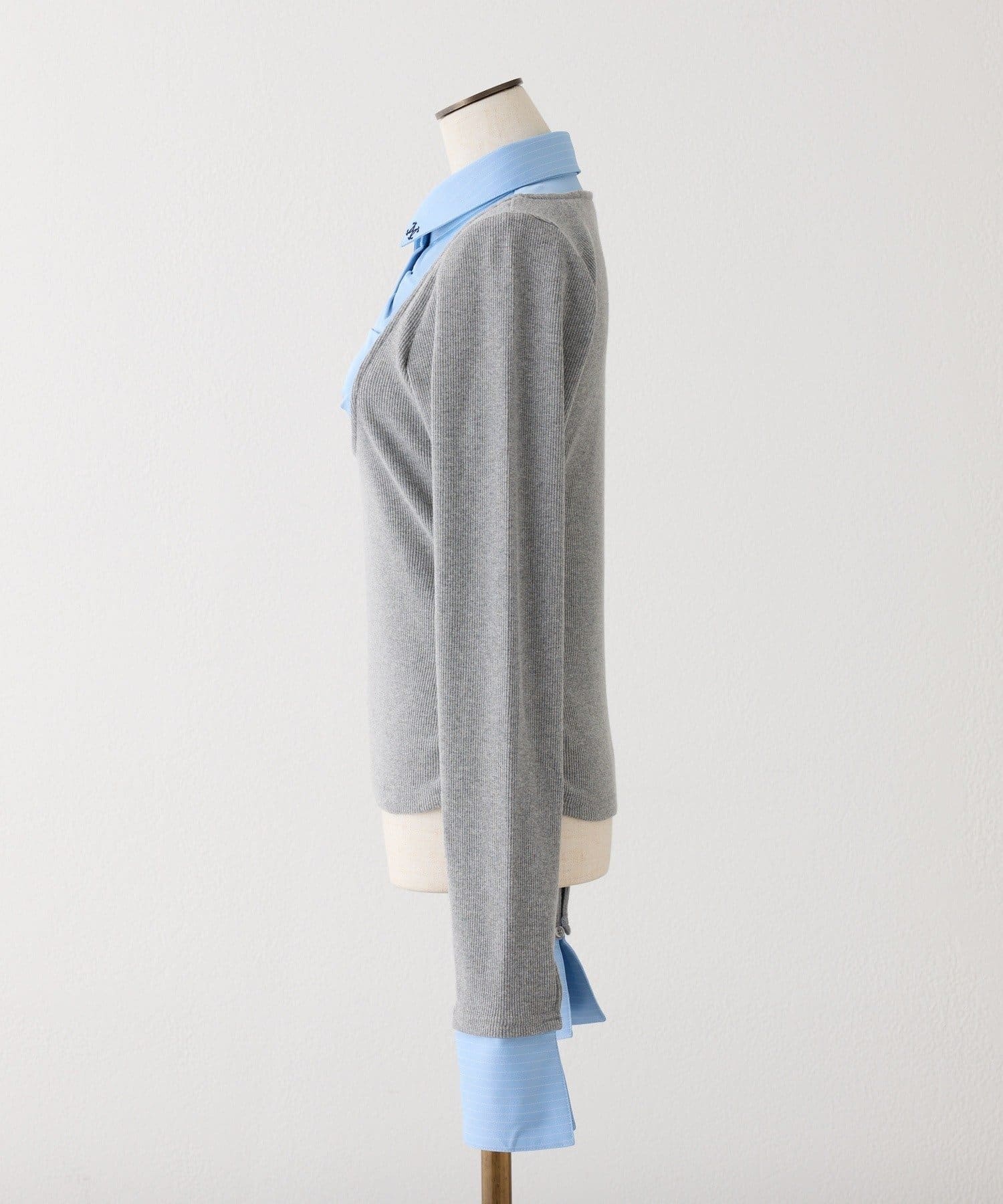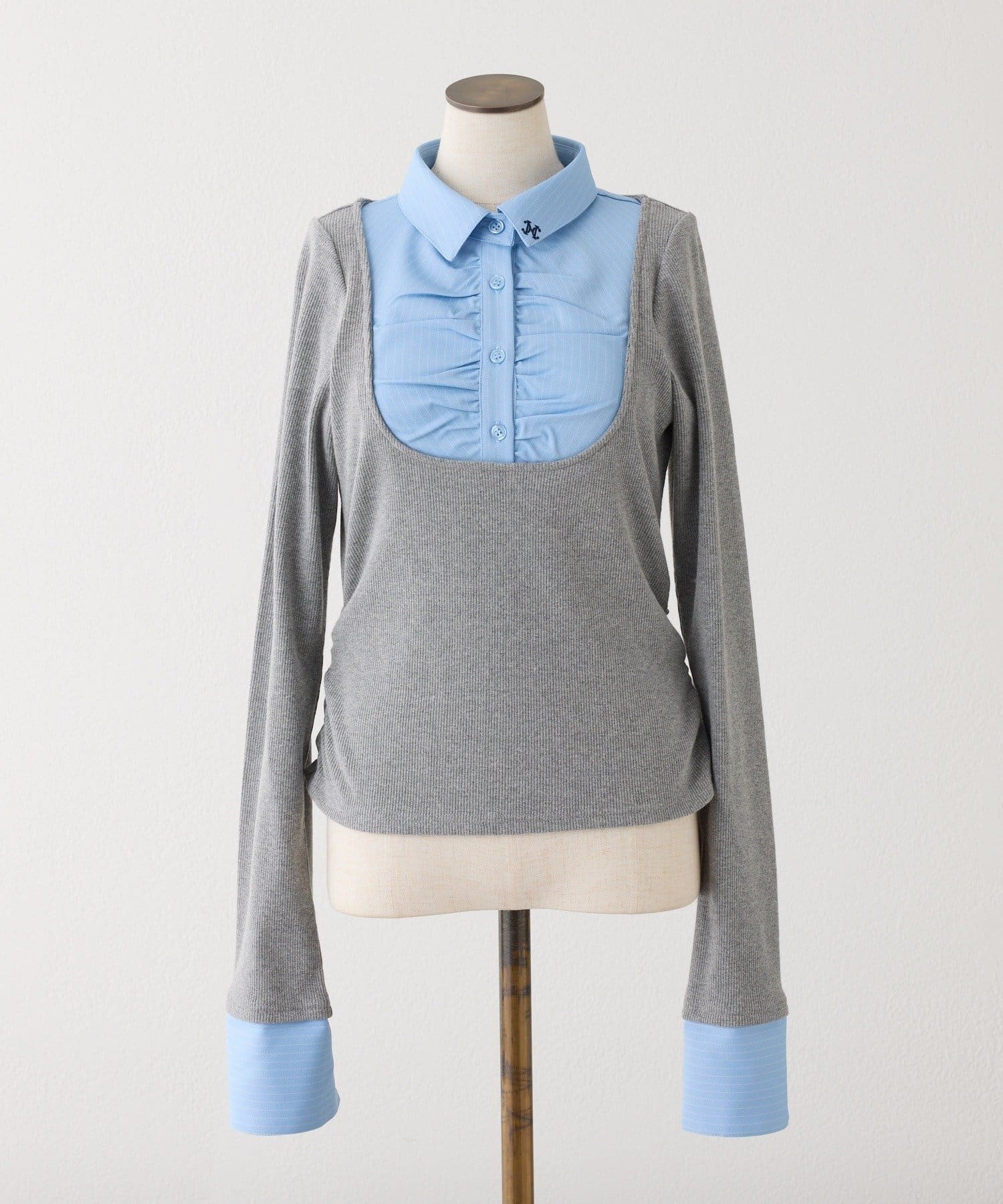 カットソーにシャツがドッキングされた、1枚でレイヤード風に見える万能トップス。