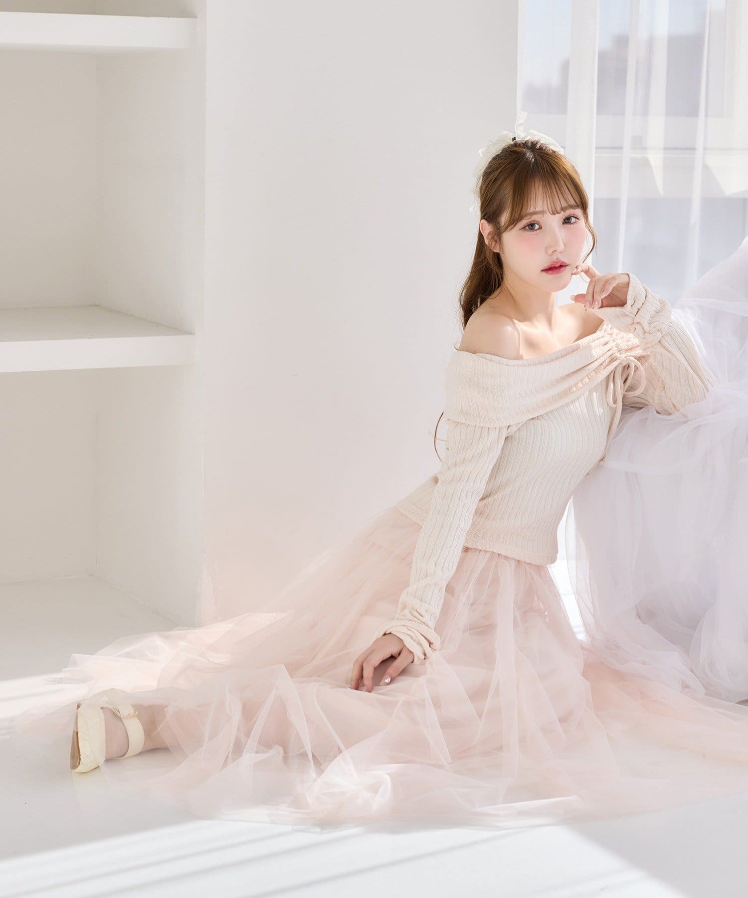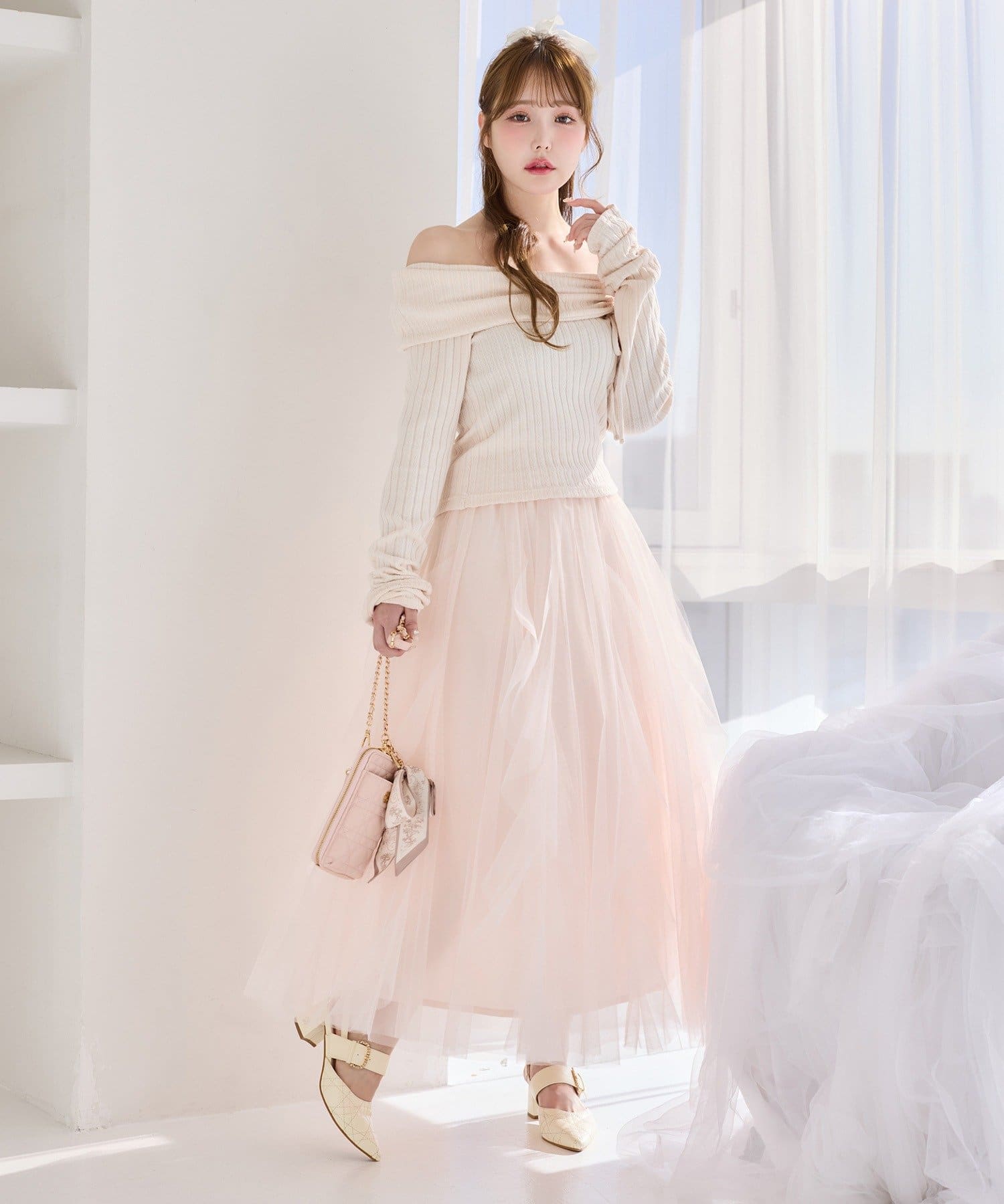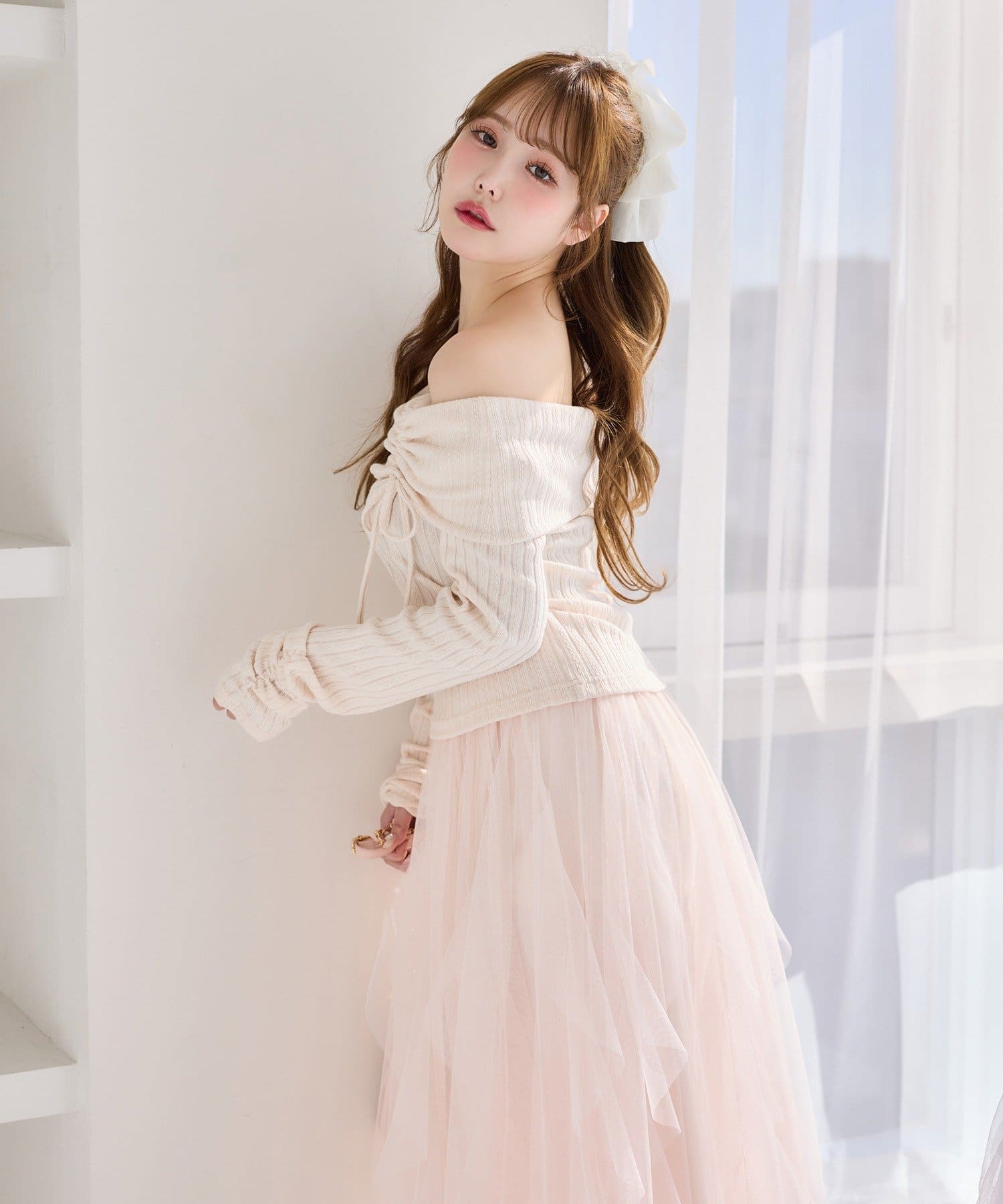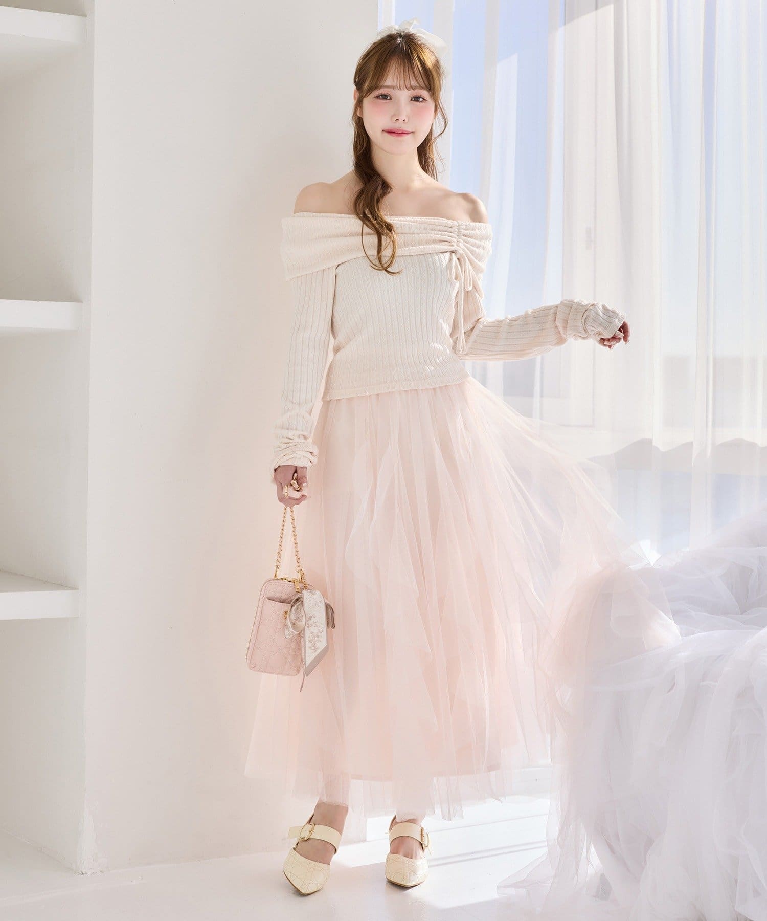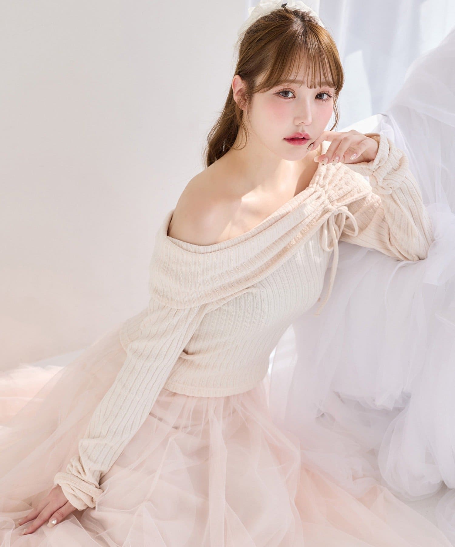 オフショル風のデザインなのでインナーにも困らず着用いただけます。