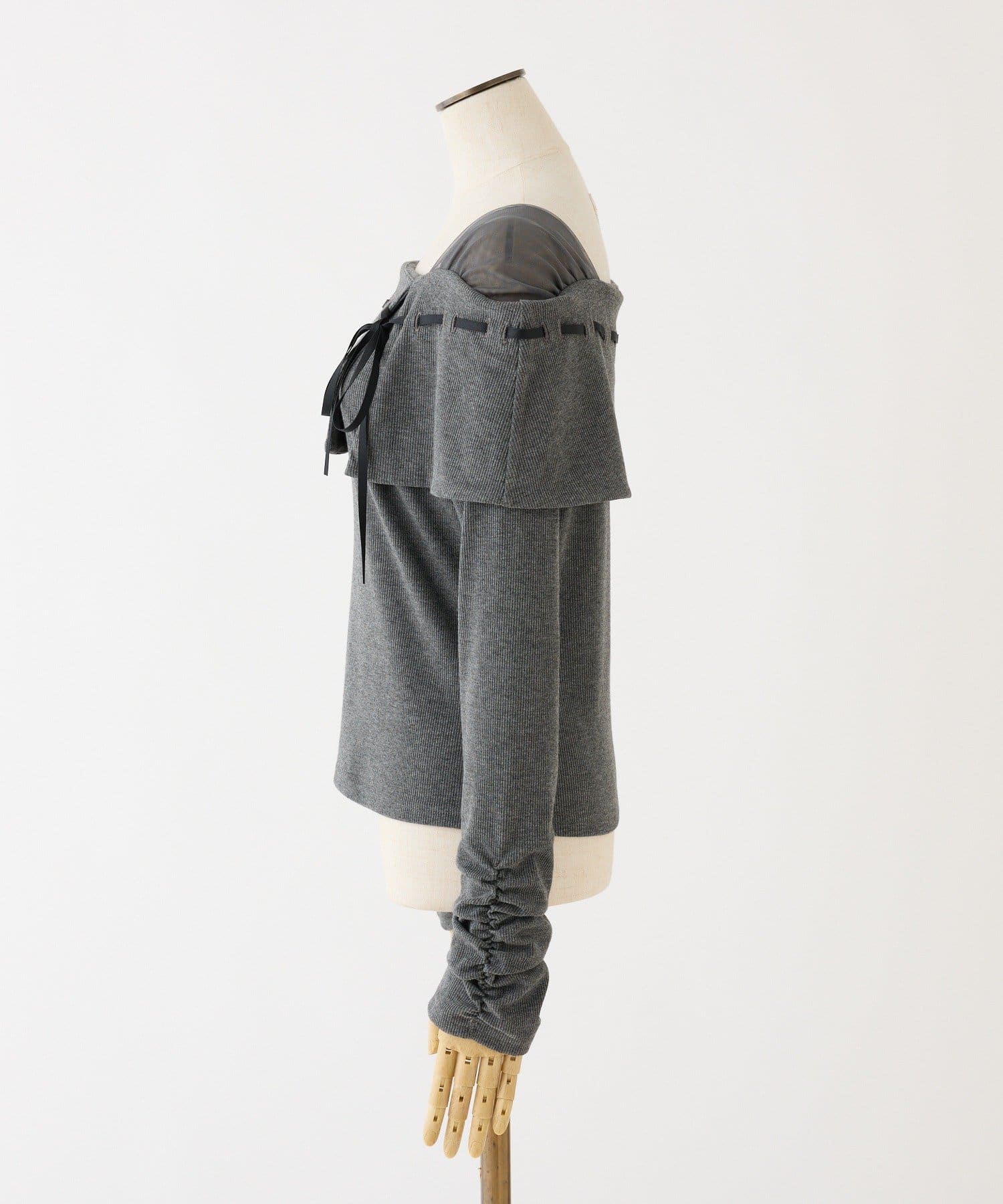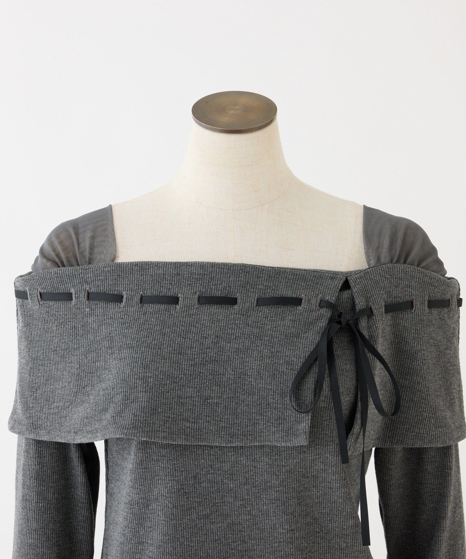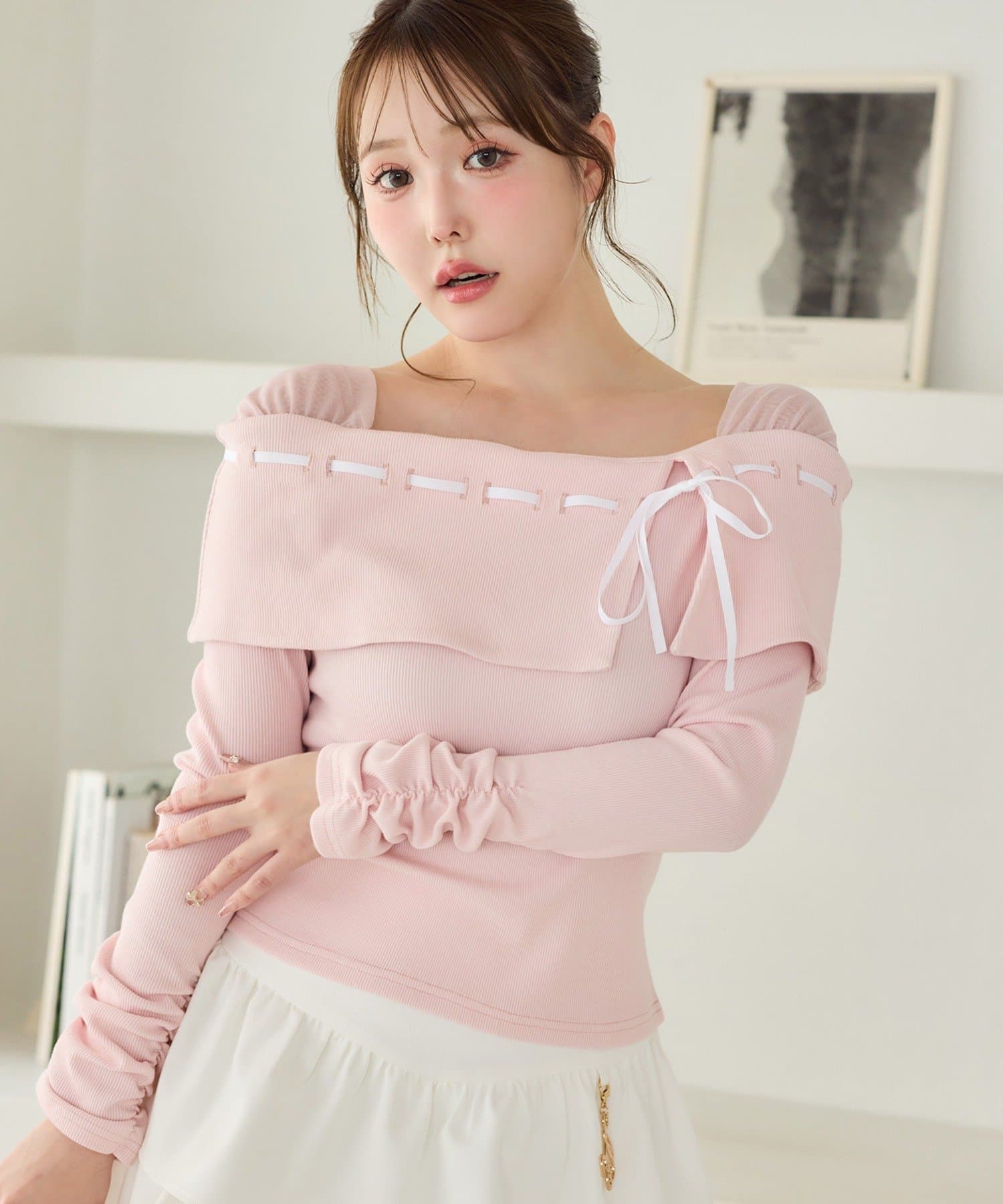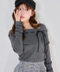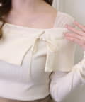ネック部分にはリボンを通したデザインで、さりげない甘さをプラス。