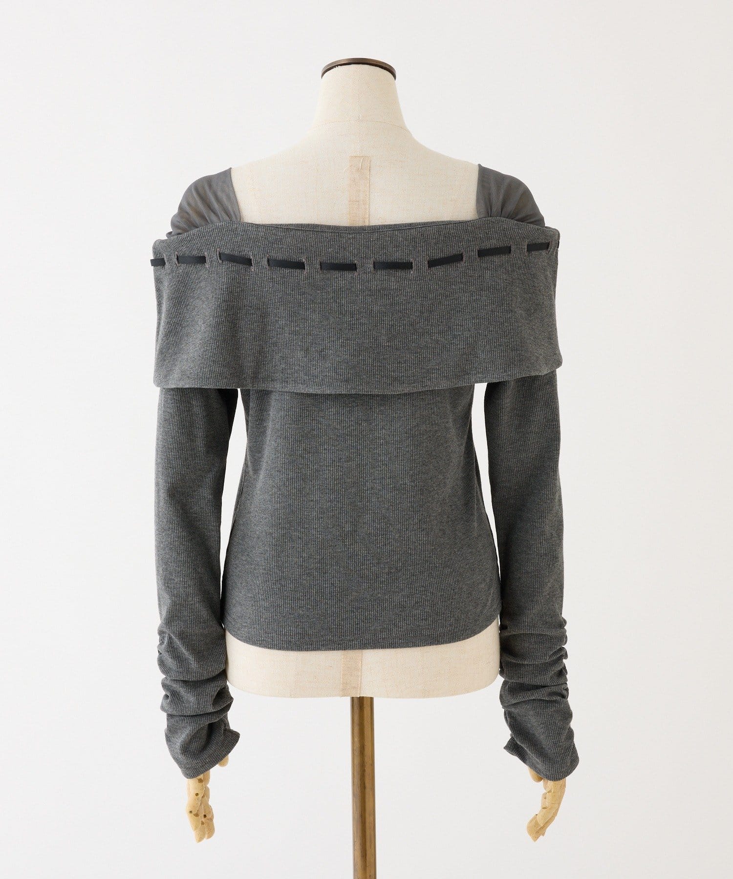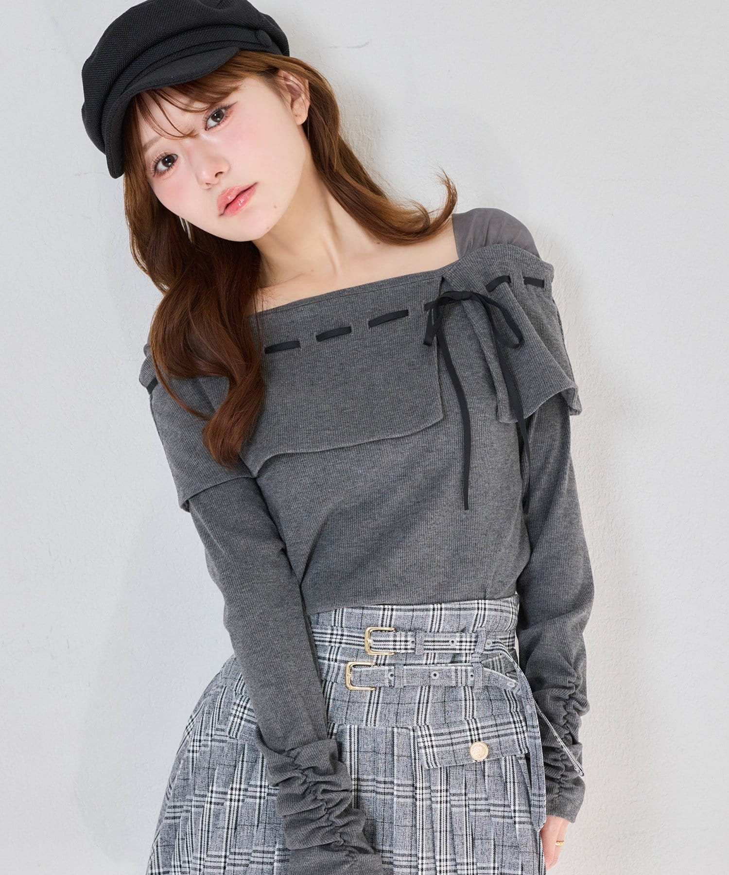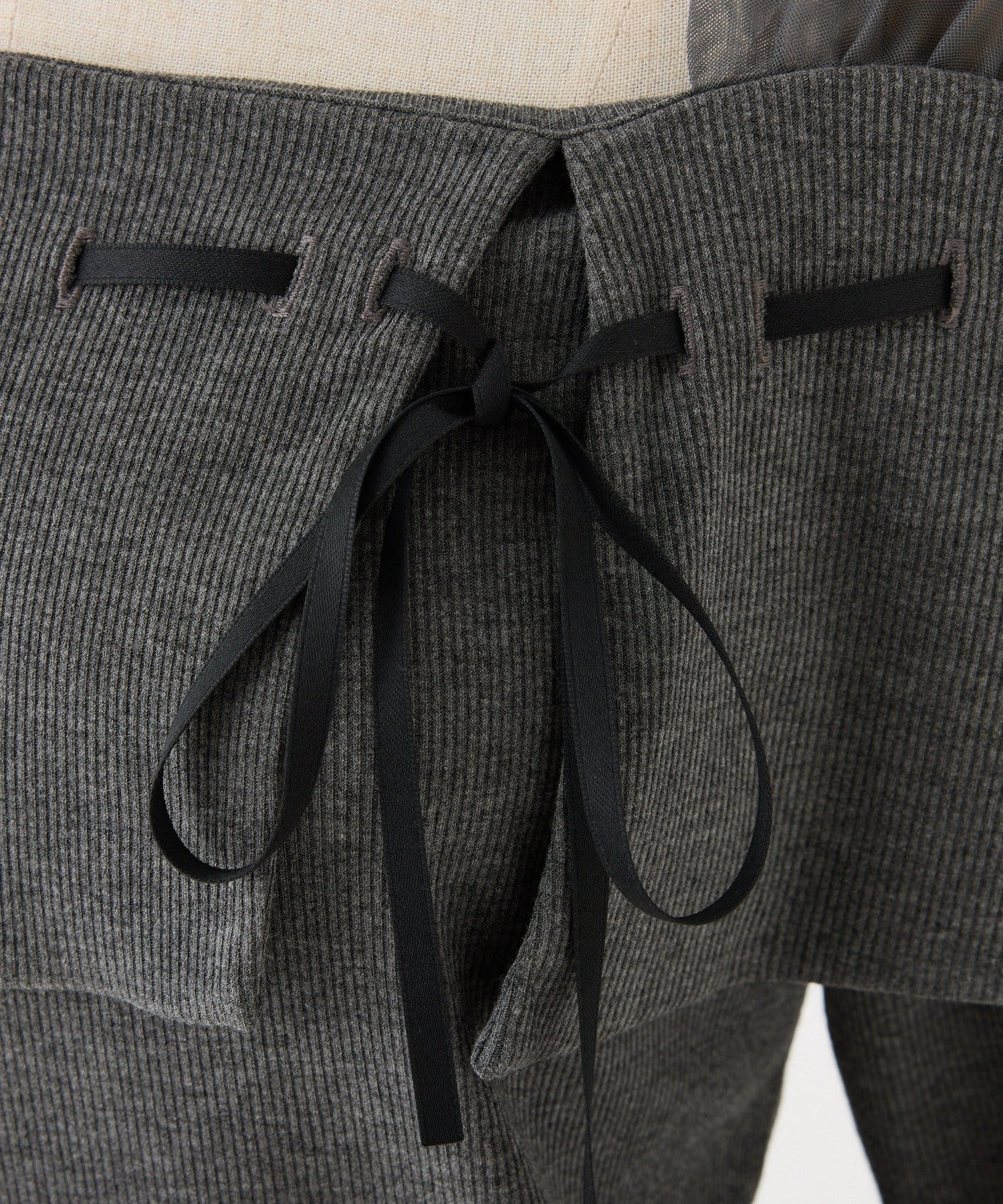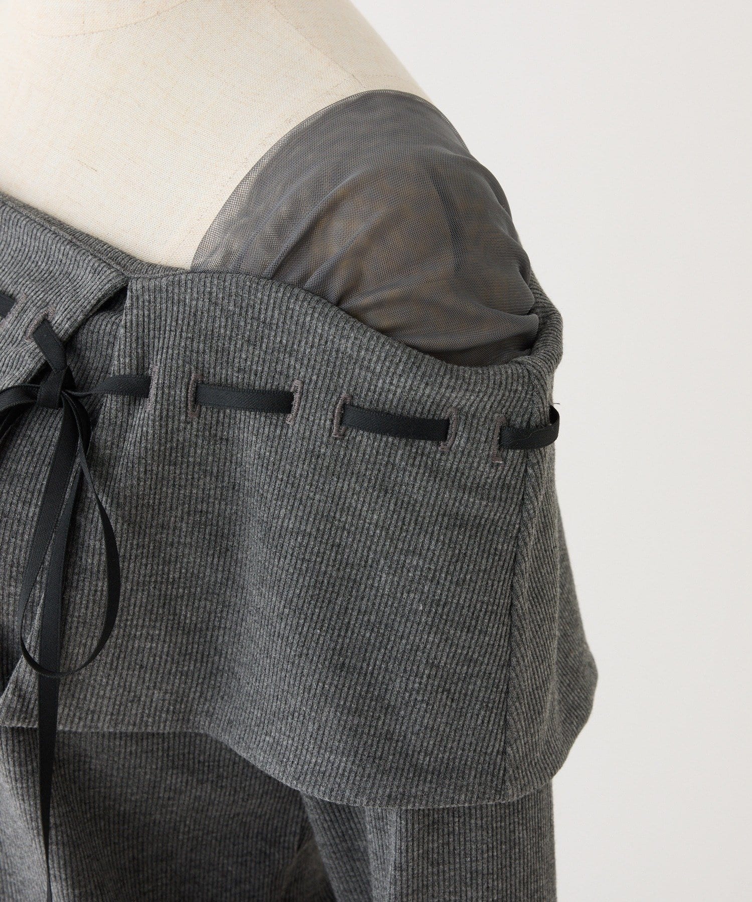 ネック部分にはリボンを通したデザインで、さりげない甘さをプラス。