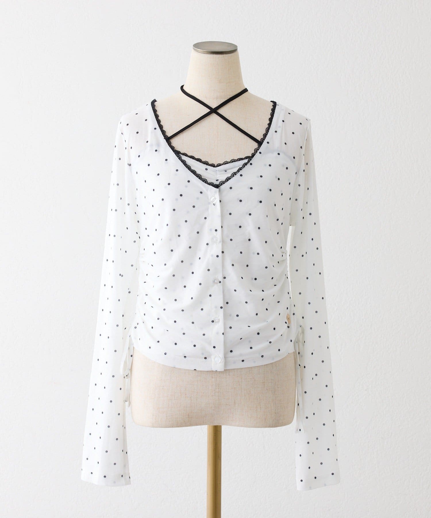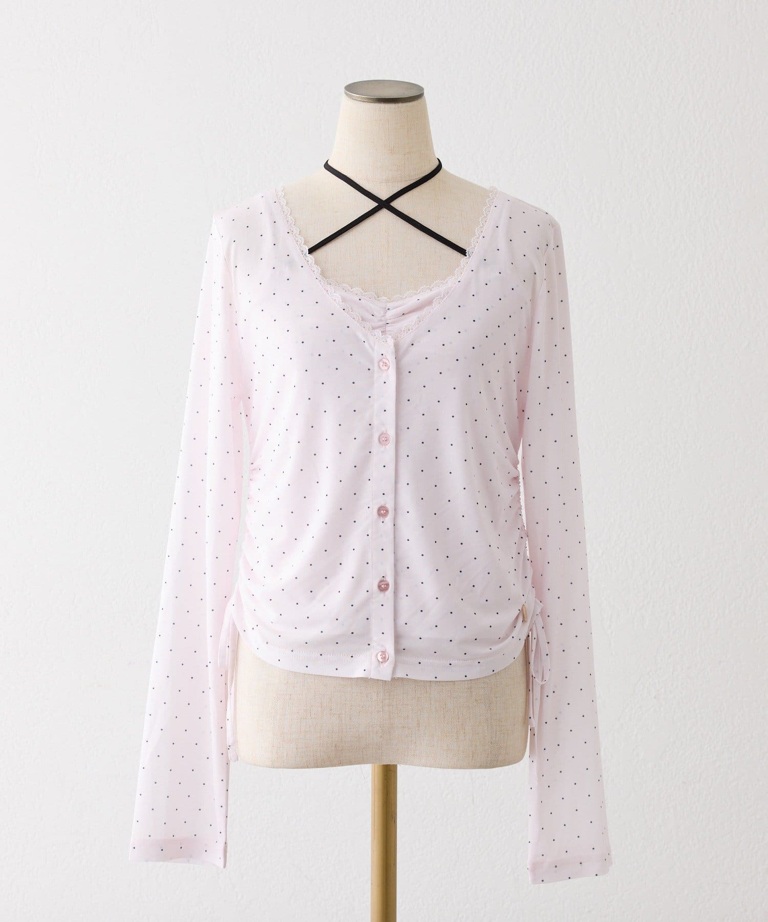 サイドドロストデザインがポイントのカットカーディガンと、同素材キャミのセットアイテム。
