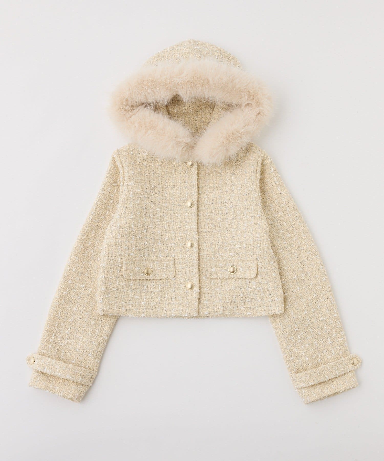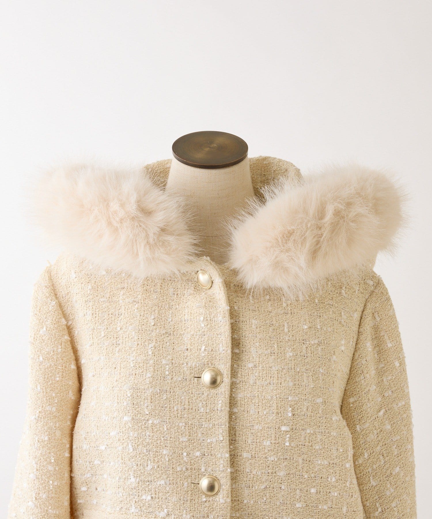 上品なツイード素材に、カジュアルなフードとふわふわファーを組み合わせた主役級アウター。