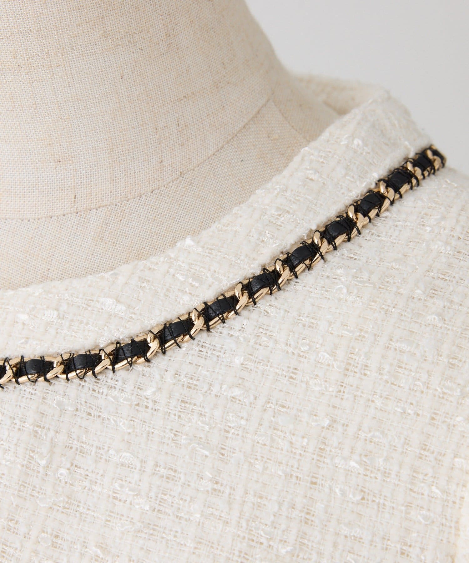 上品なツイード素材に、さりげないチェーンデザインをプラスして華やかな印象に仕上げました。