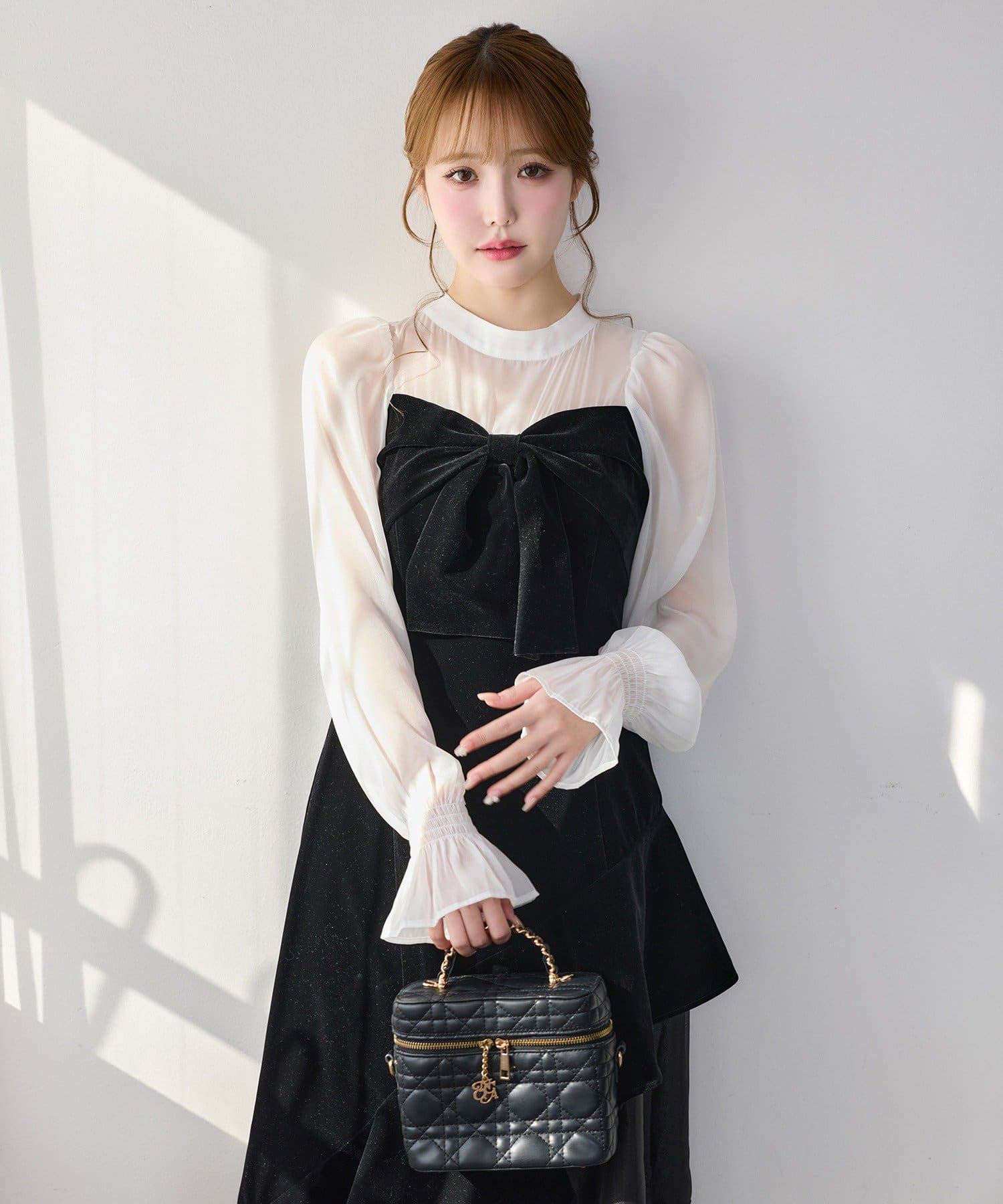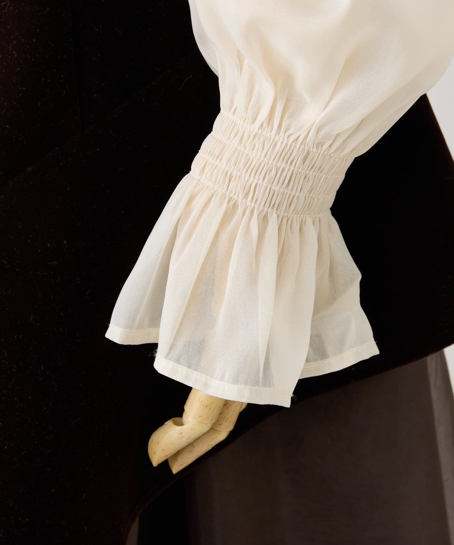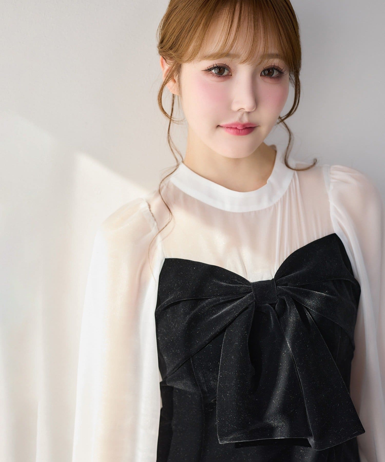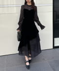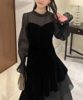 本体は上品な光沢のあるベロア素材、袖とデコルテラインはシアーに切り替え、抜け感をプラス。