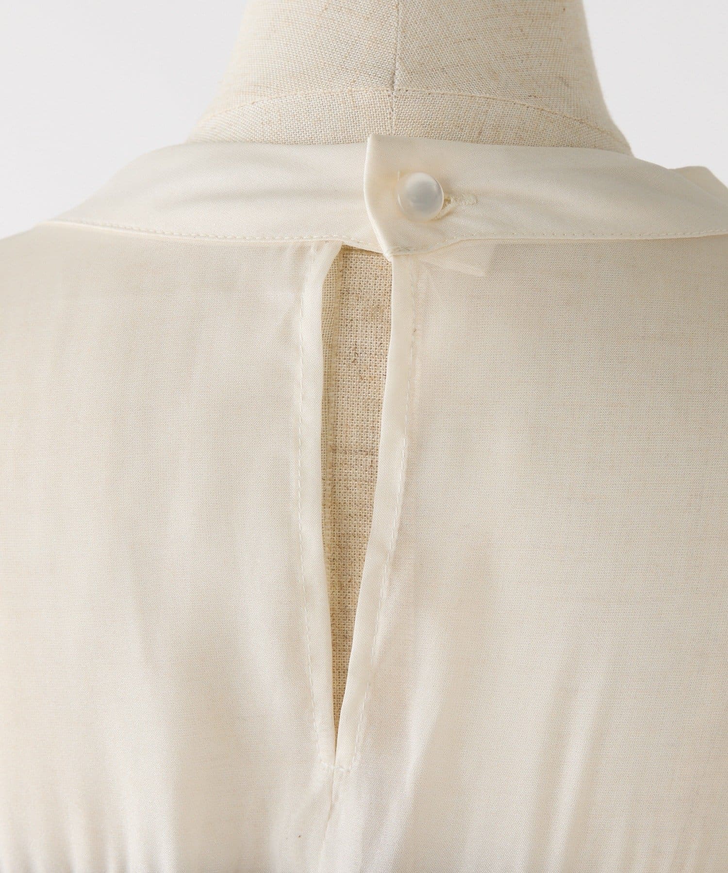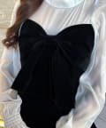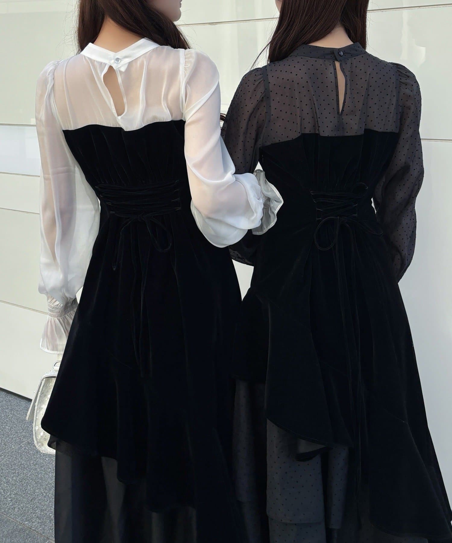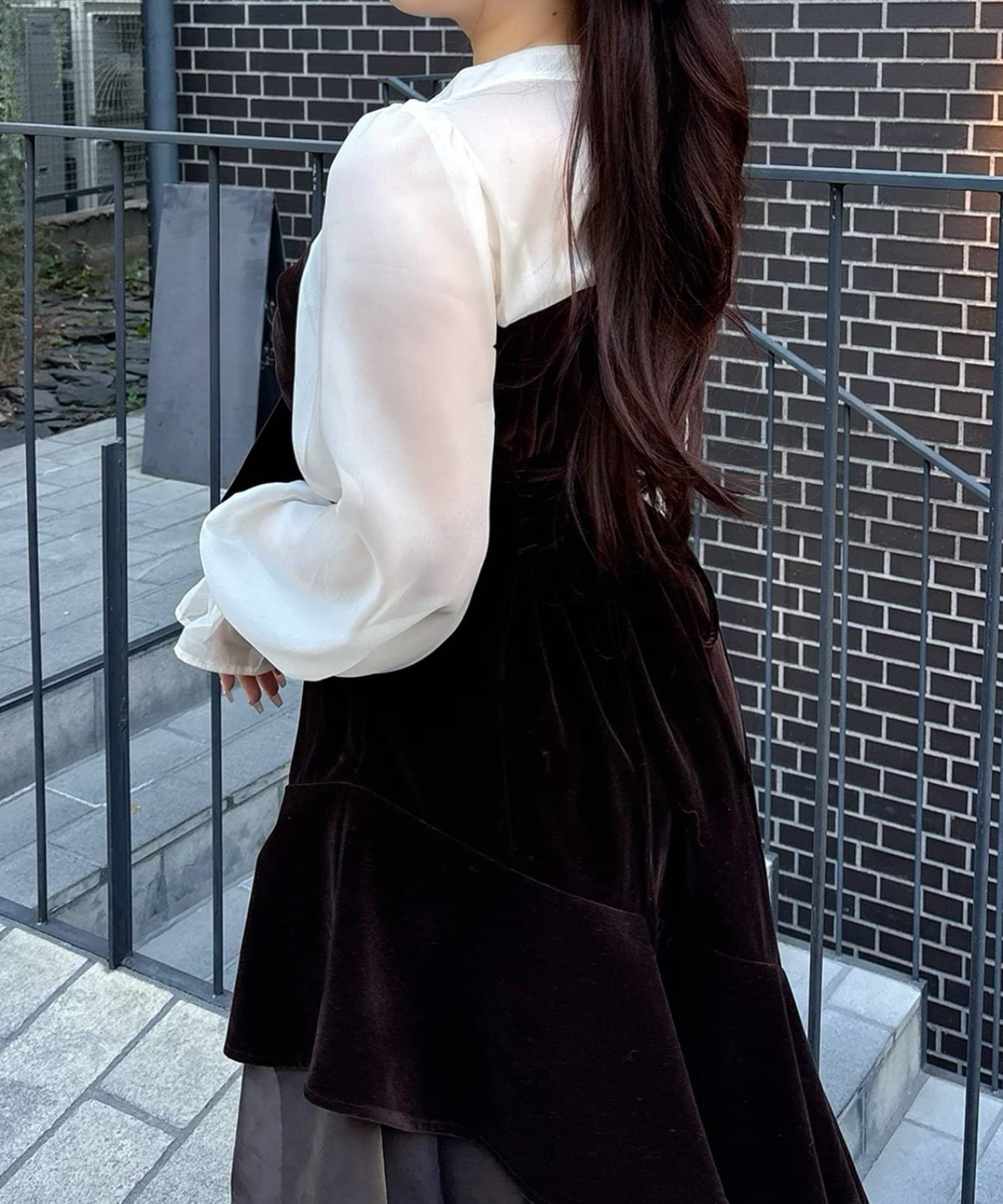 本体は上品な光沢のあるベロア素材、袖とデコルテラインはシアーに切り替え、抜け感をプラス。