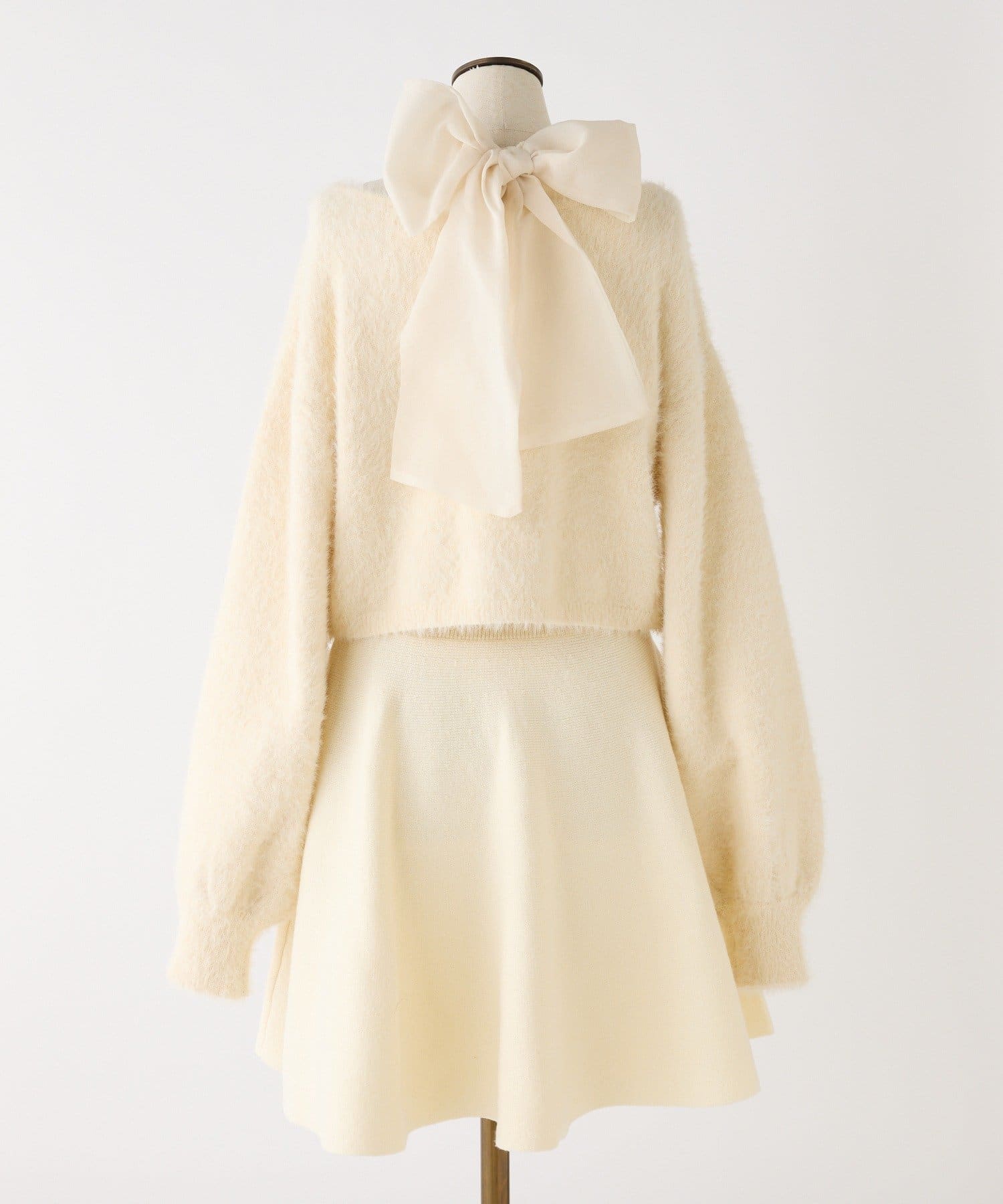 アメスリデザインのニットミニワンピに、バックスタイルを盛り上げるシアーリボンをプラス。