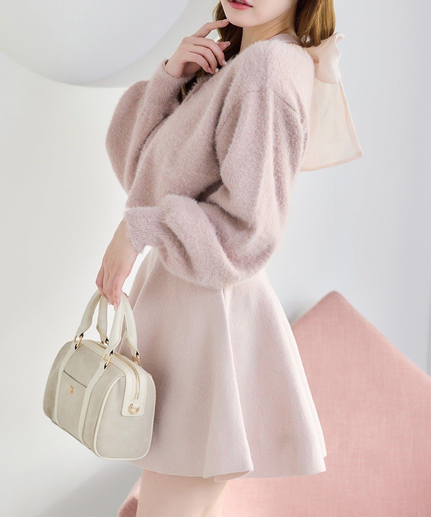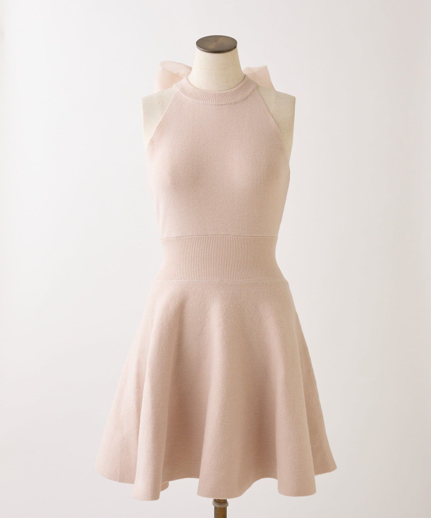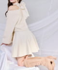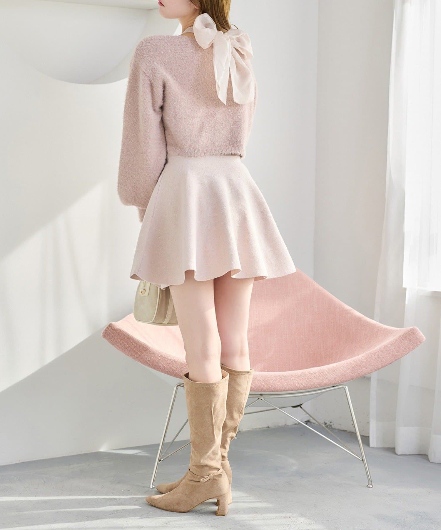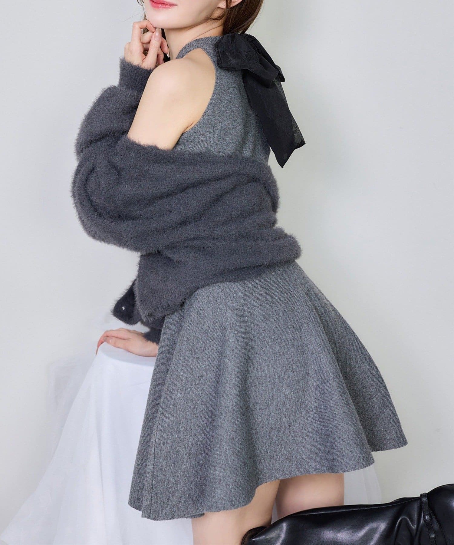 アメスリデザインのニットミニワンピに、バックスタイルを盛り上げるシアーリボンをプラス。