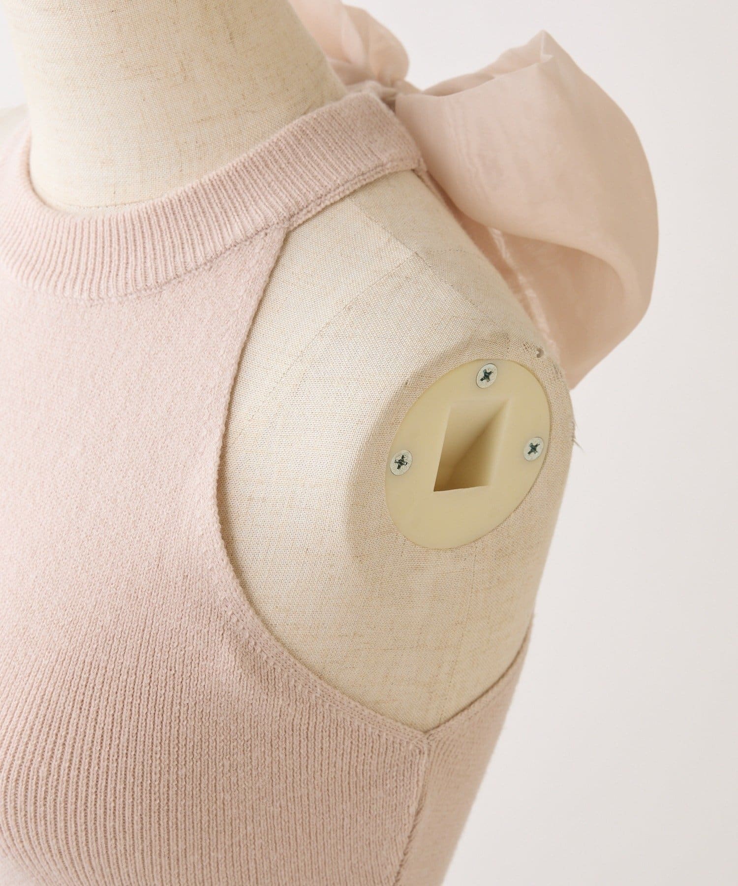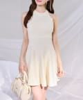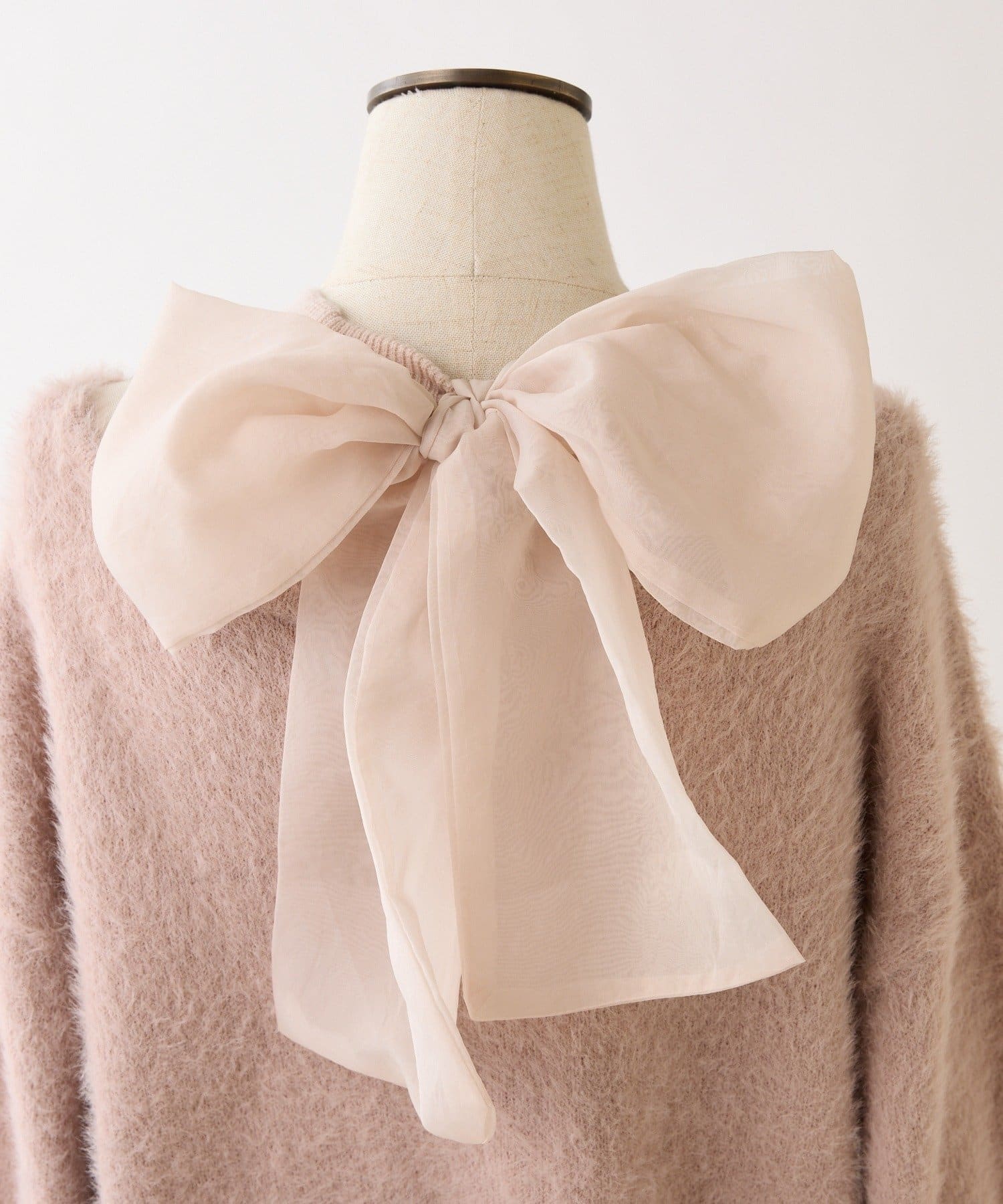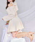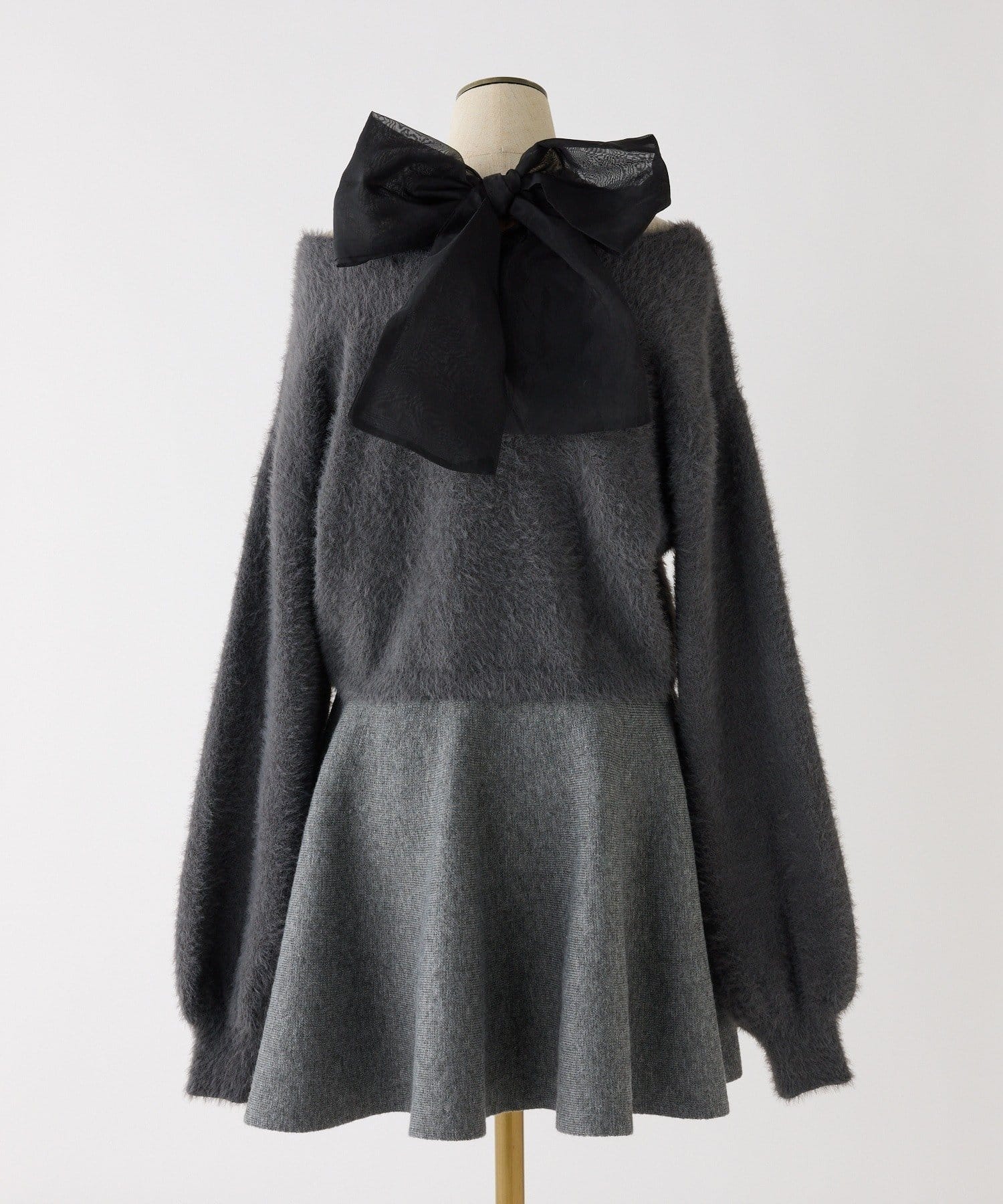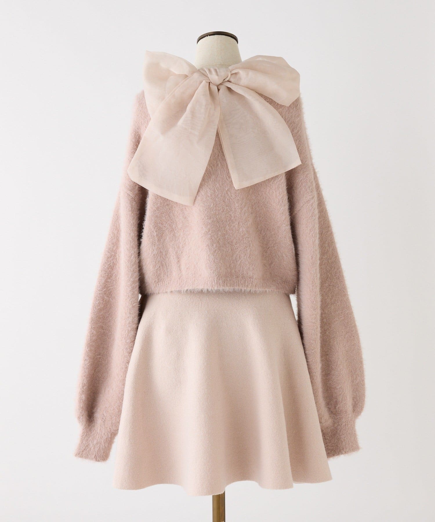 アメスリデザインのニットミニワンピに、バックスタイルを盛り上げるシアーリボンをプラス。
