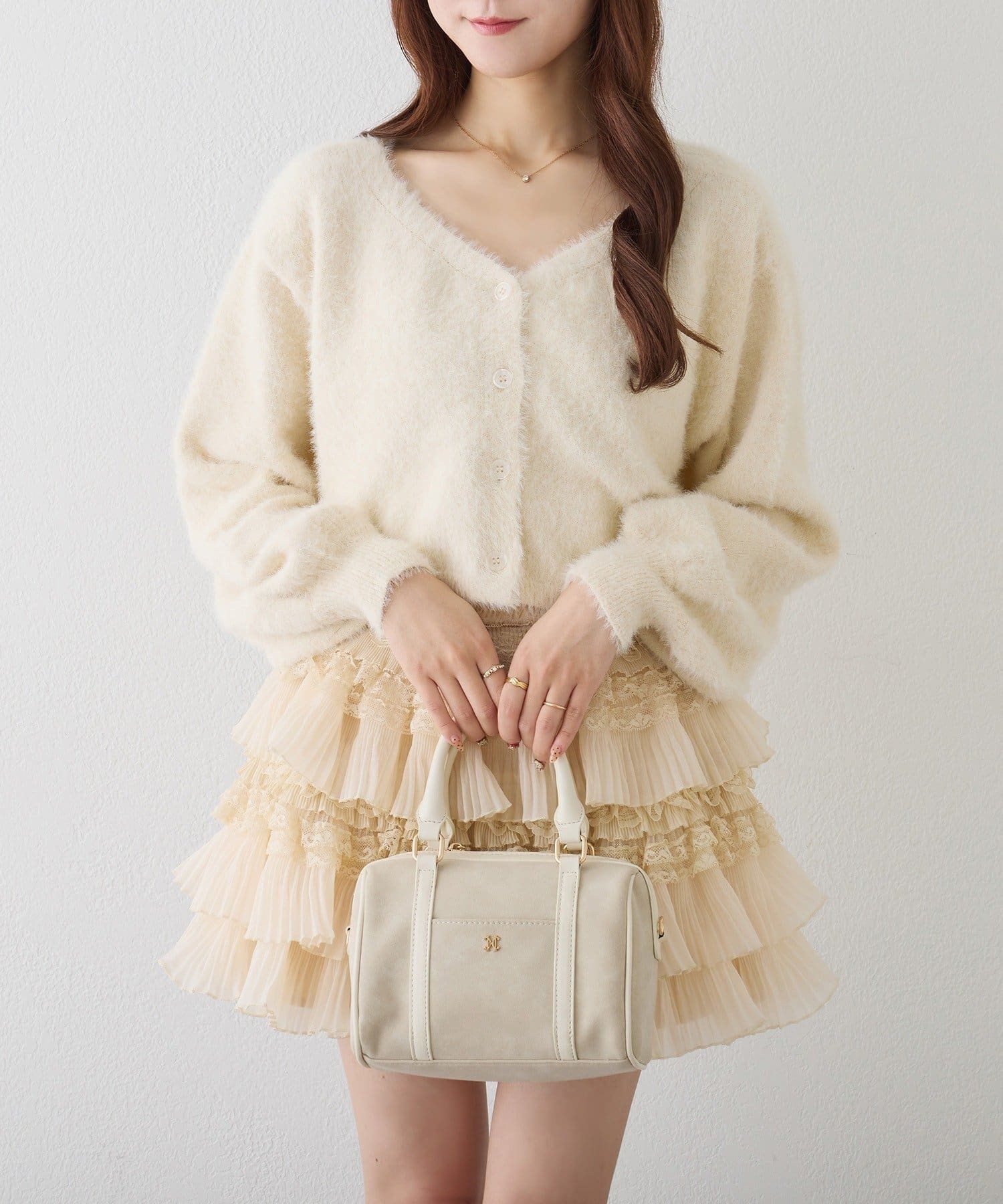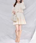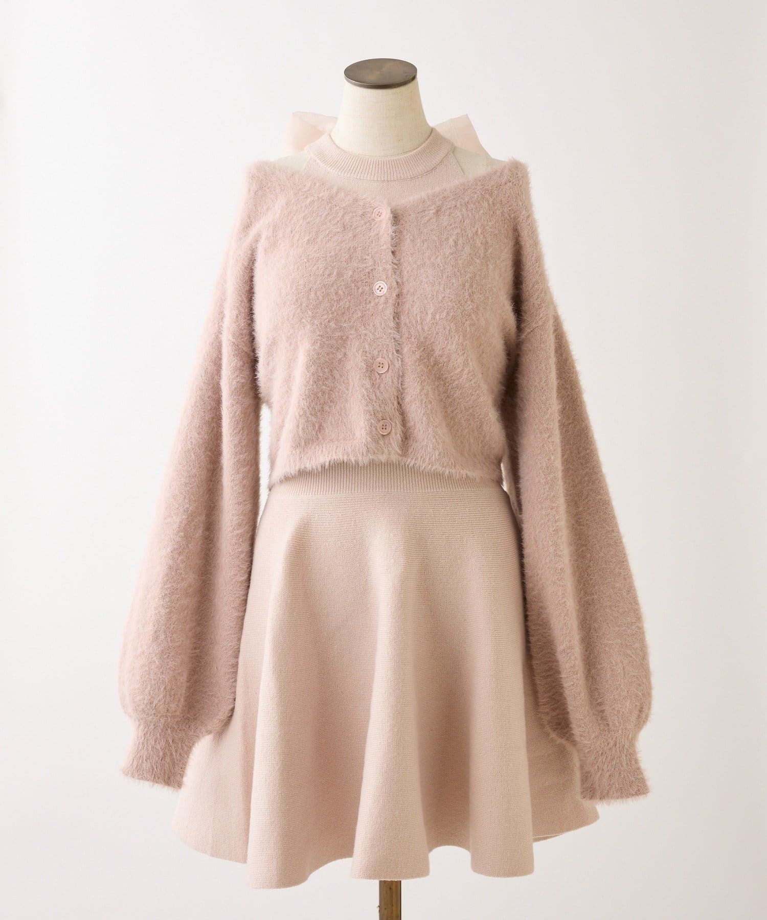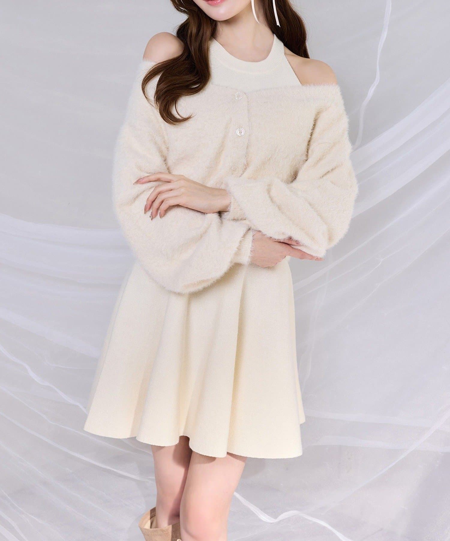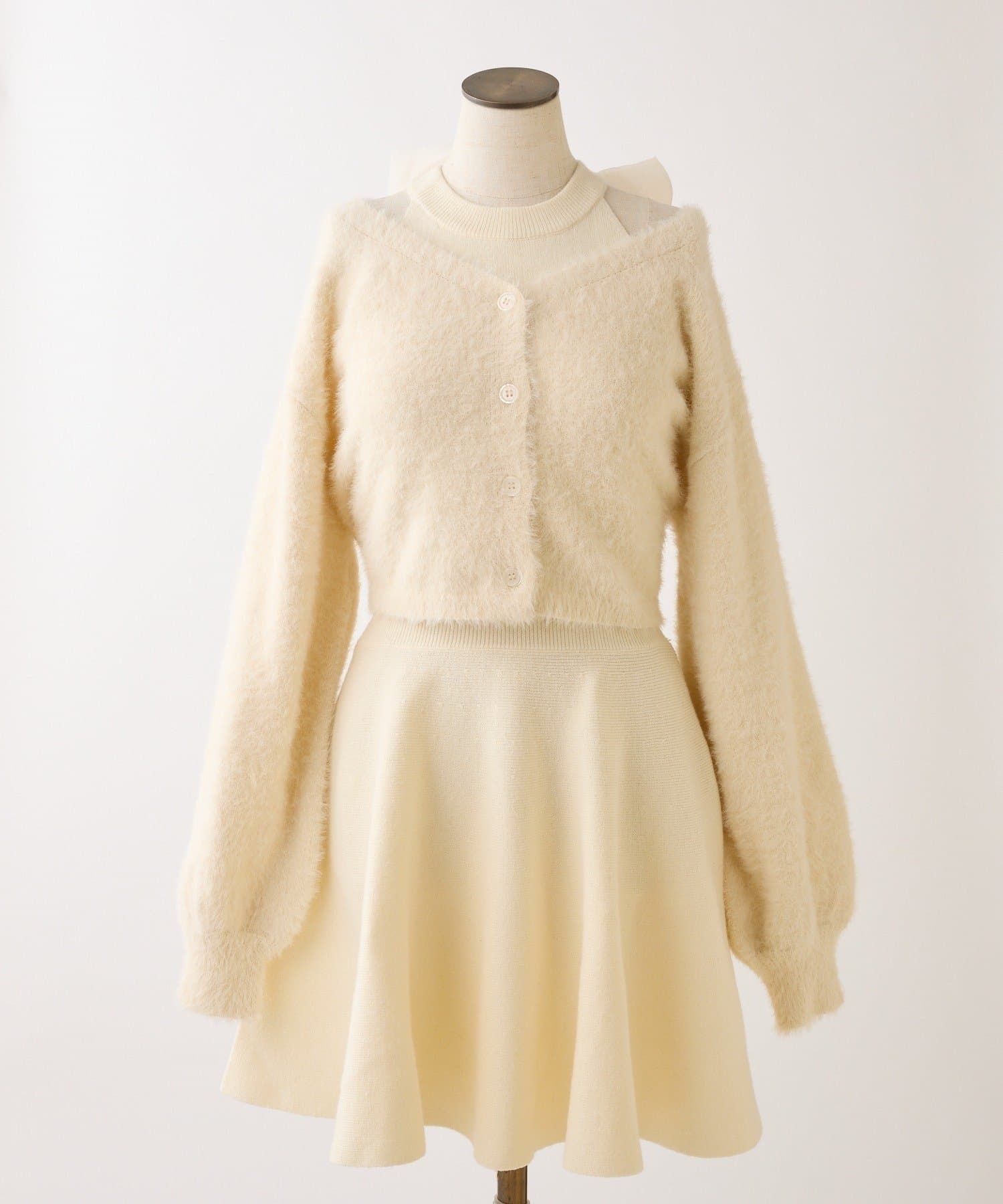 ふわふわのフェザーカーデがセットになった、着るだけで可愛いコーデが完成する