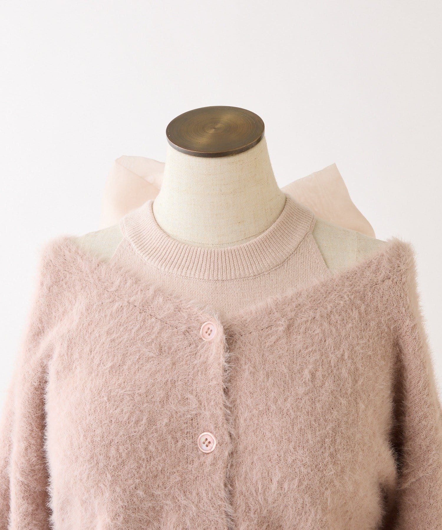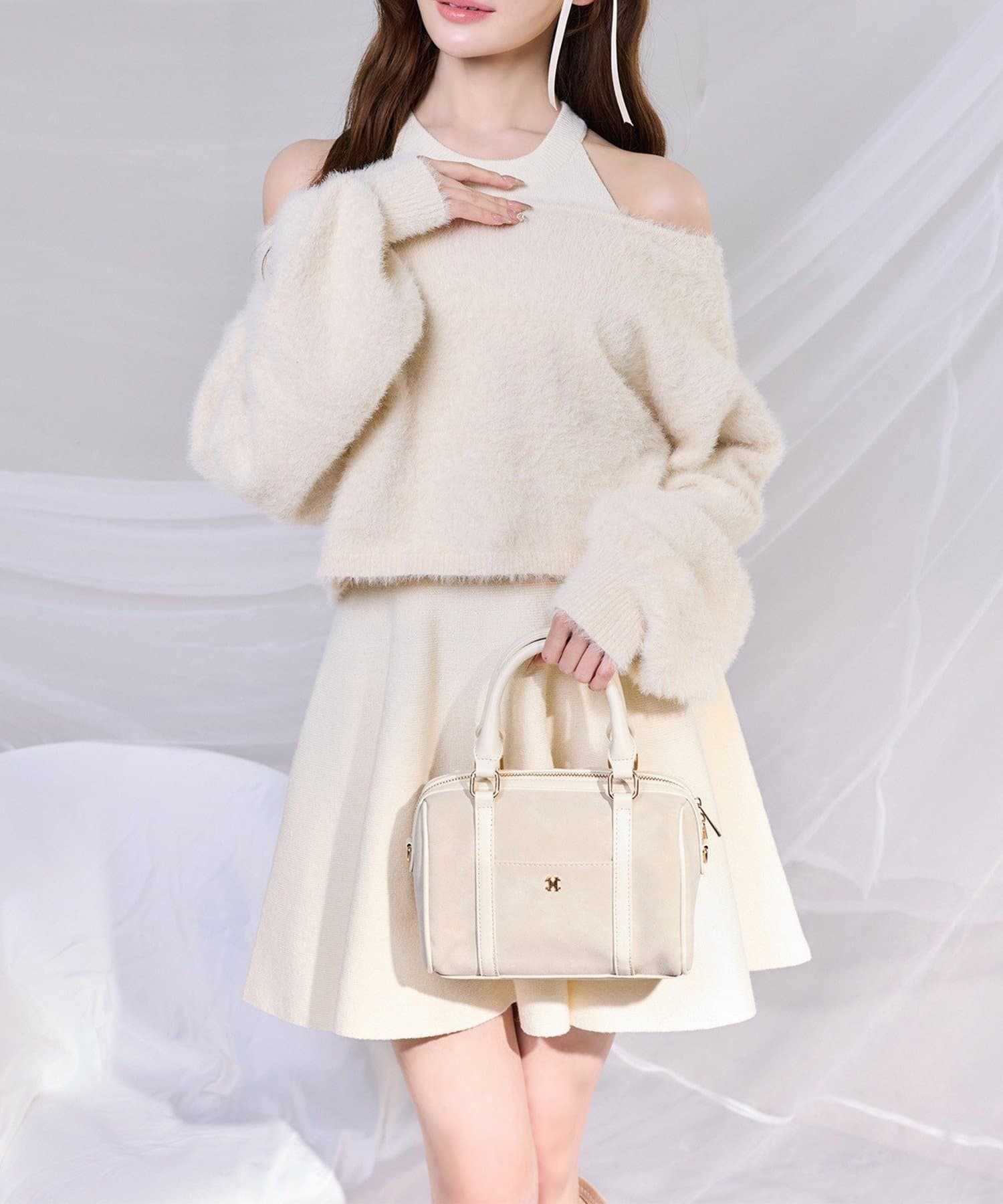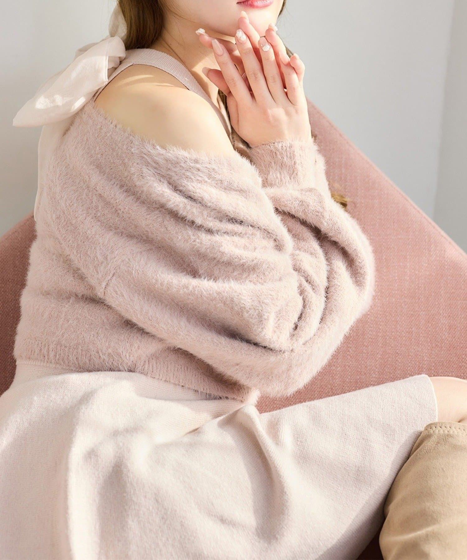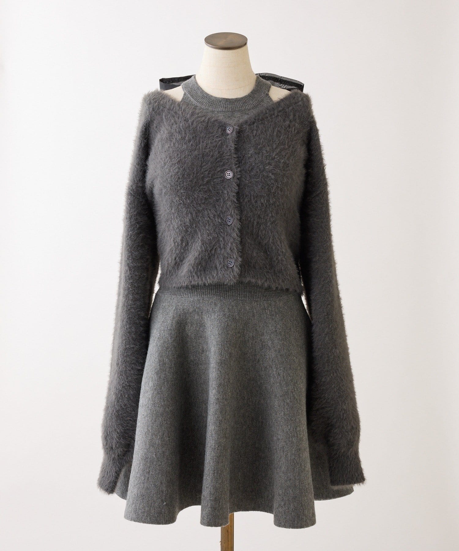 ふわふわのフェザーカーデがセットになった、着るだけで可愛いコーデが完成する