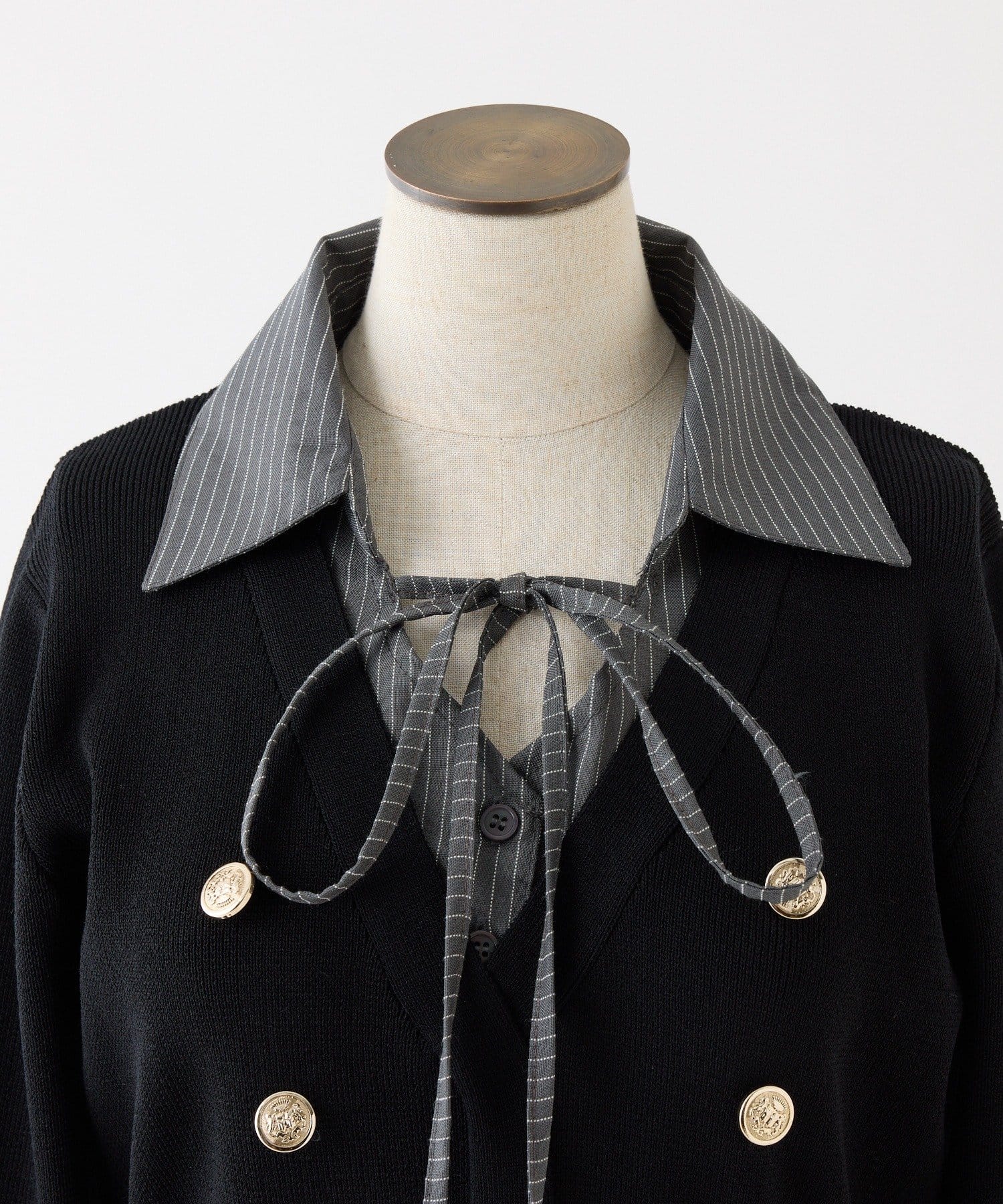 胸元のリボンがさりげないアクセントになり、顔まわりを華やかに見せてくれます。