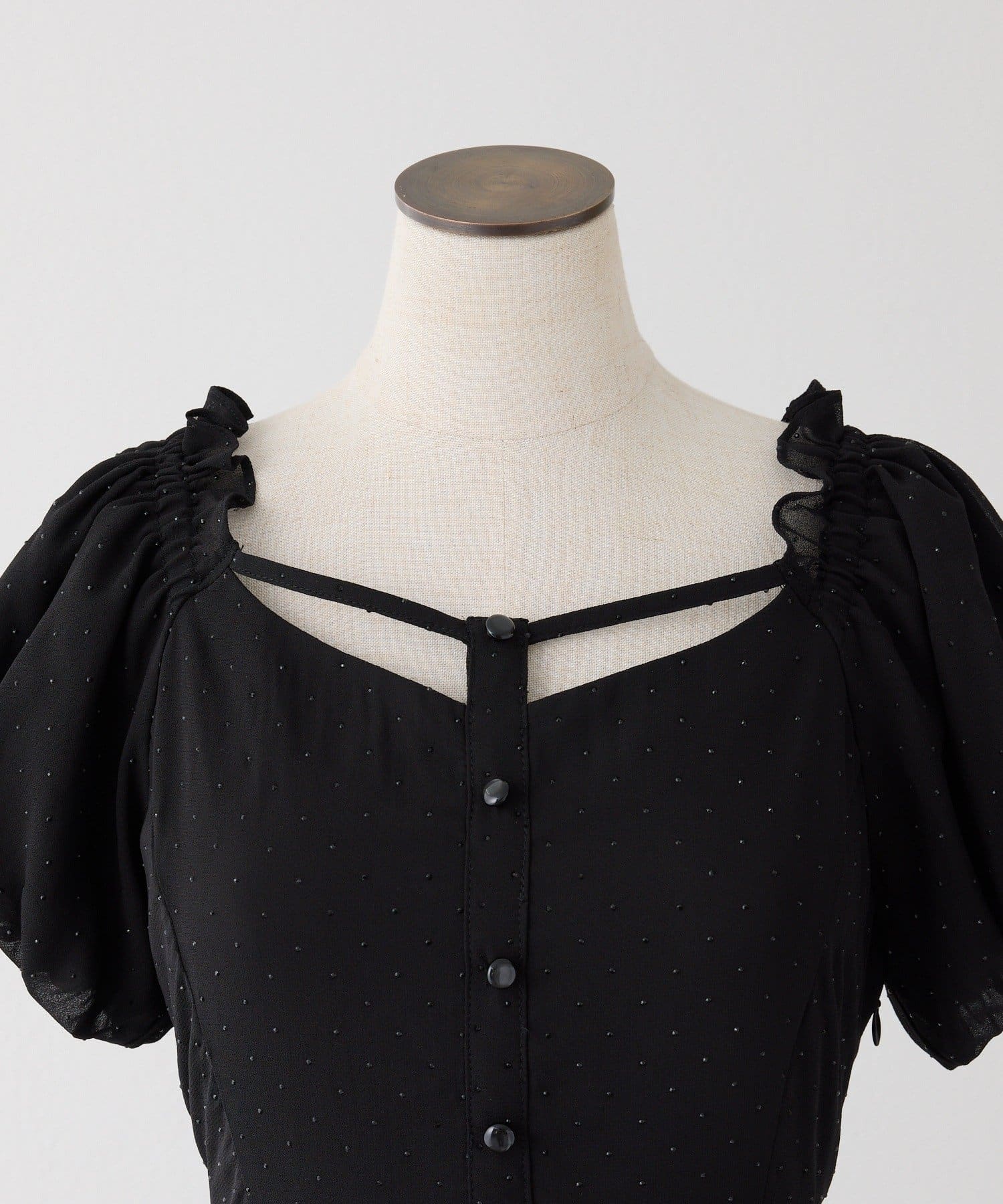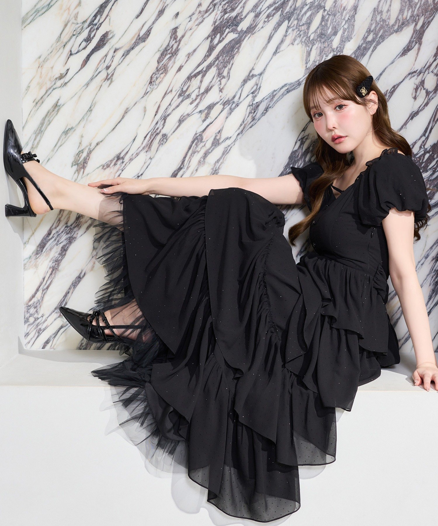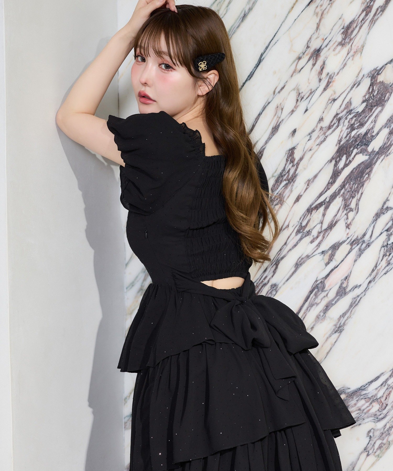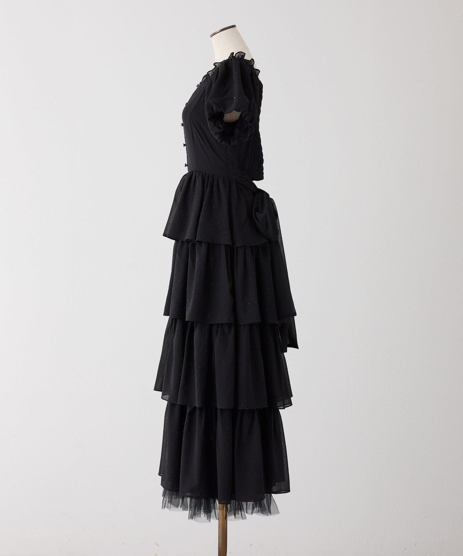 ボリューム感のあるパフスリーブとティアードデザインが、女性らしく華やかな印象を演出してくれます。