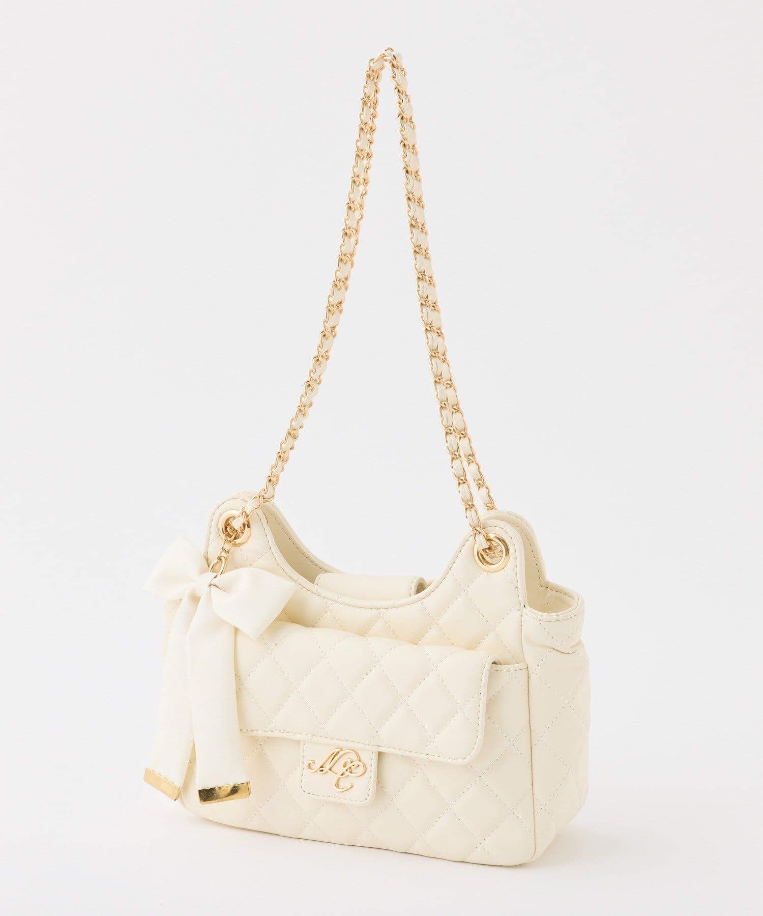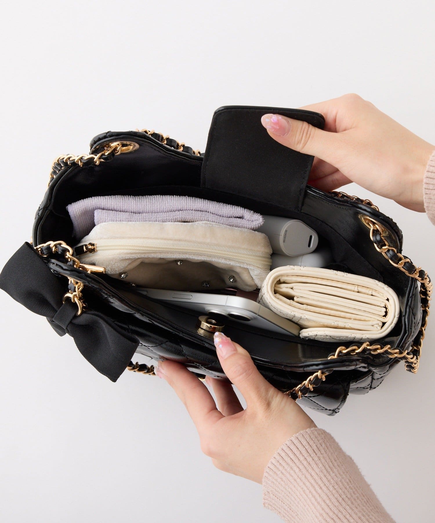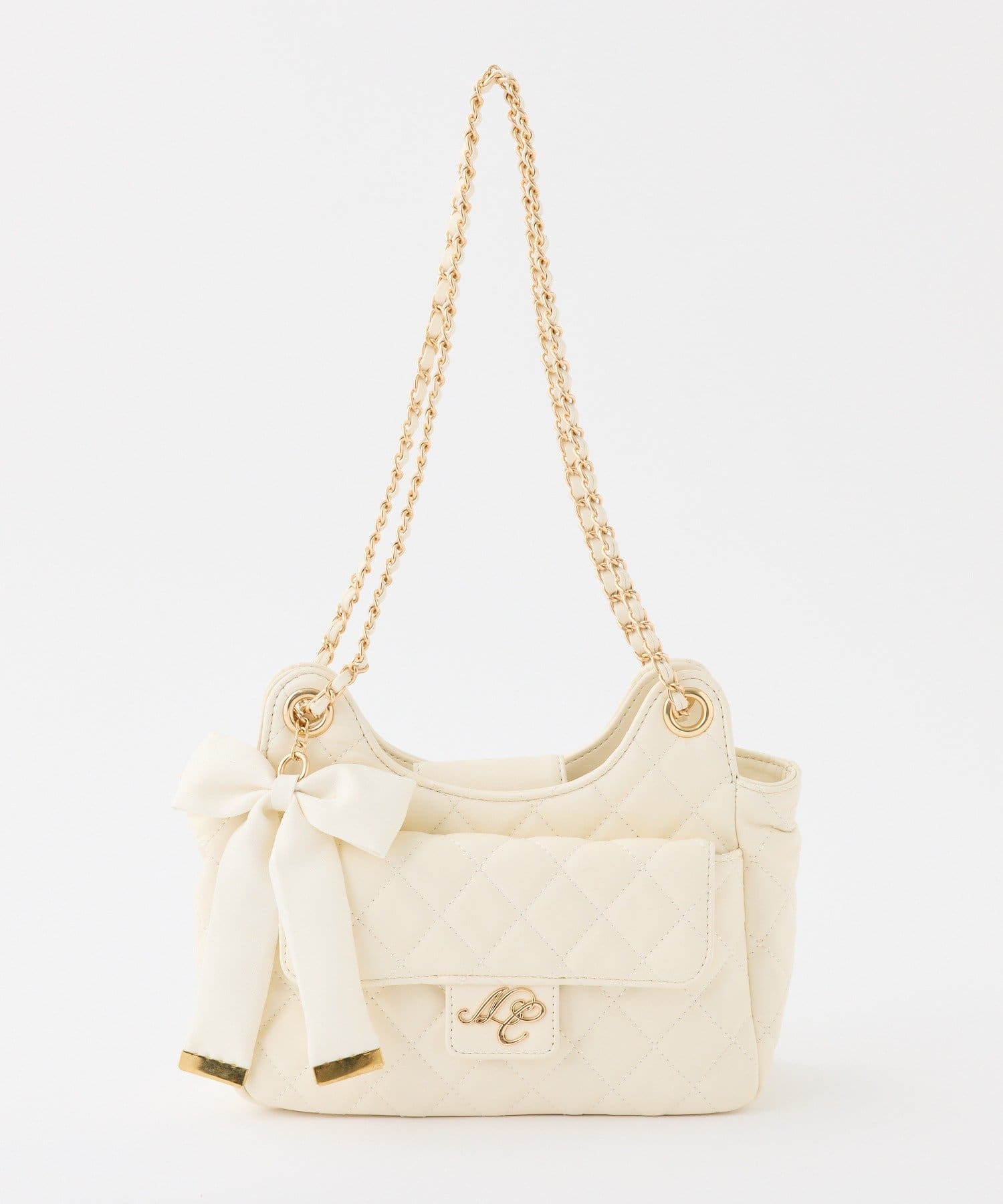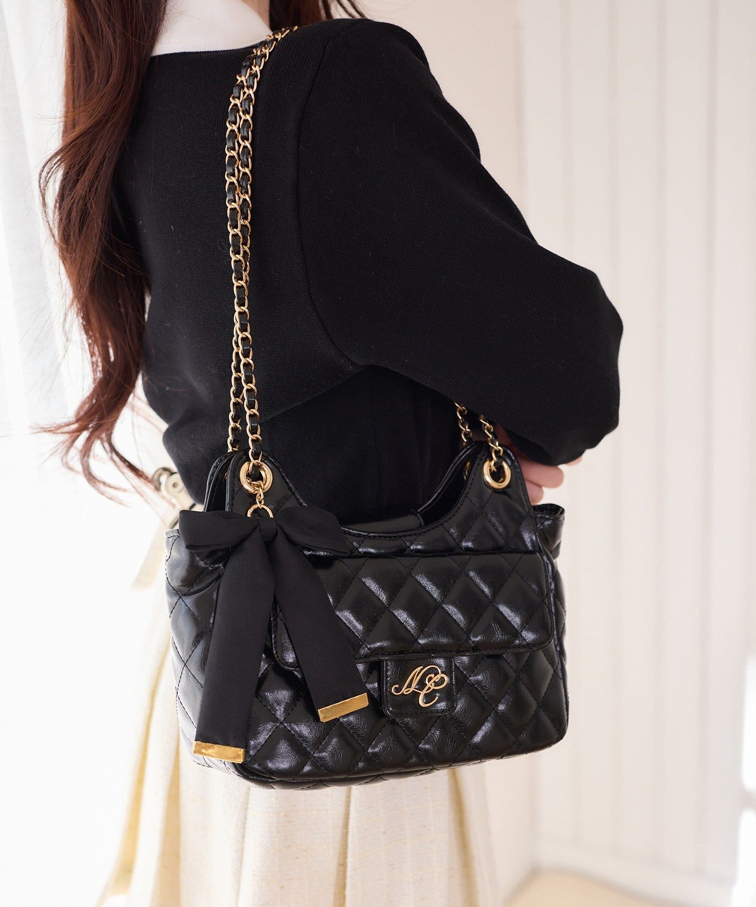 キルティングデザインと大きめリボンのチャームが目を惹く、チェーンショルダーミニバッグ。