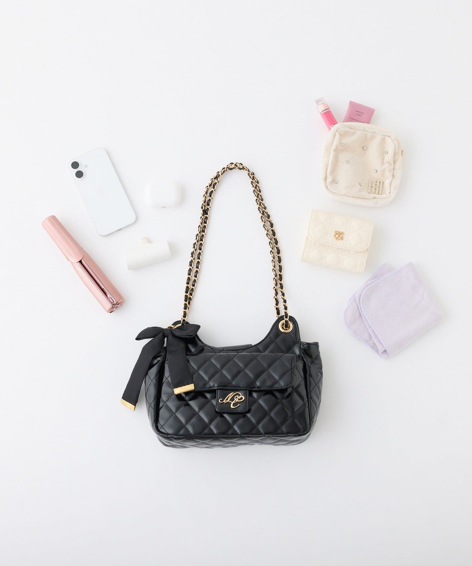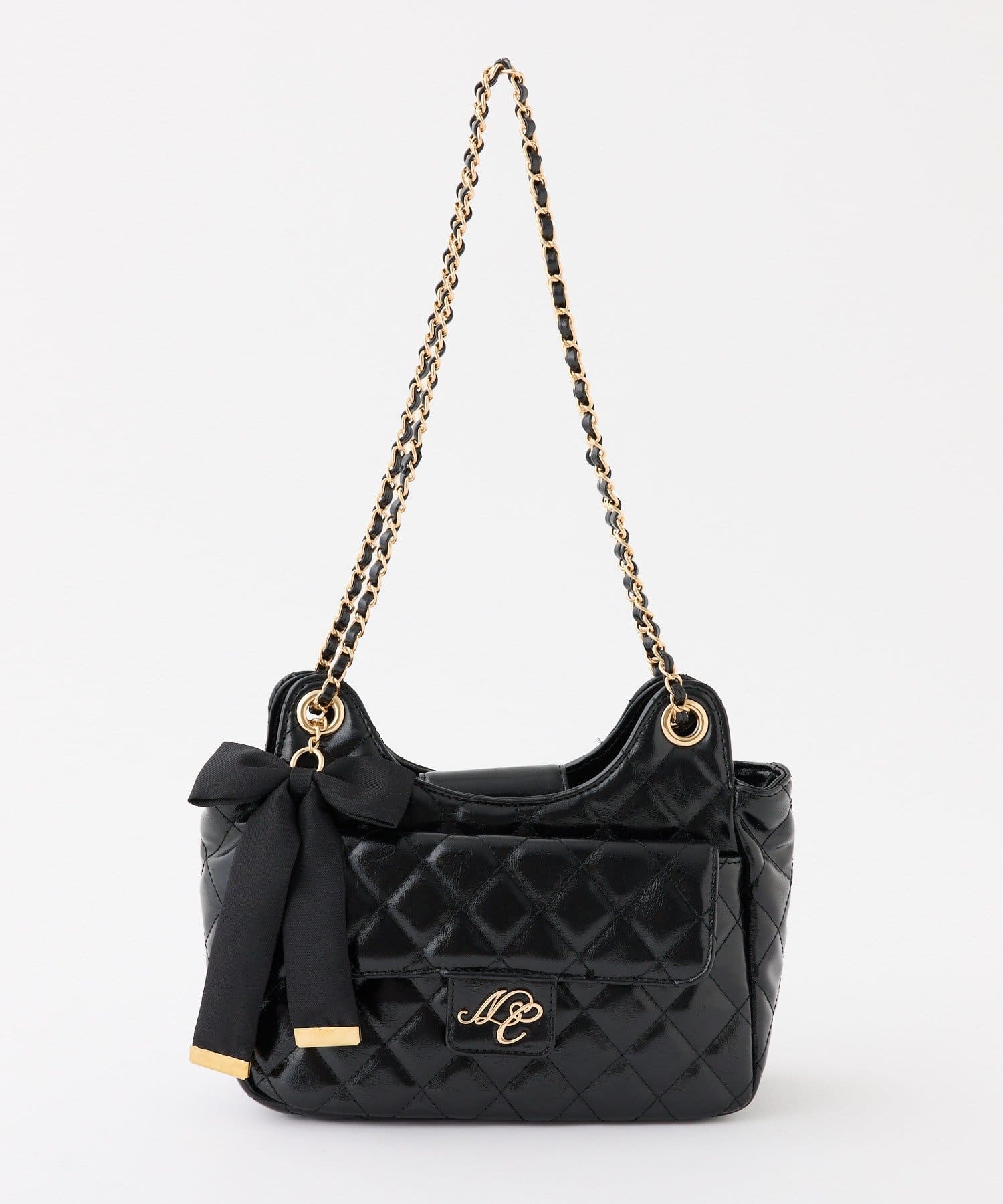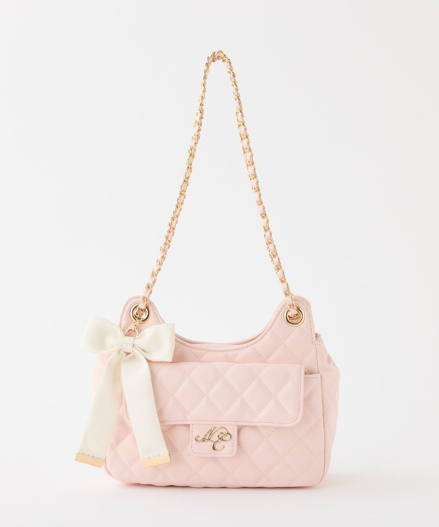 キルティングデザインと大きめリボンのチャームが目を惹く、チェーンショルダーミニバッグ。