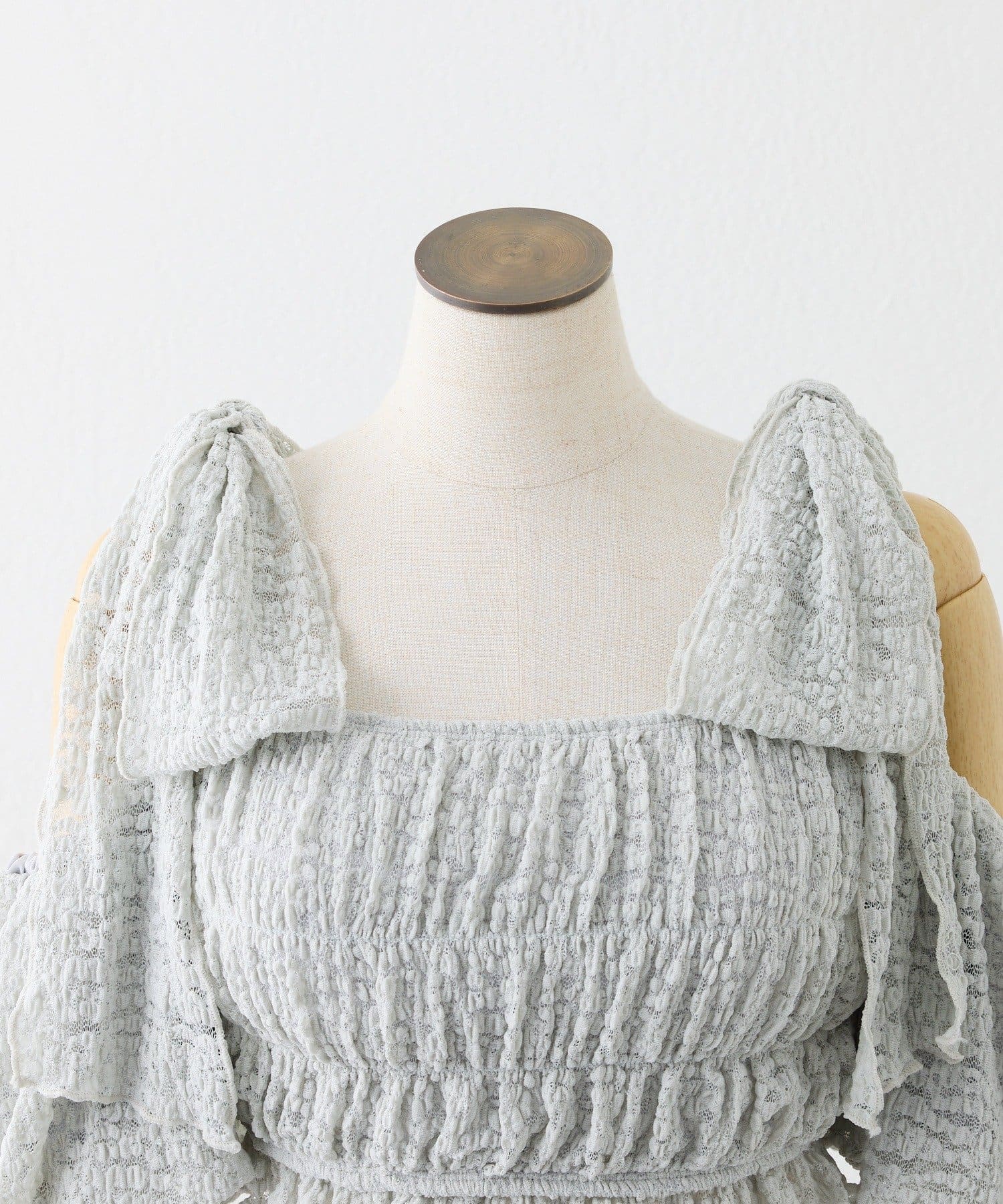 デコルテをきれいに見せるオフショル仕様に、肩のリボンで甘さをプラス。