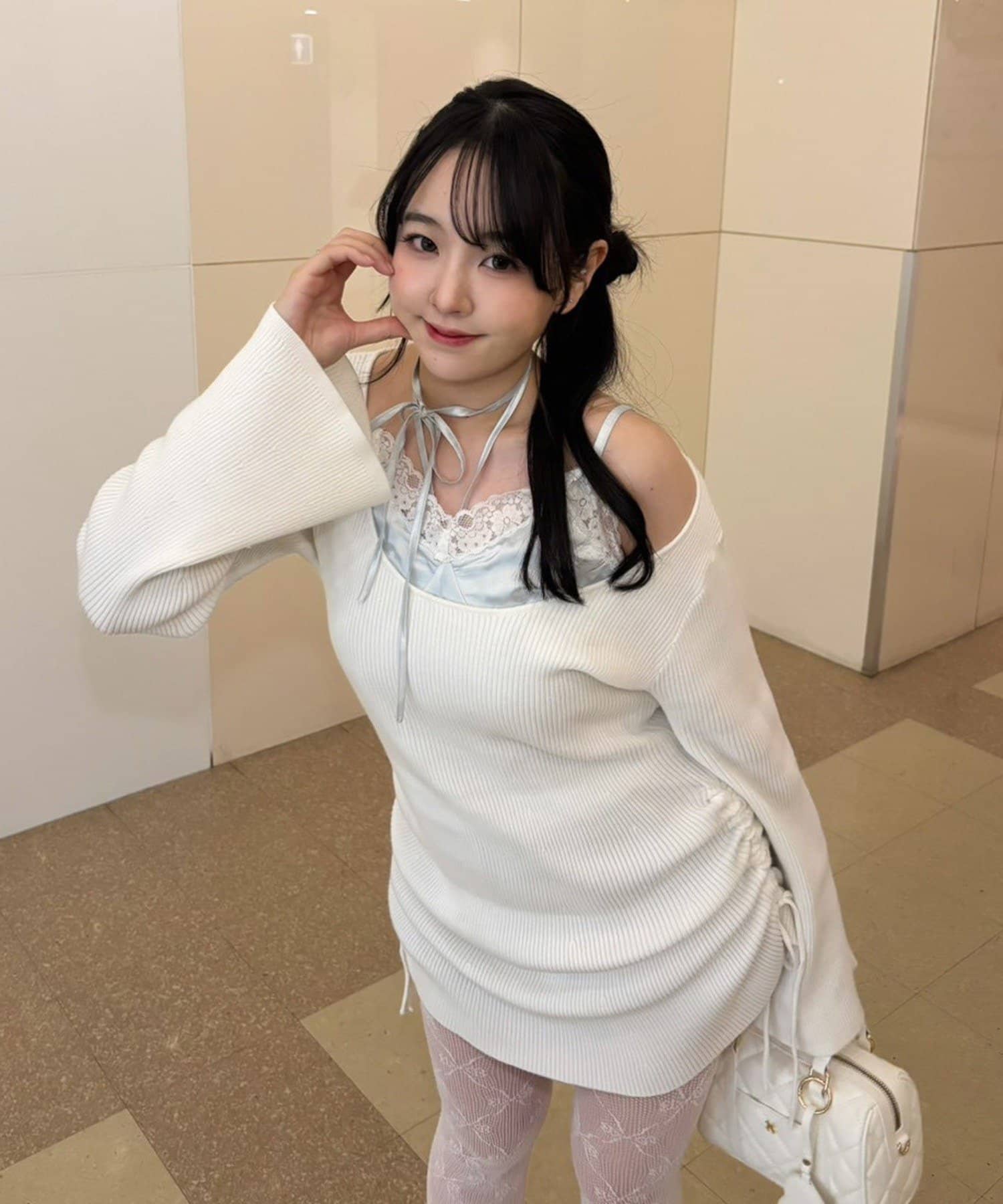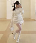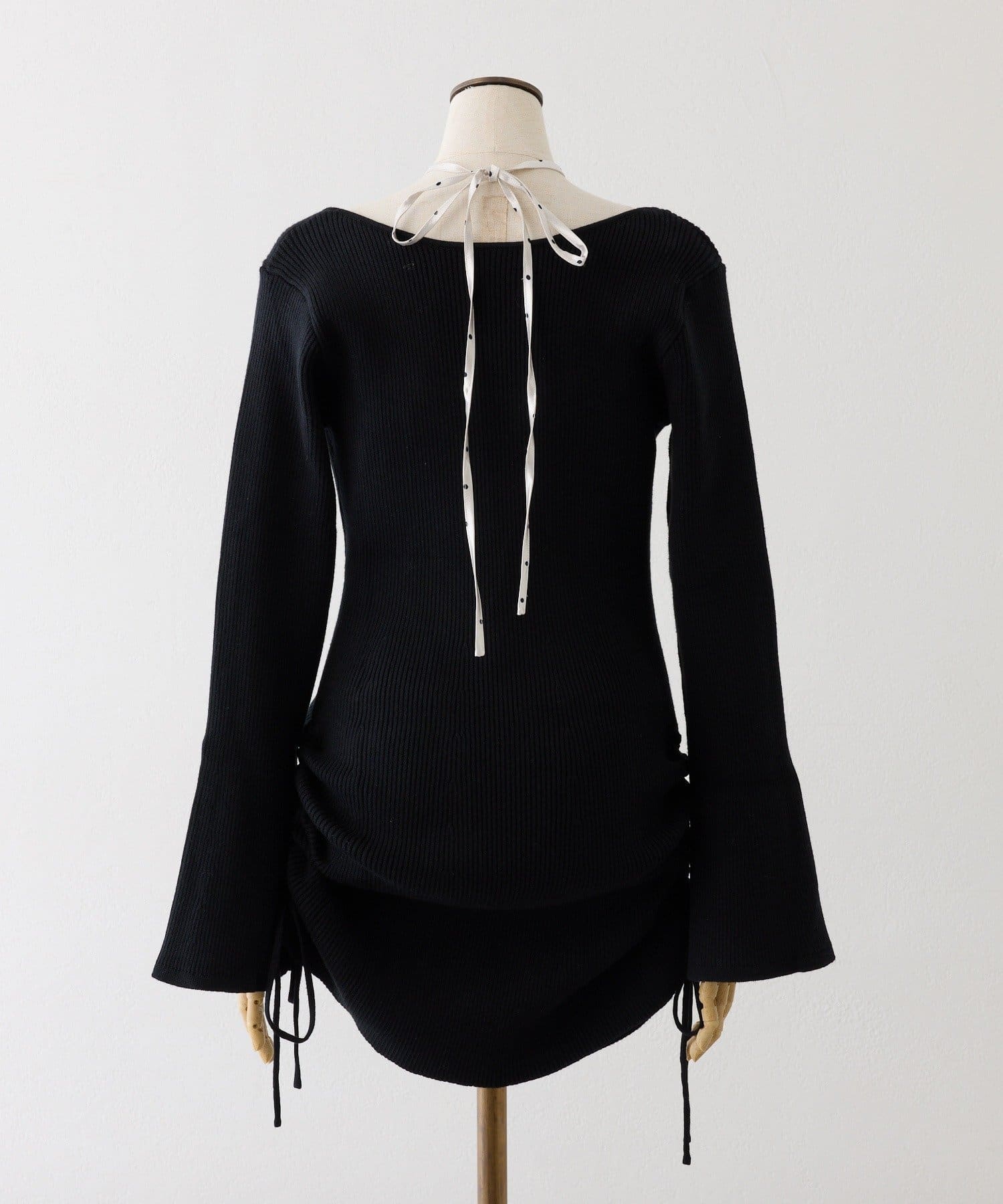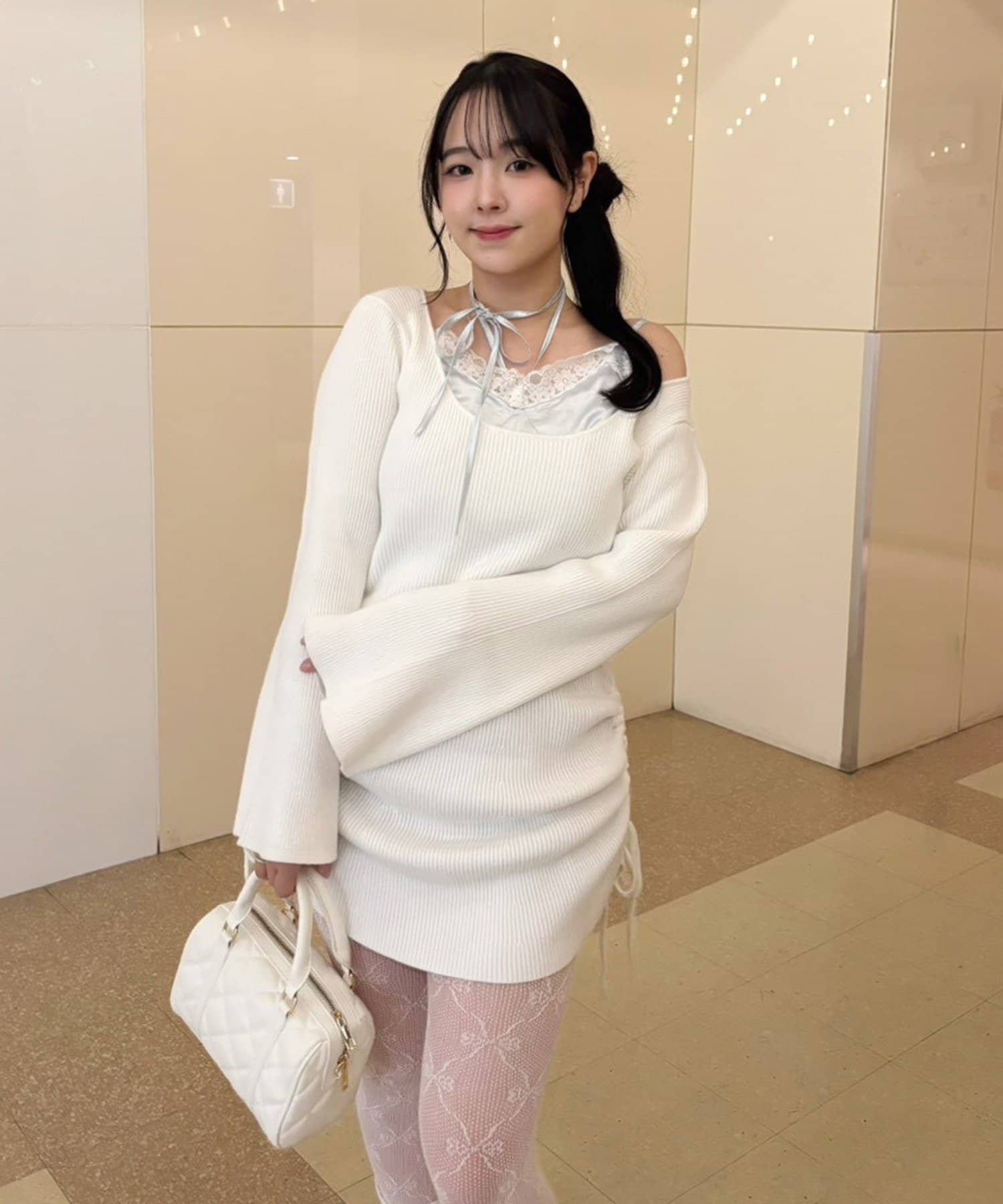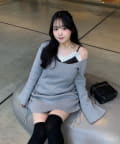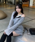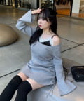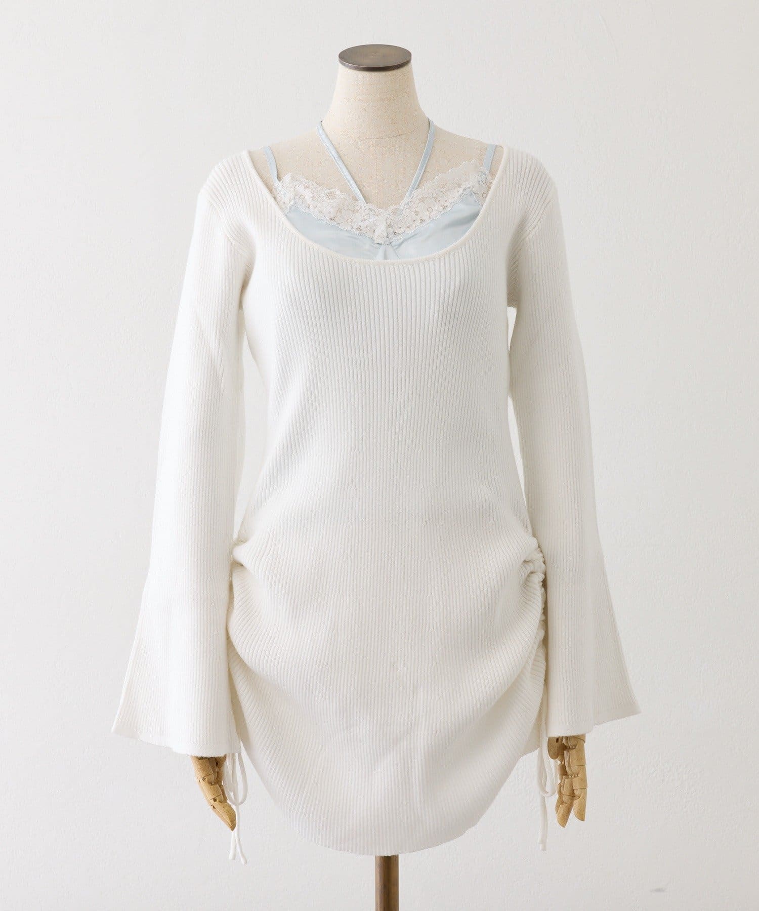 ホルターネック付きキャミソールと、サイドドロストデザインのニットミニワンピースのセットアイテム。
