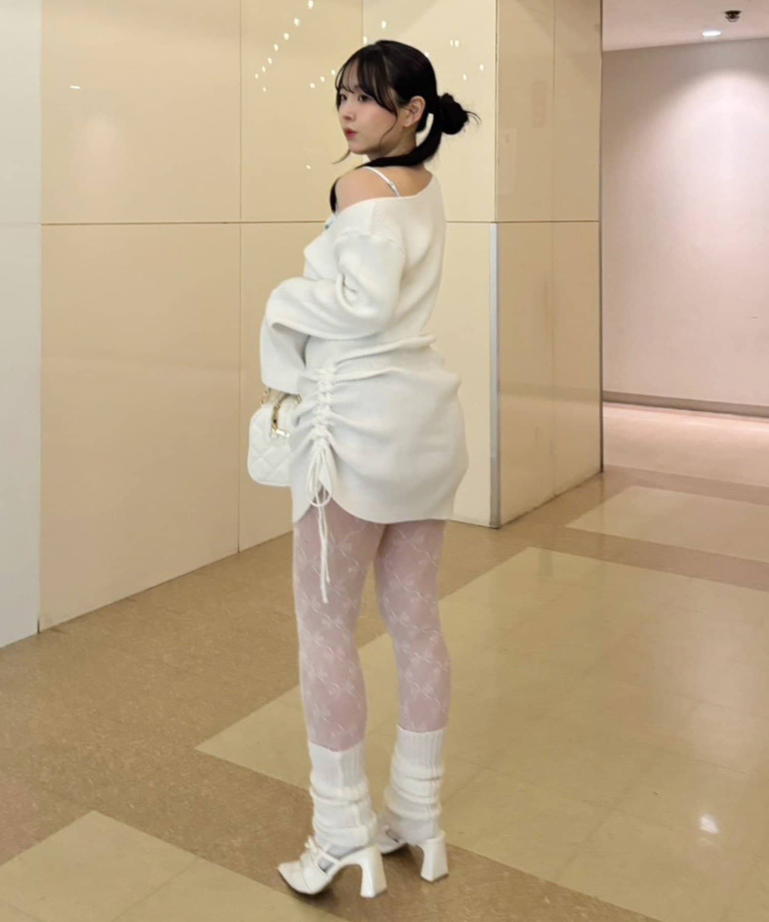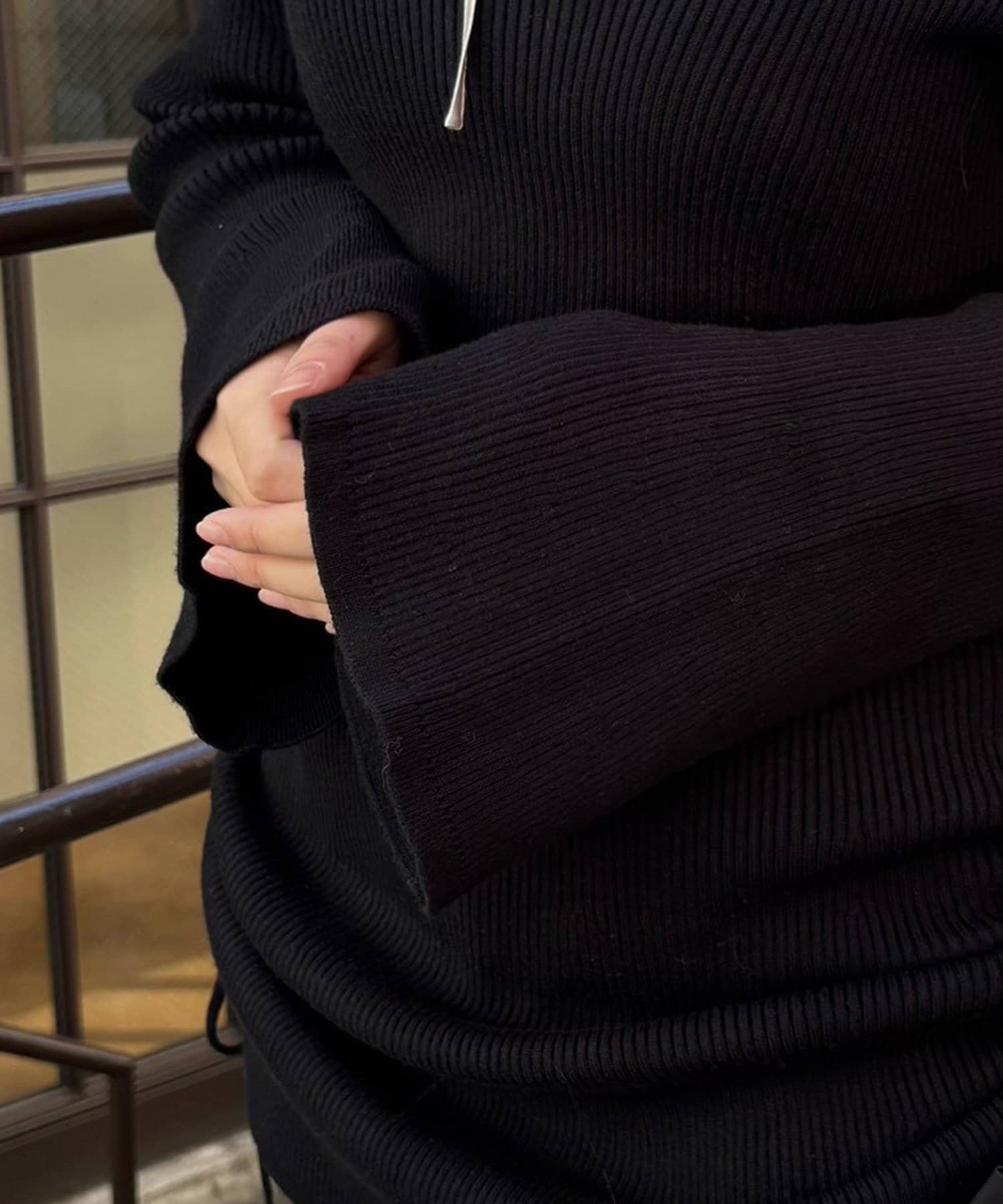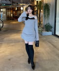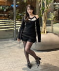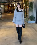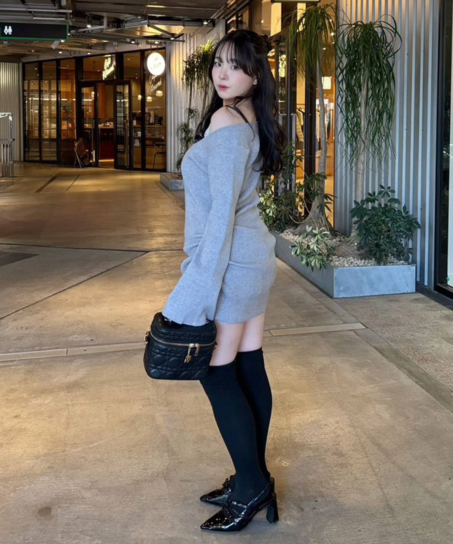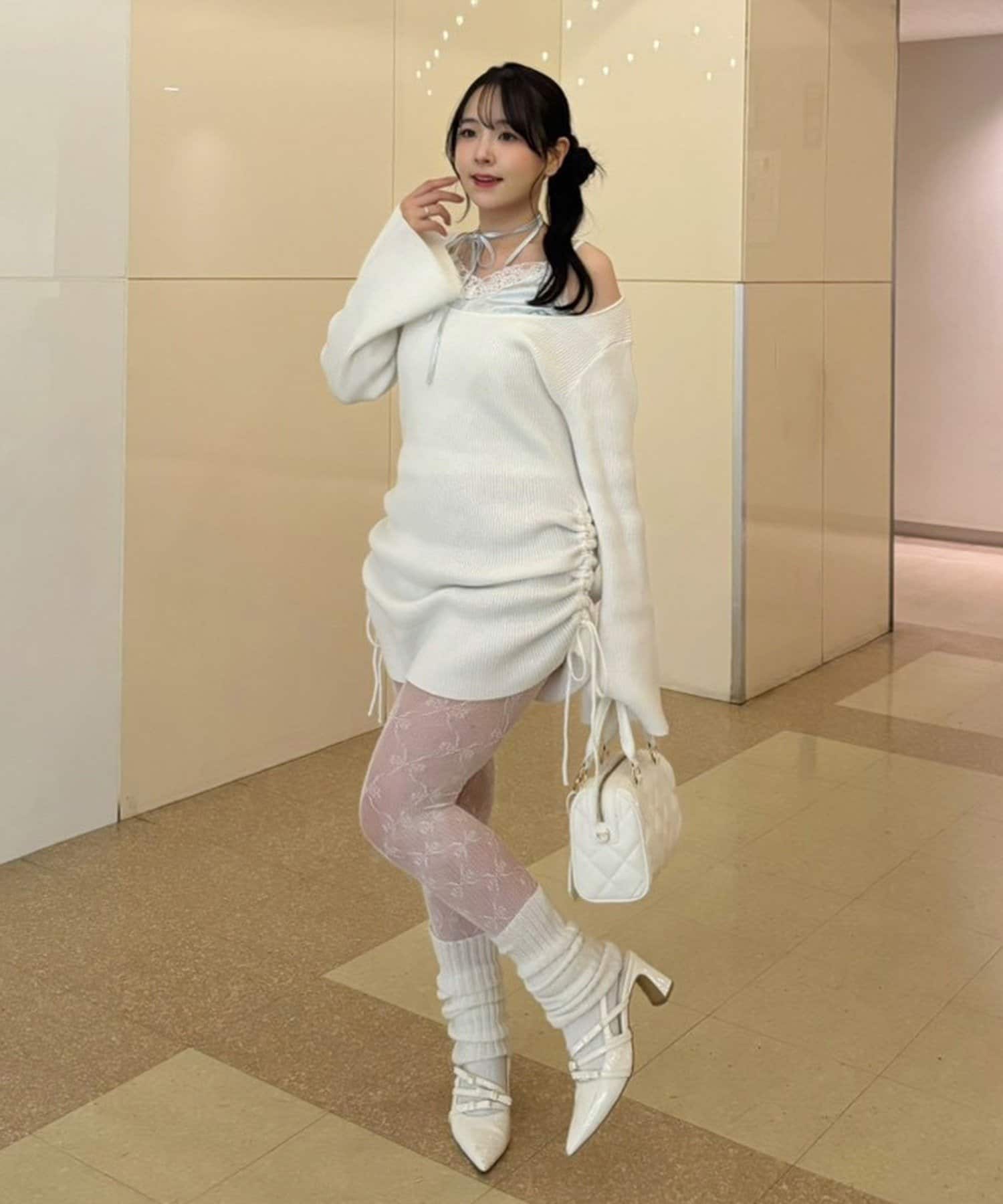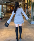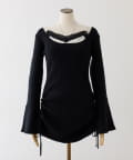 ホルターネック付きキャミソールと、サイドドロストデザインのニットミニワンピースのセットアイテム。