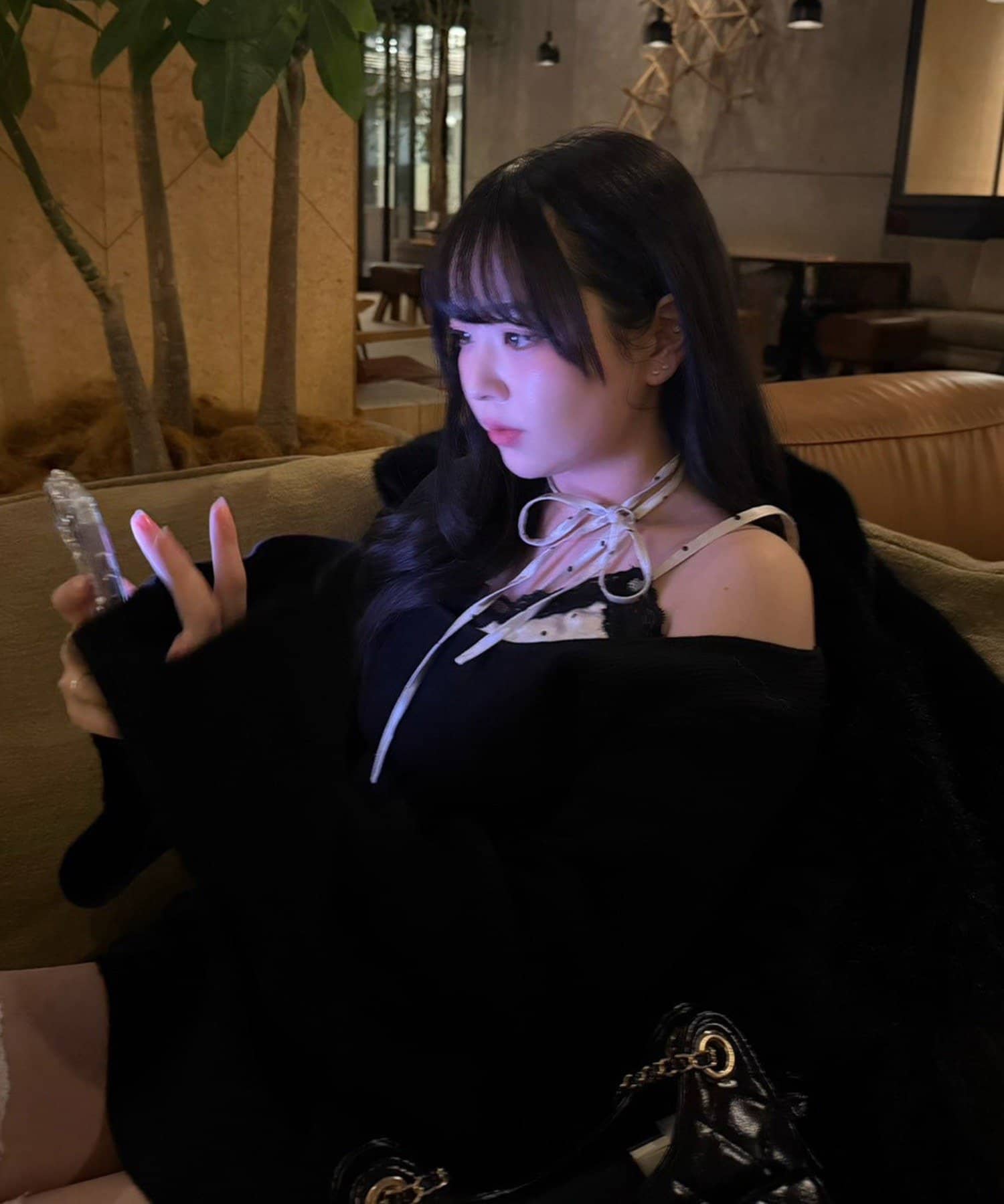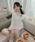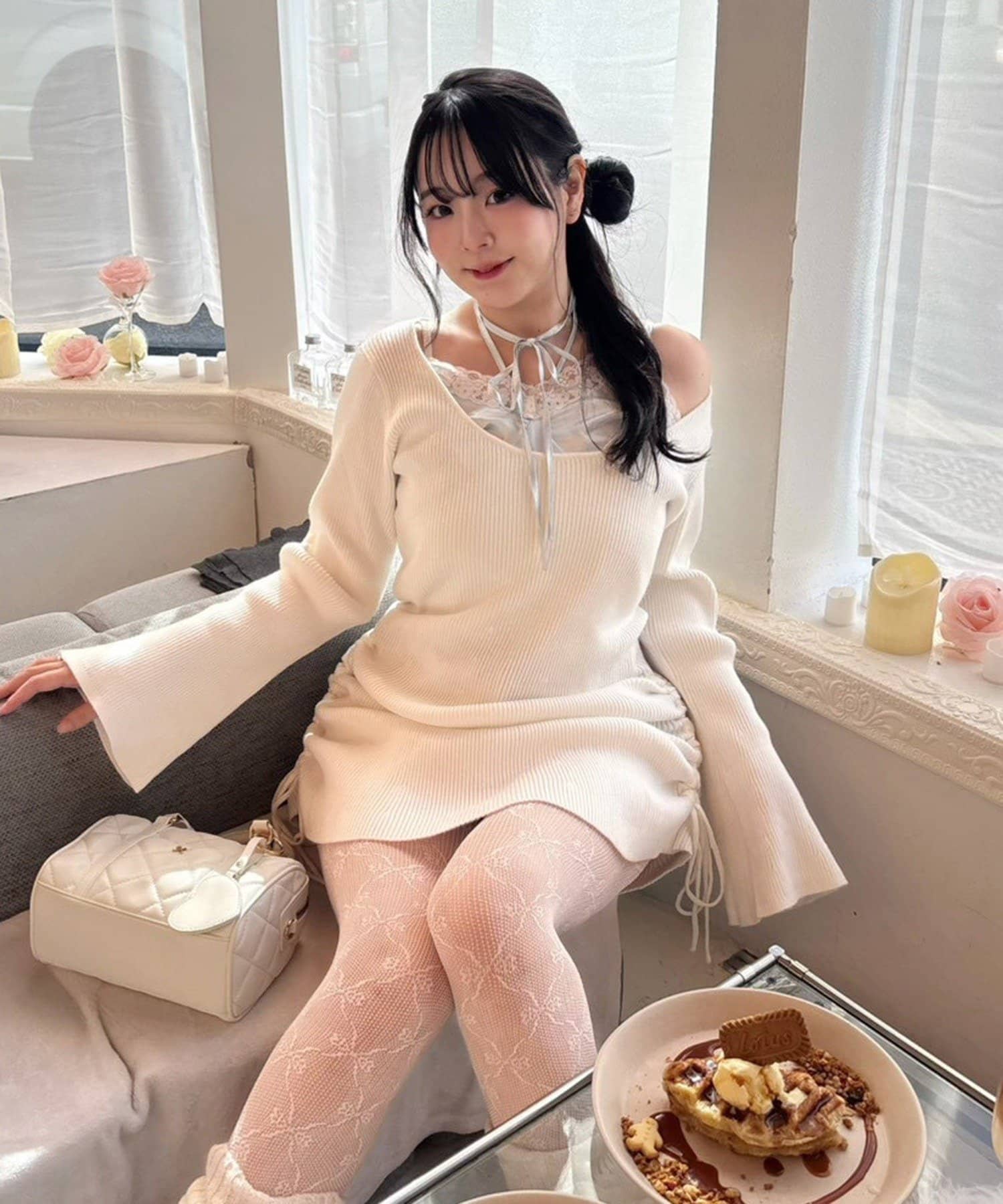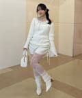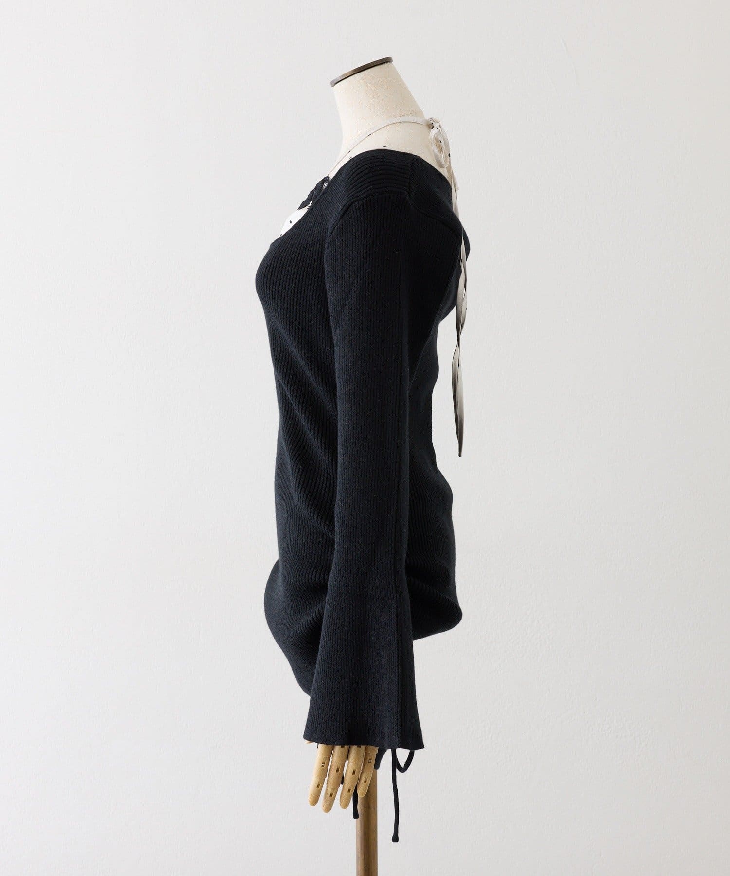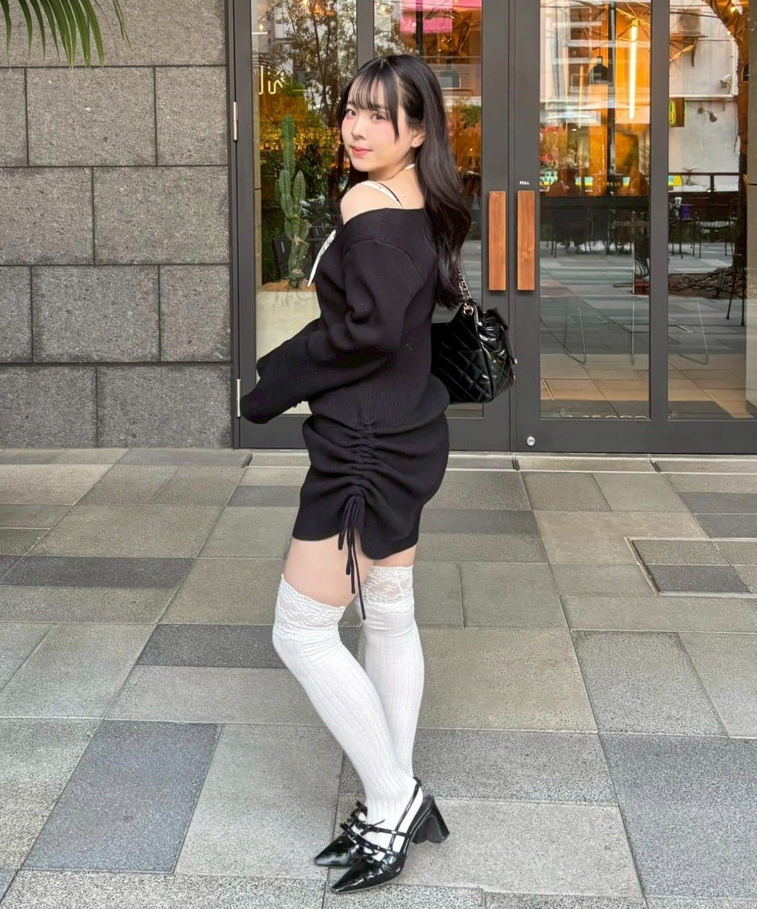 ホルターネック付きキャミソールと、サイドドロストデザインのニットミニワンピースのセットアイテム。