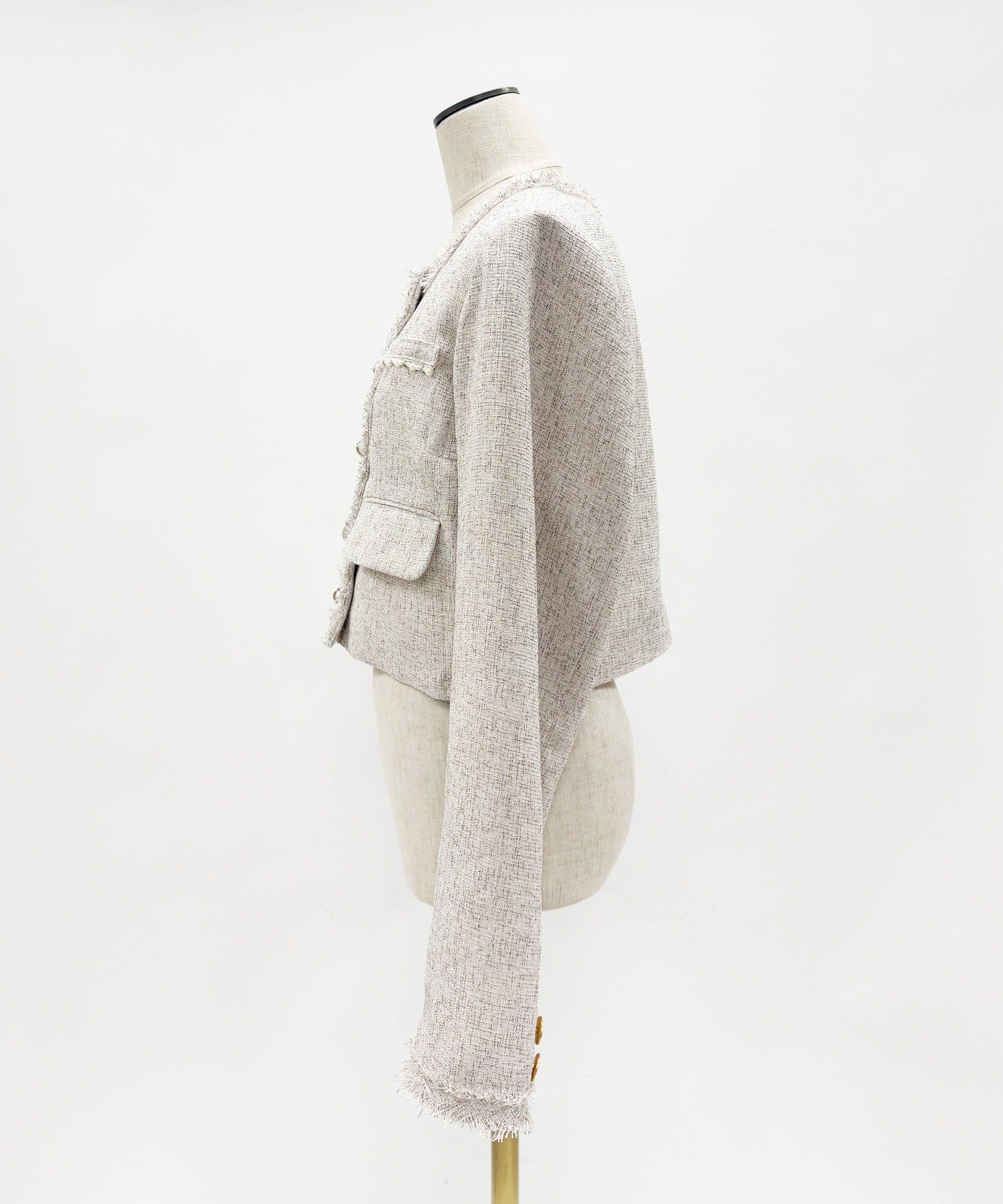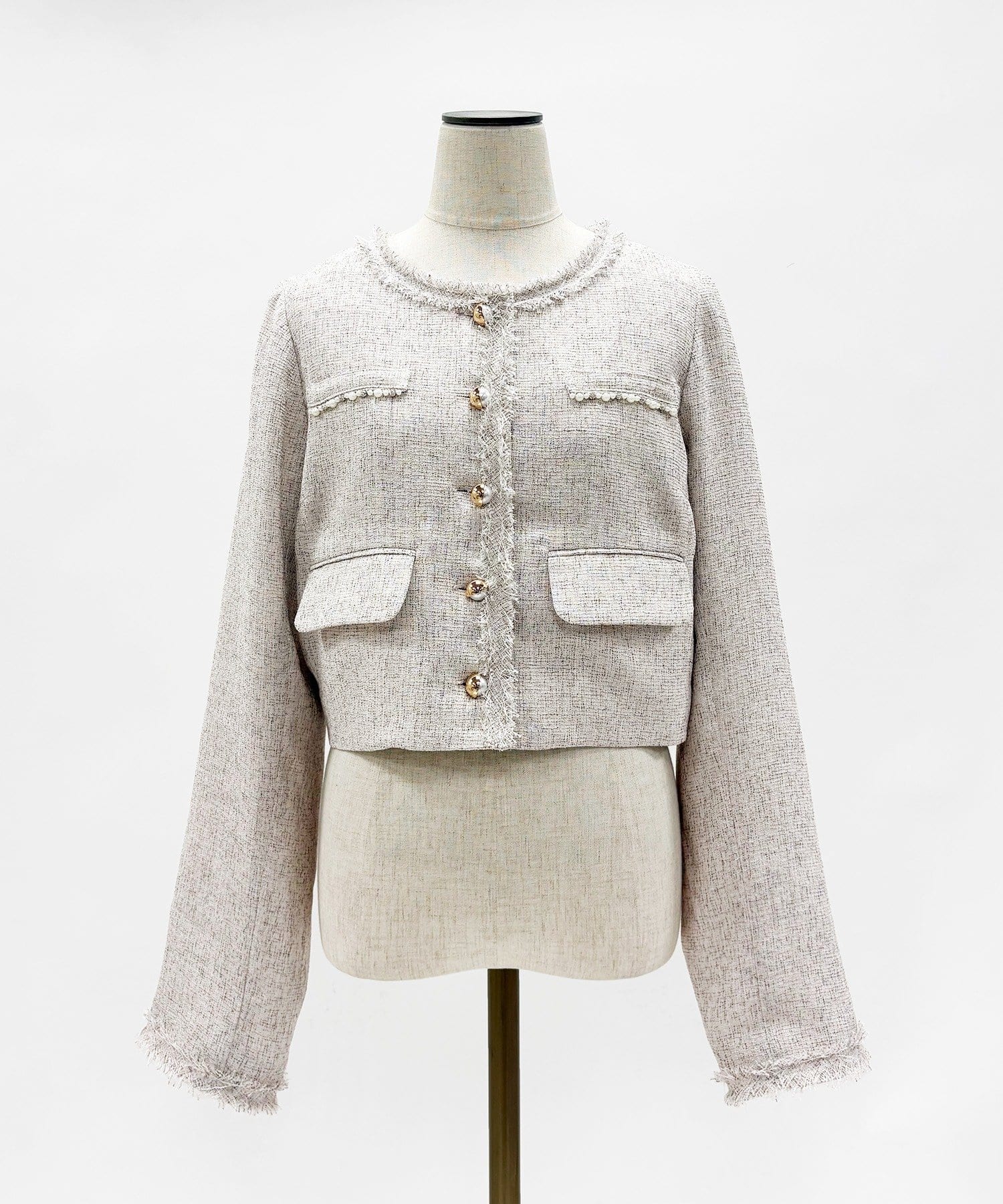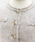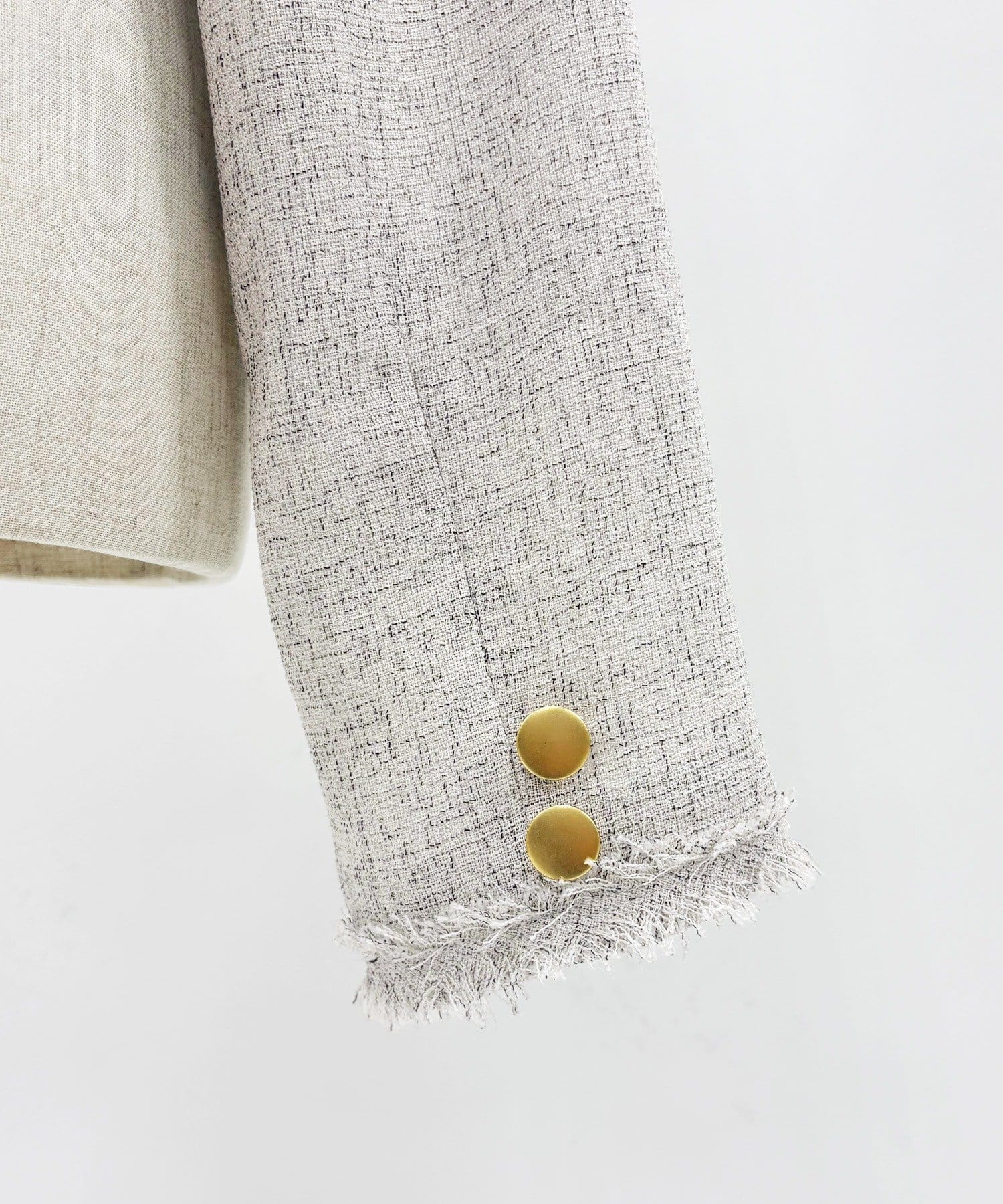オーロラ×ゴールドの珍しいボタンが目を惹く、ノーカラーツイードジャケット。